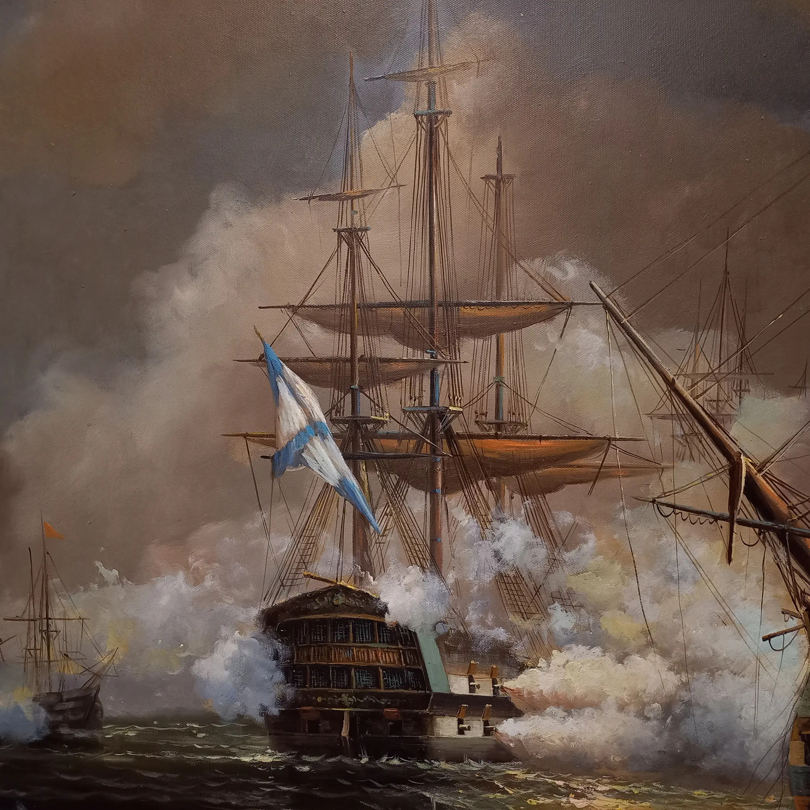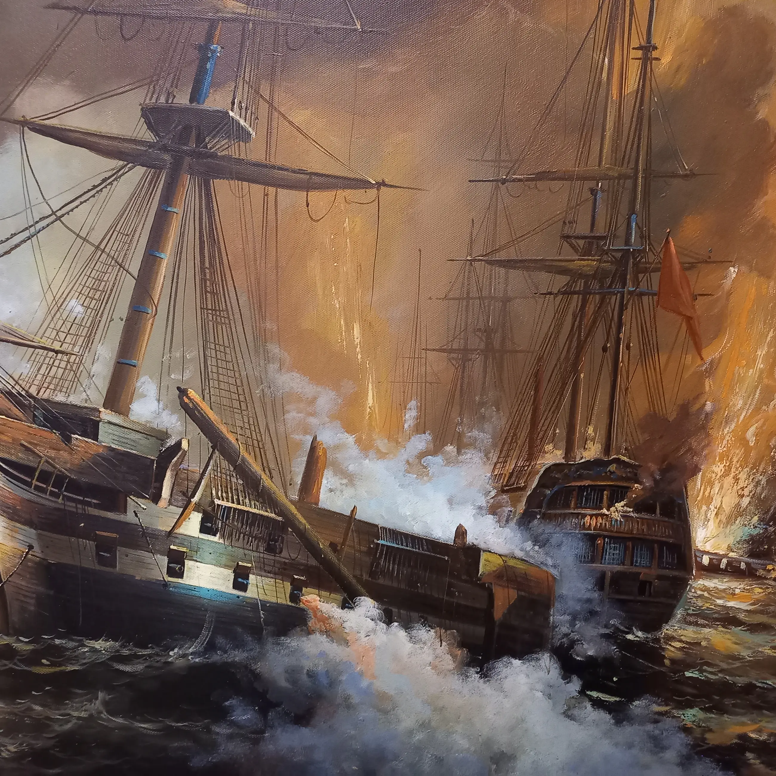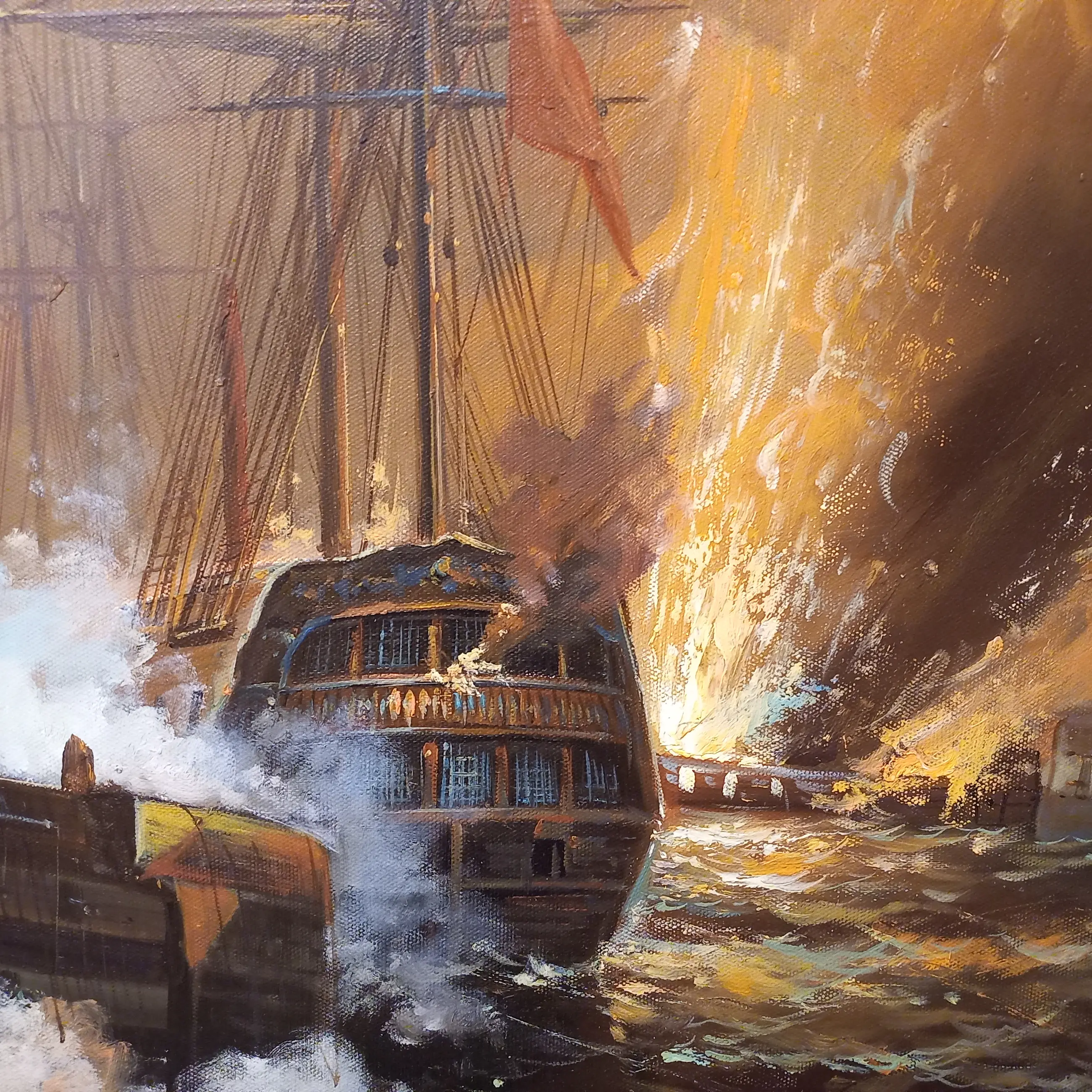 De scène is vol beweging en drama: kolkende golven, dichte rookwolken en vurige explosies geven het geheel een krachtige en meeslepende uitstraling. De kunstenaar heeft het geweld en de dynamiek van de strijd overtuigend weten vast te leggen, met een fraai spel van licht en donker dat zorgt voor extra diepte.