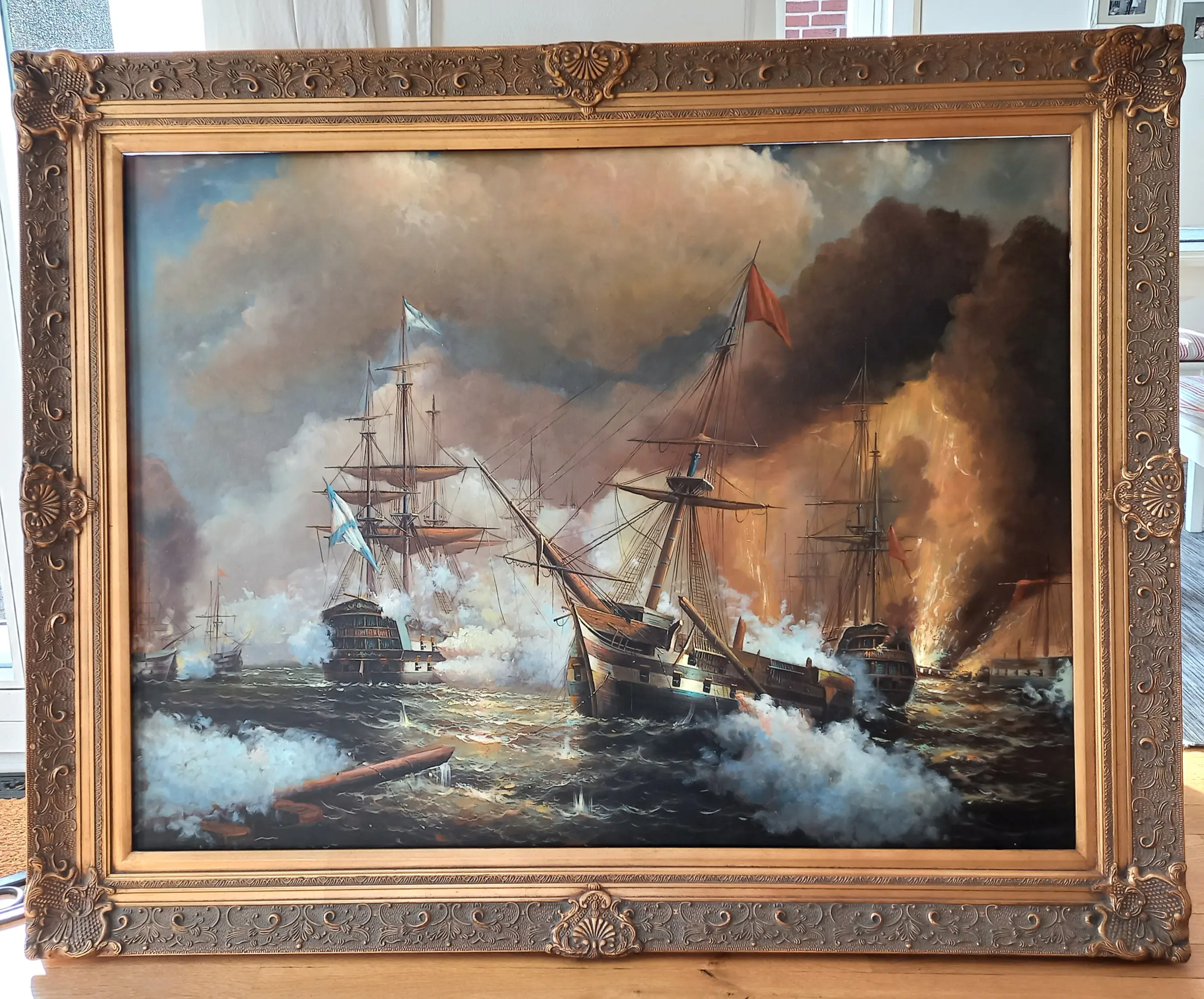 Indrukwekkend en monumentaal maritiem schilderij met een spectaculaire voorstelling van een hevige zeeslag tussen historische zeilschepen. Met een breedte van circa 150 cm is dit een groot en dominant werk dat direct de aandacht trekt.