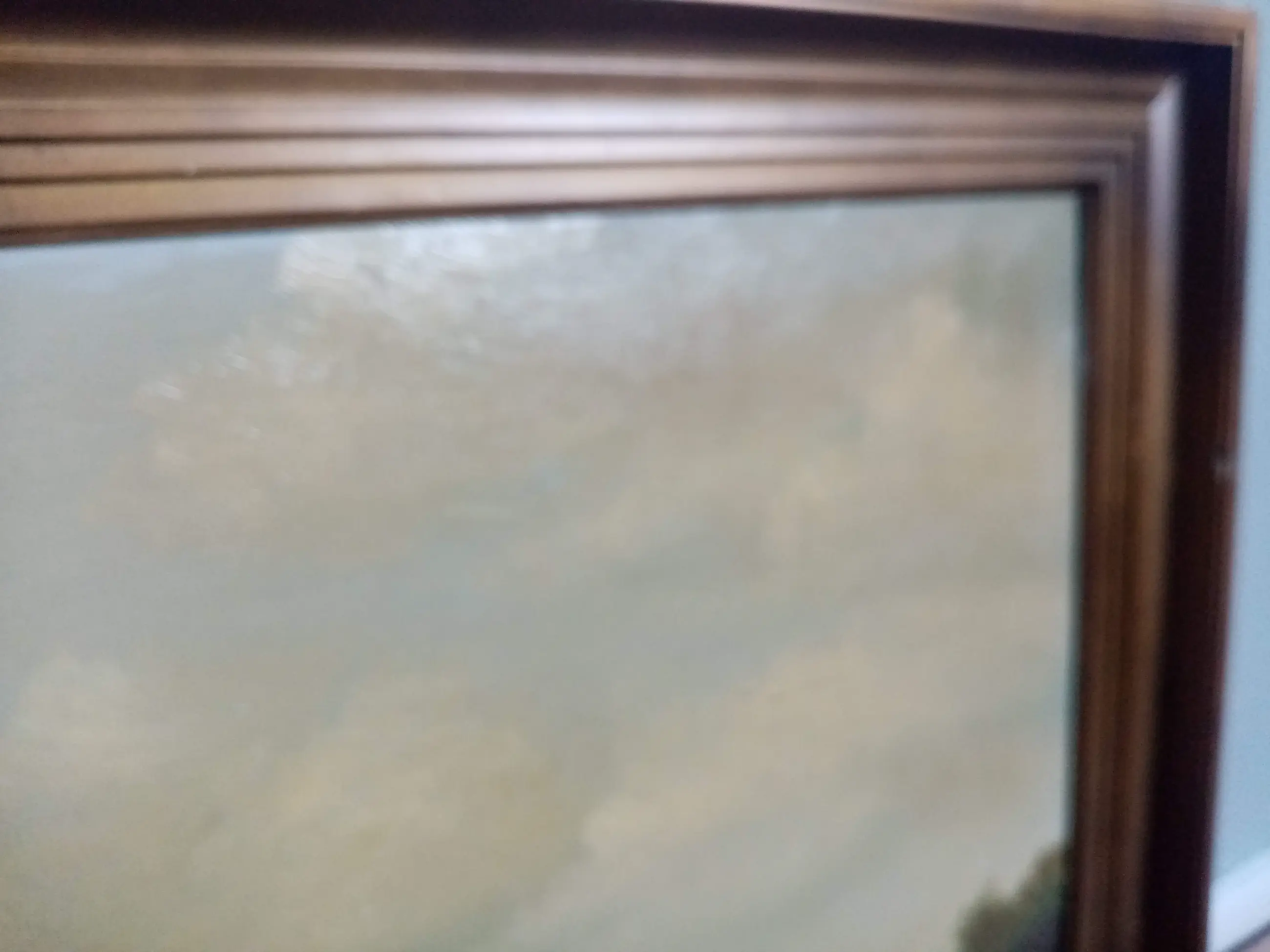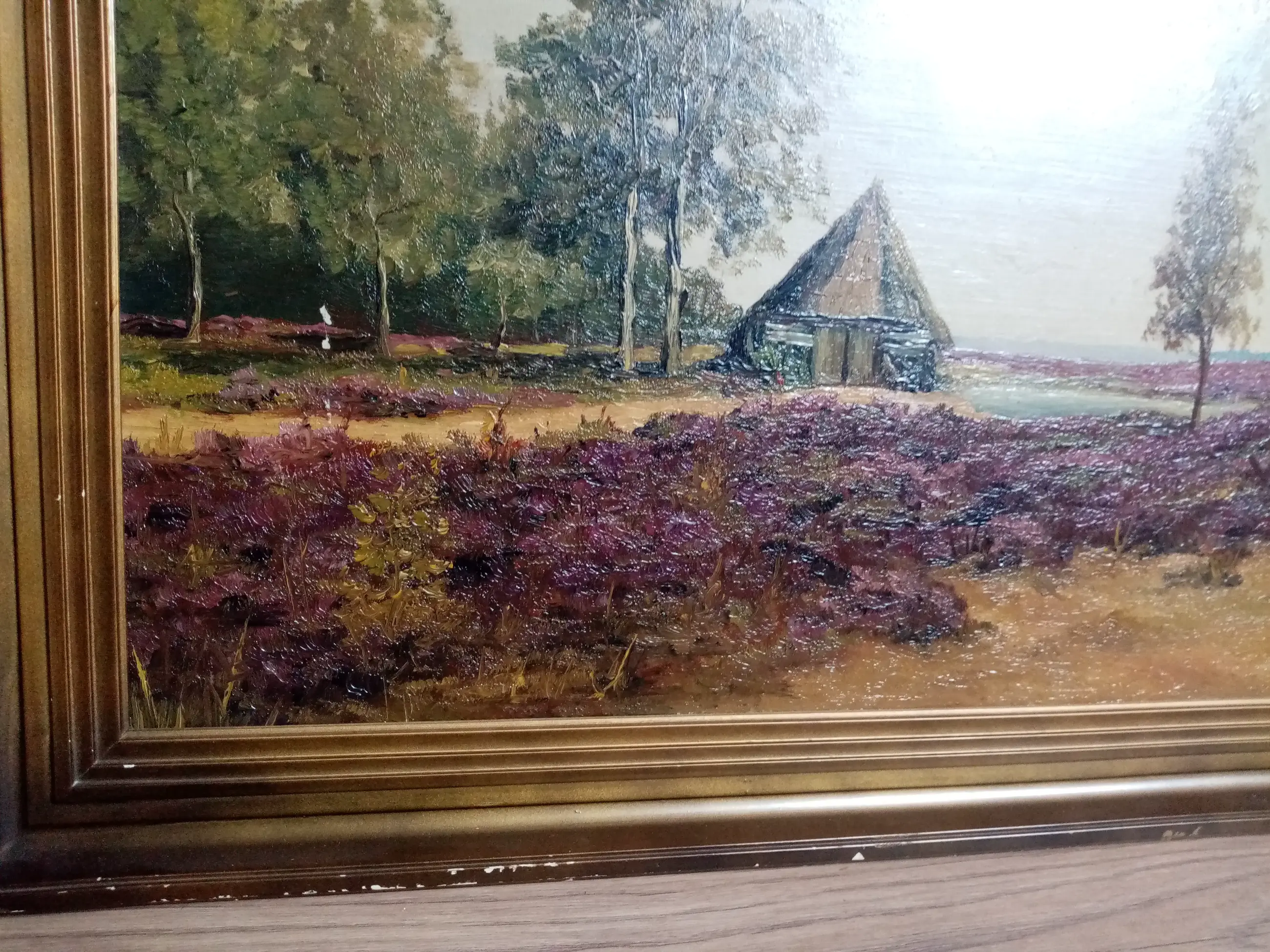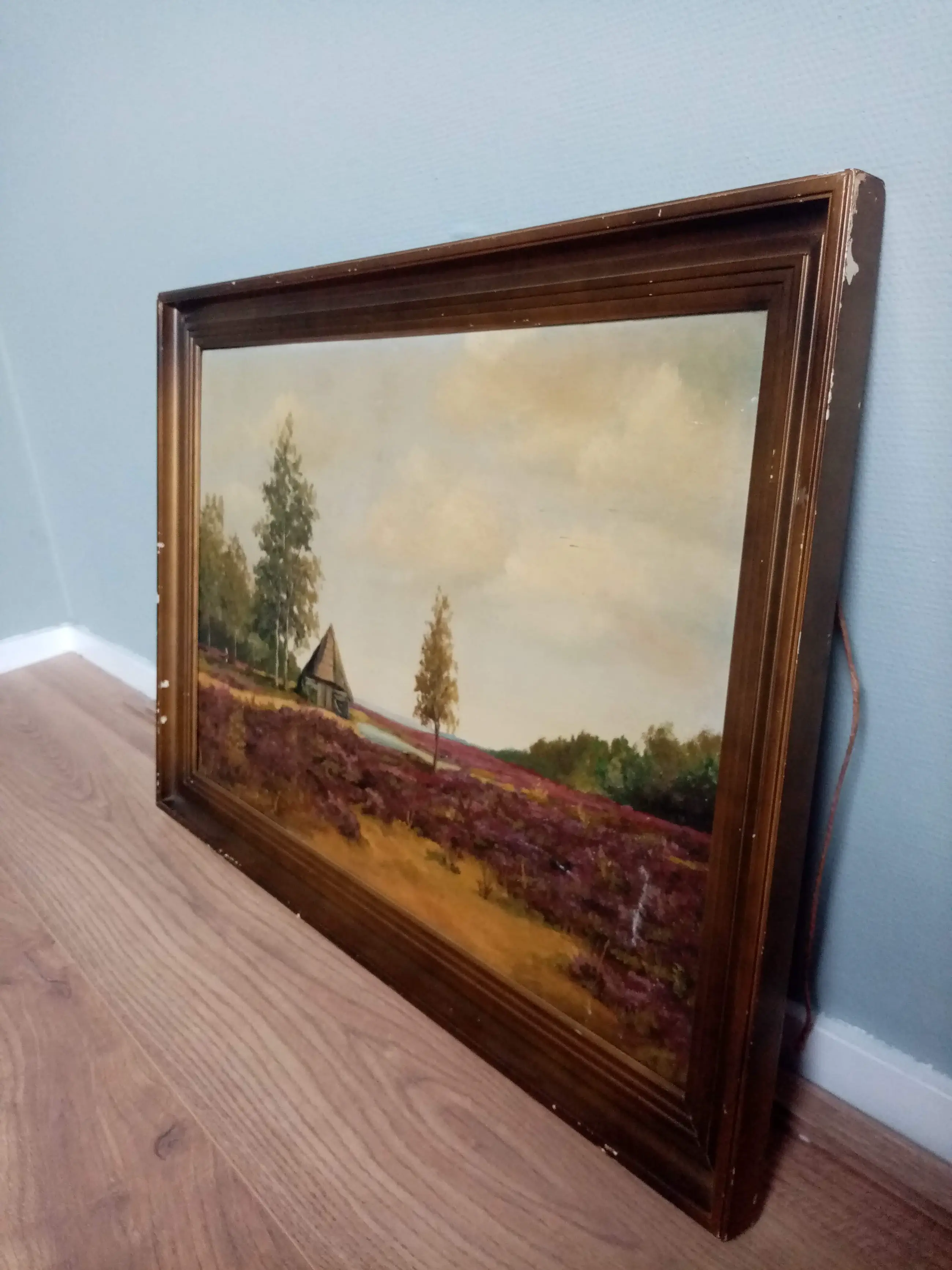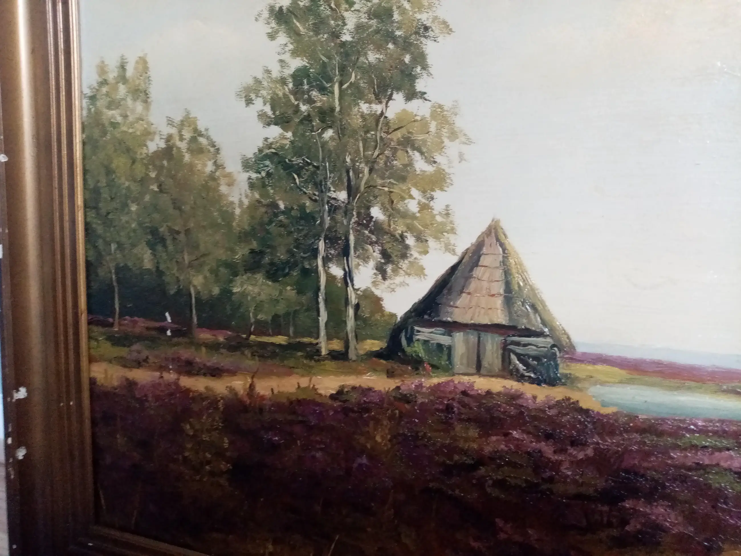 Mooi olieverf schilderij van een landschap met bomen en een hutje op de hei.