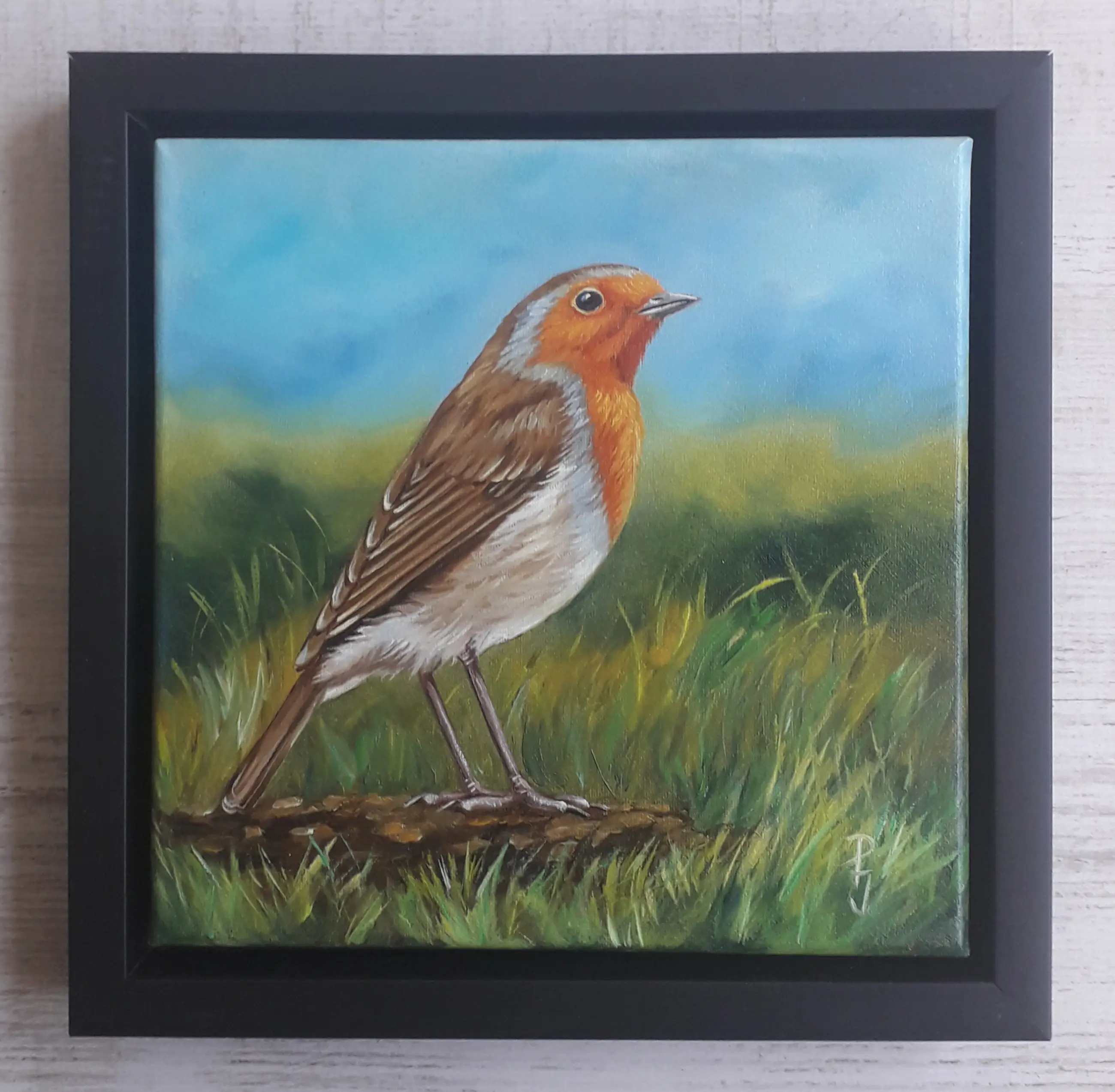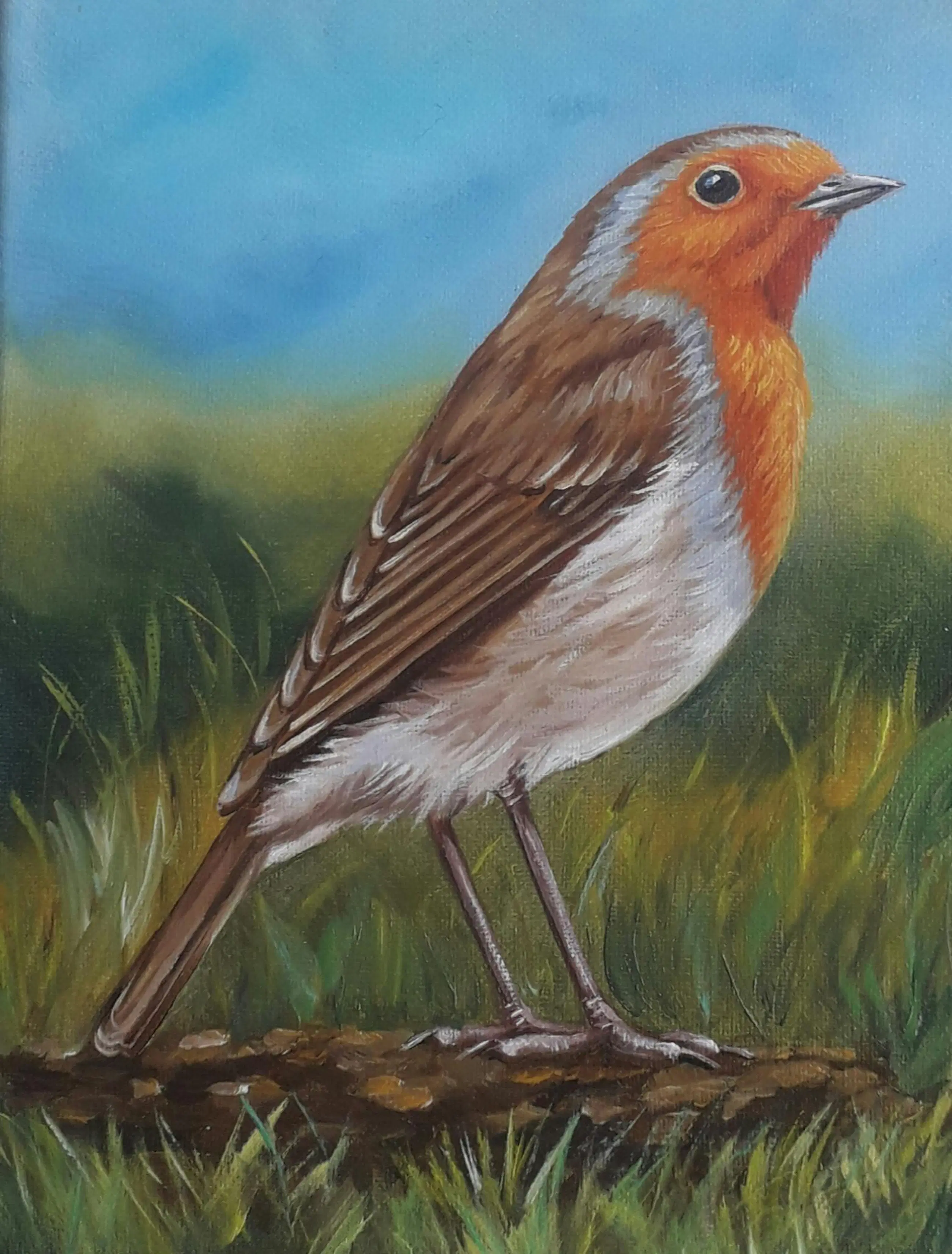 Een mooi roodborstje zit op een zonnige dag in het gras.