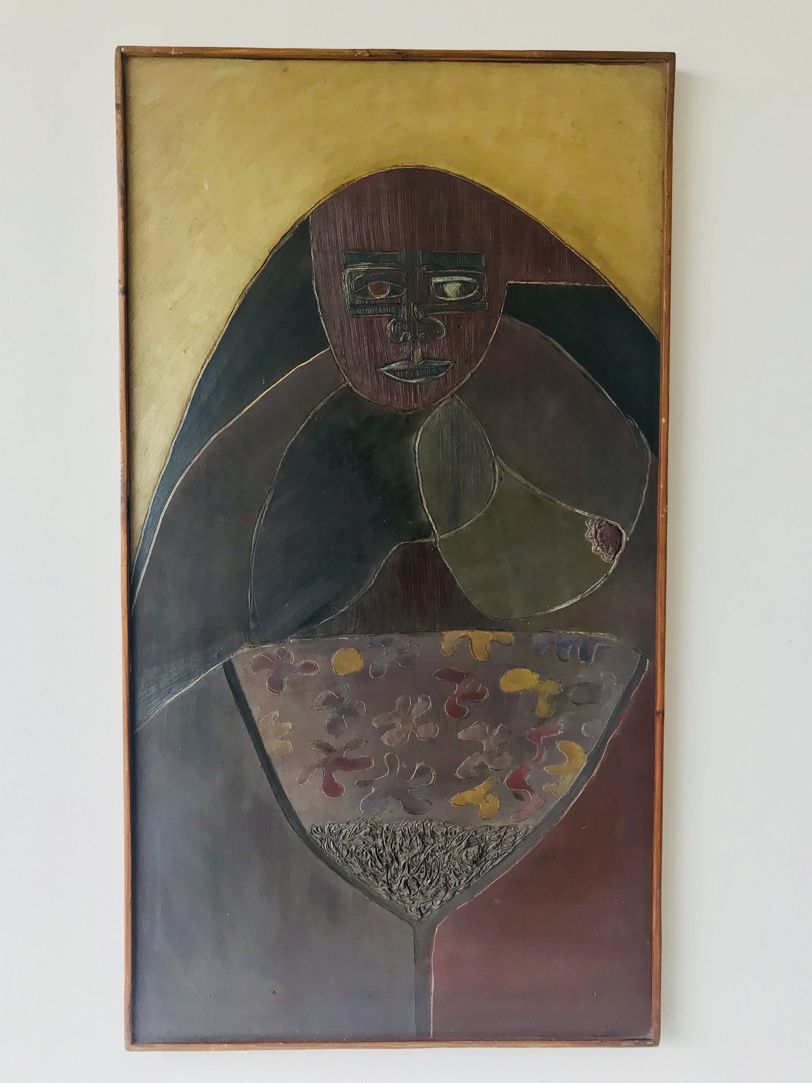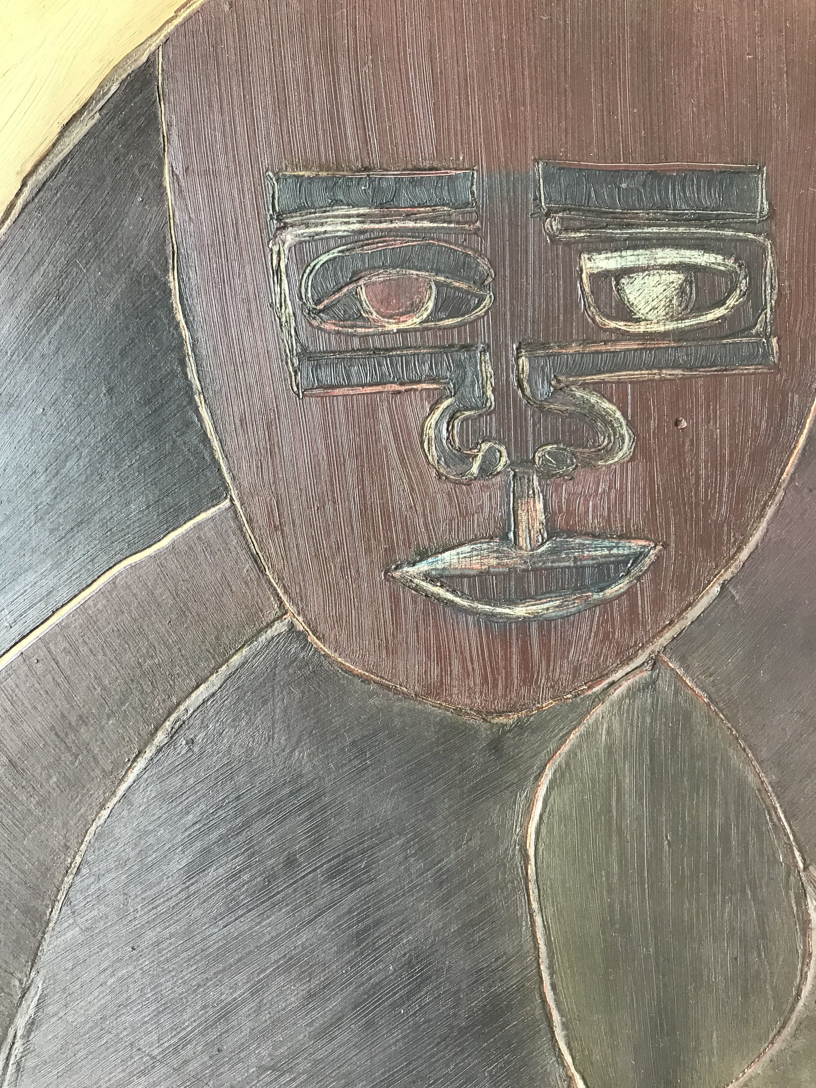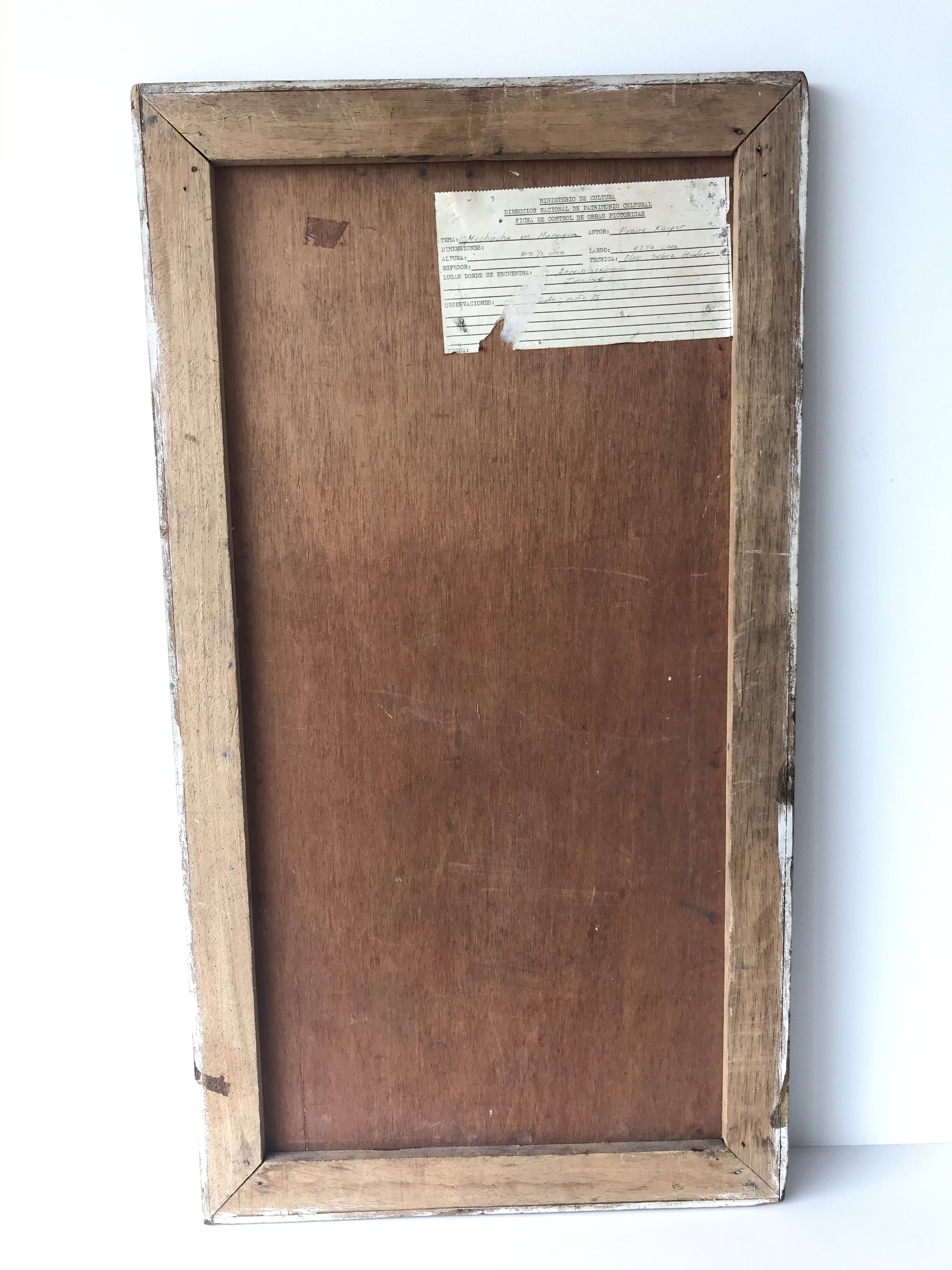 Verso een etiket van het ministerie van cultuur van waarschijnlijk Nicaraqua (gezien de titel van het werk) met onder andere de naam van de kunstenaar, datum en titel.