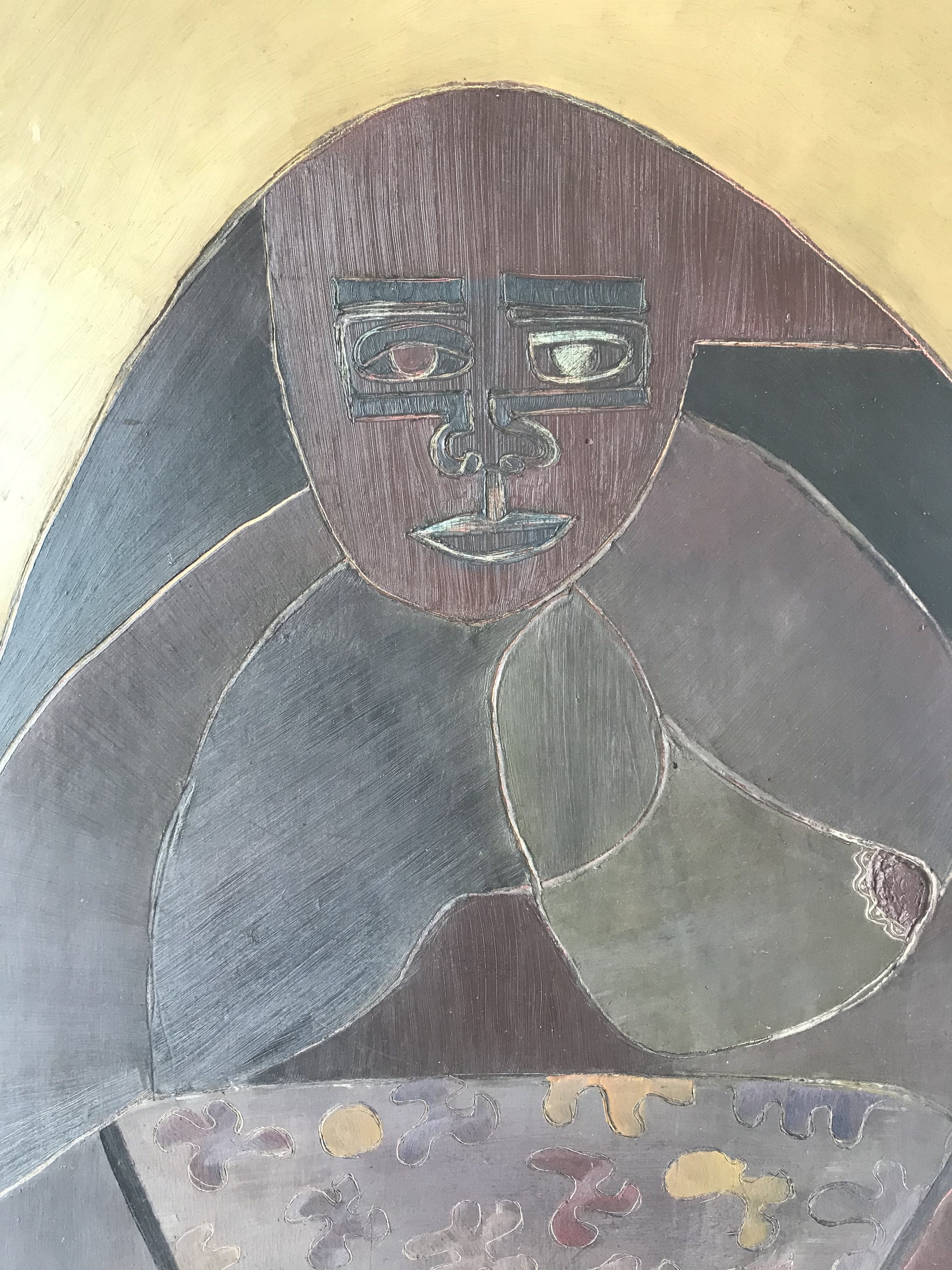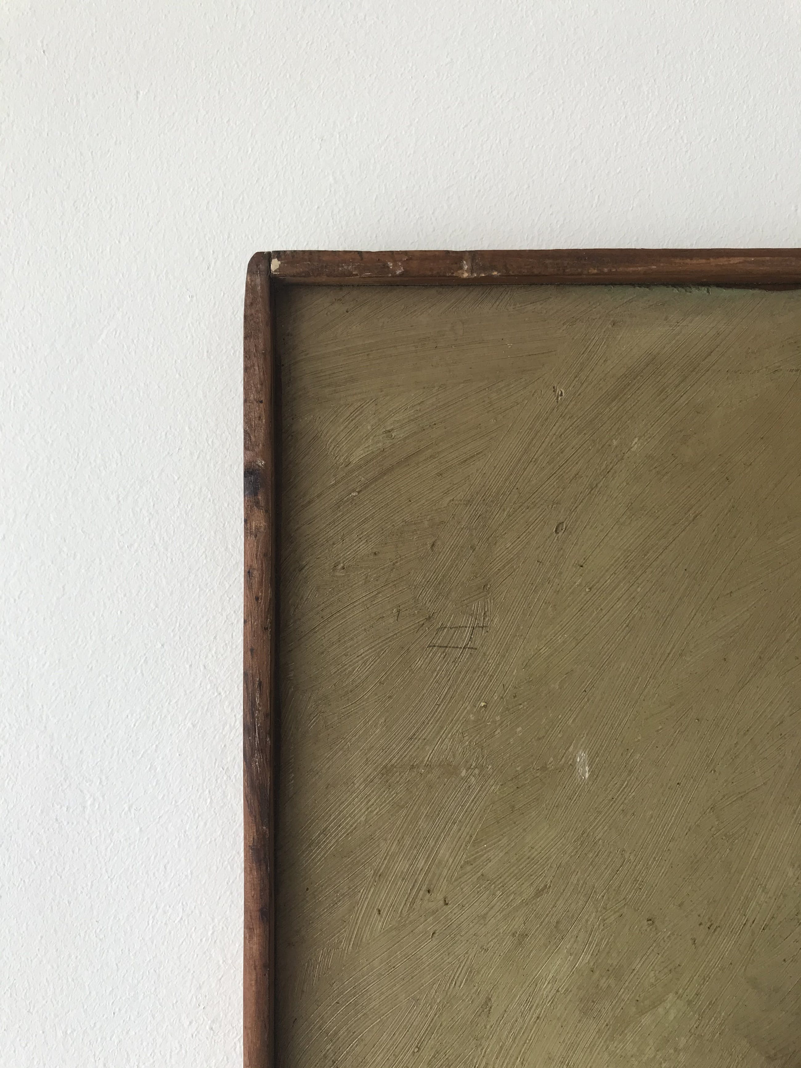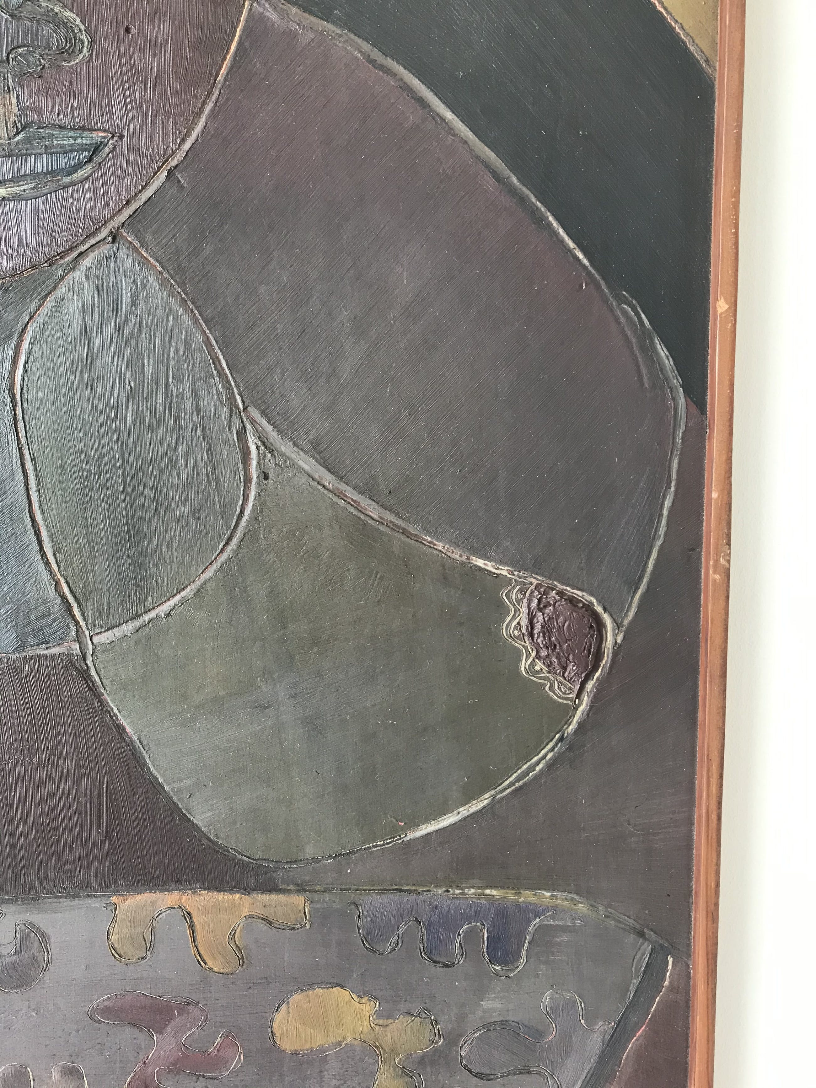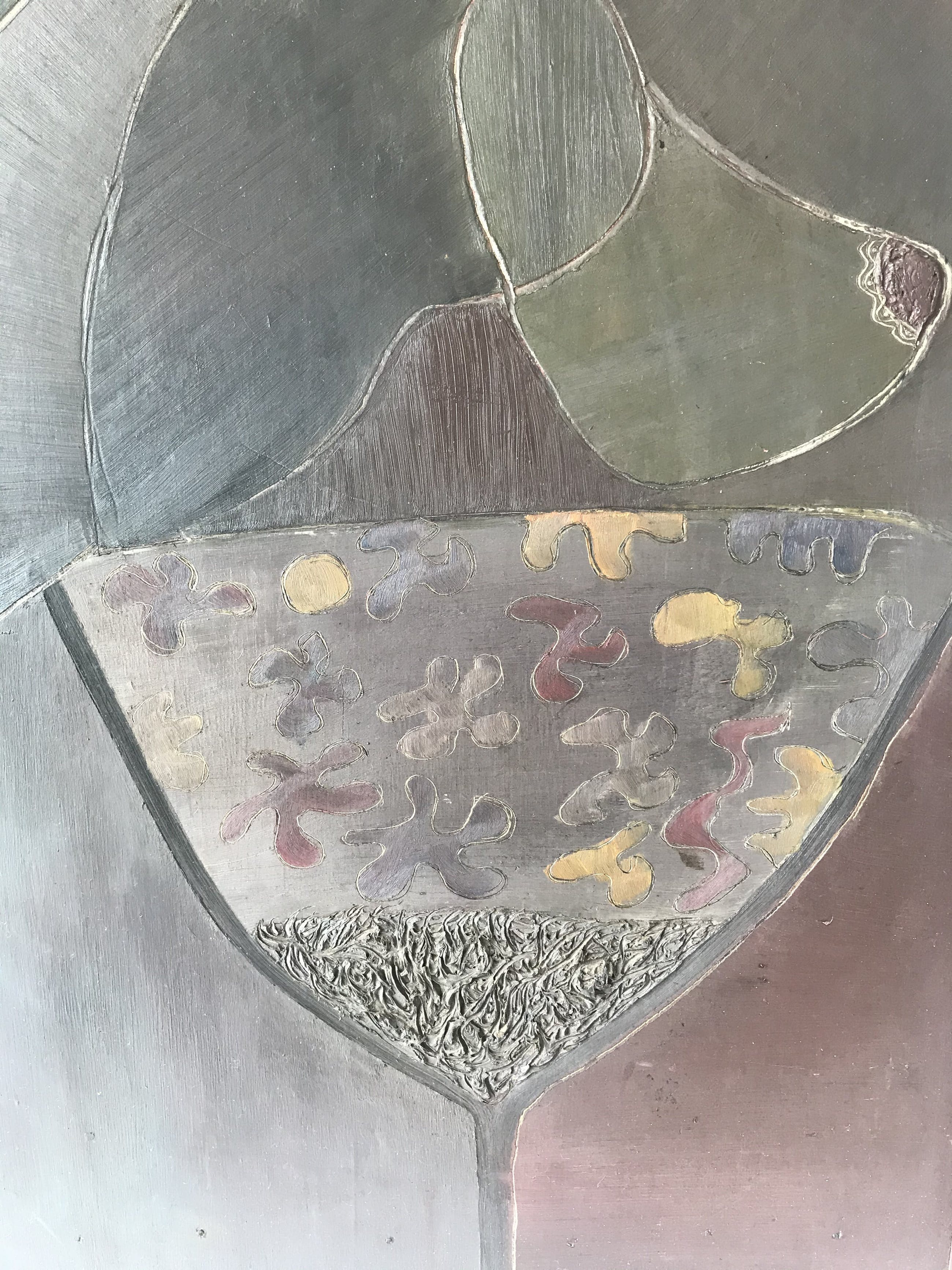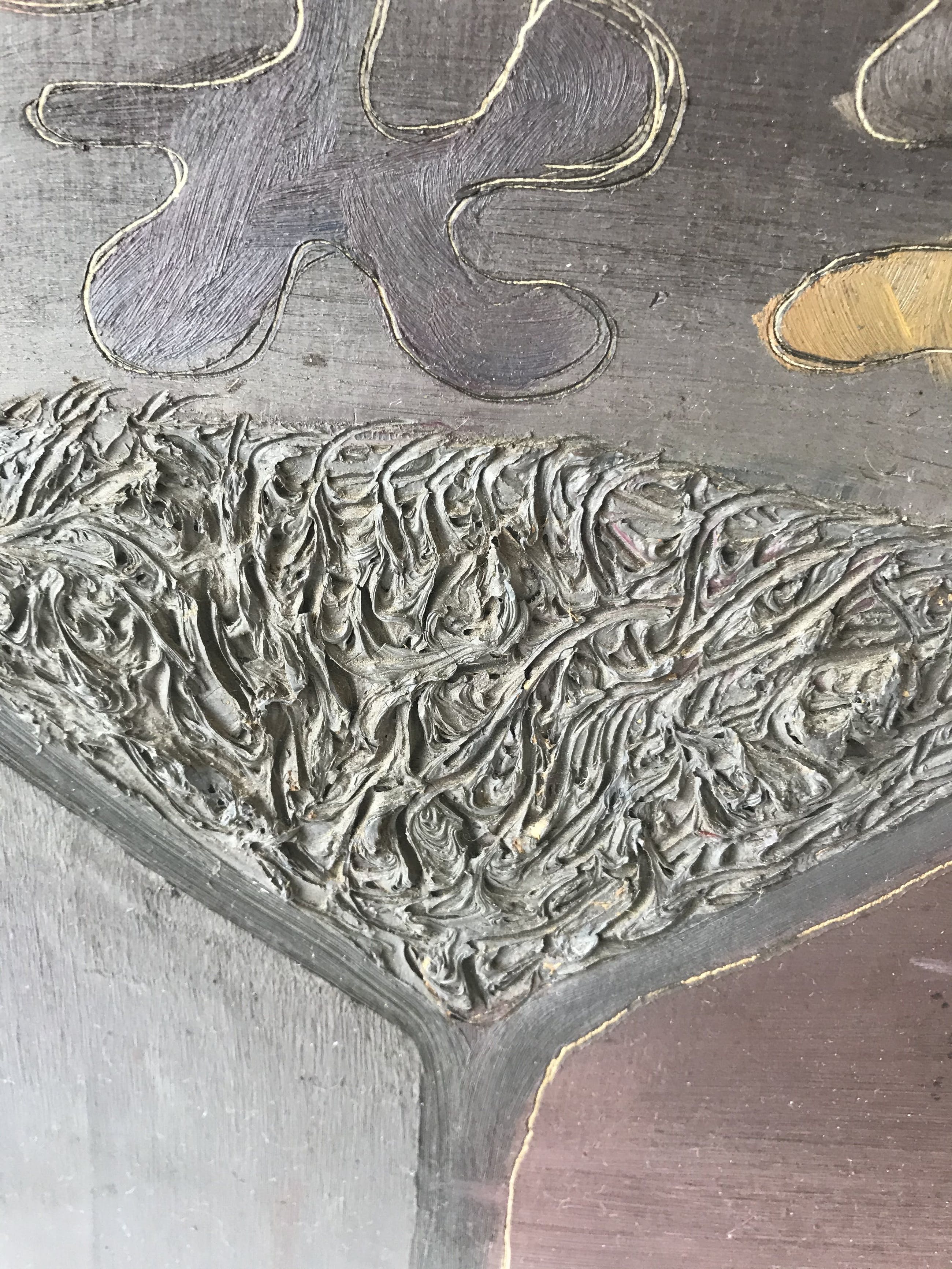 Geschilderd met een grove kwast, ieder vak een eigen strijkrichting, waardoor er een verrassend effect ontstaat. Contouren en structuur aangebracht met paletmes.
