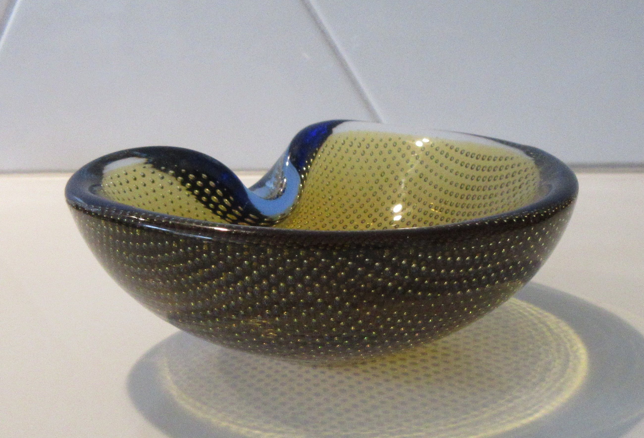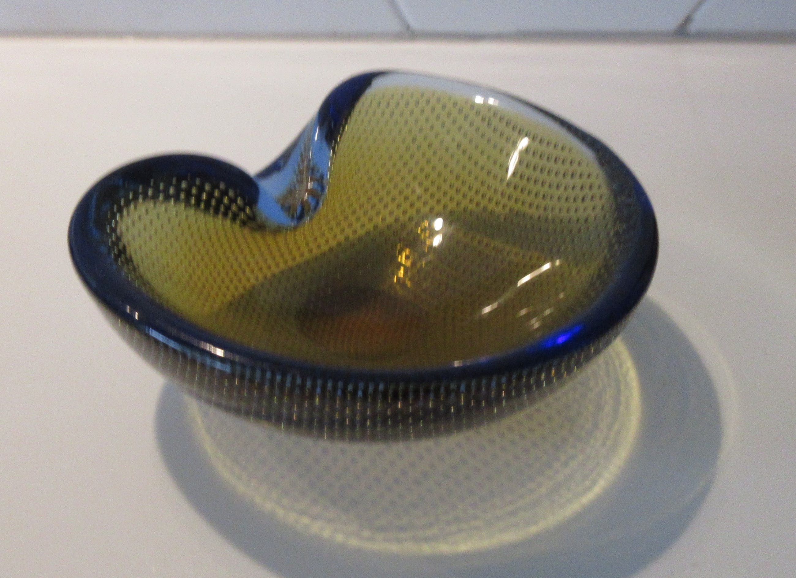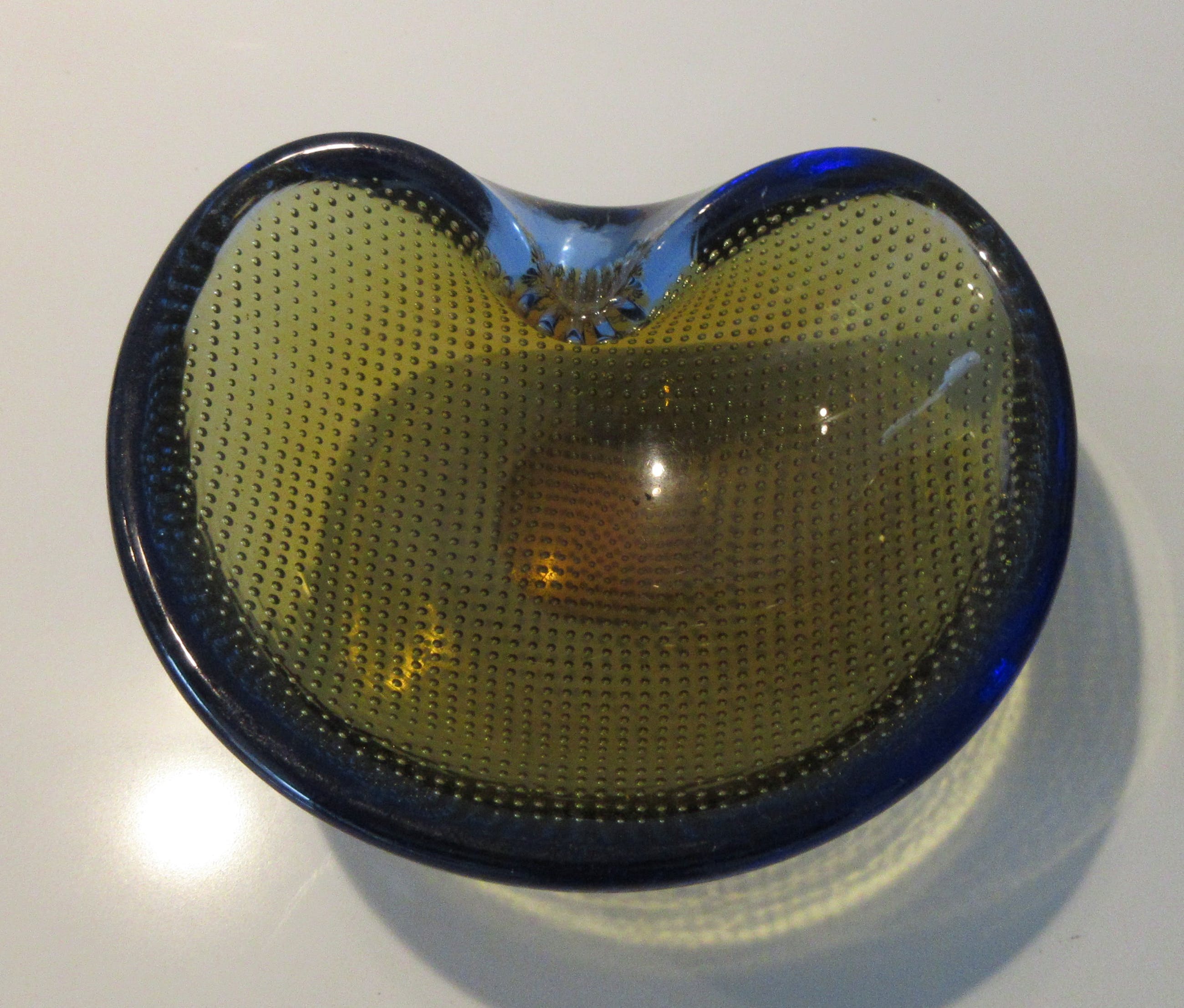 Murano glazen Bullicante asbak. Bullicante is een techniek met ingesloten regelmatige bellen in het glas. De asbak is tweekleurig in cobalt blauw en amber. Niet gemerkt.