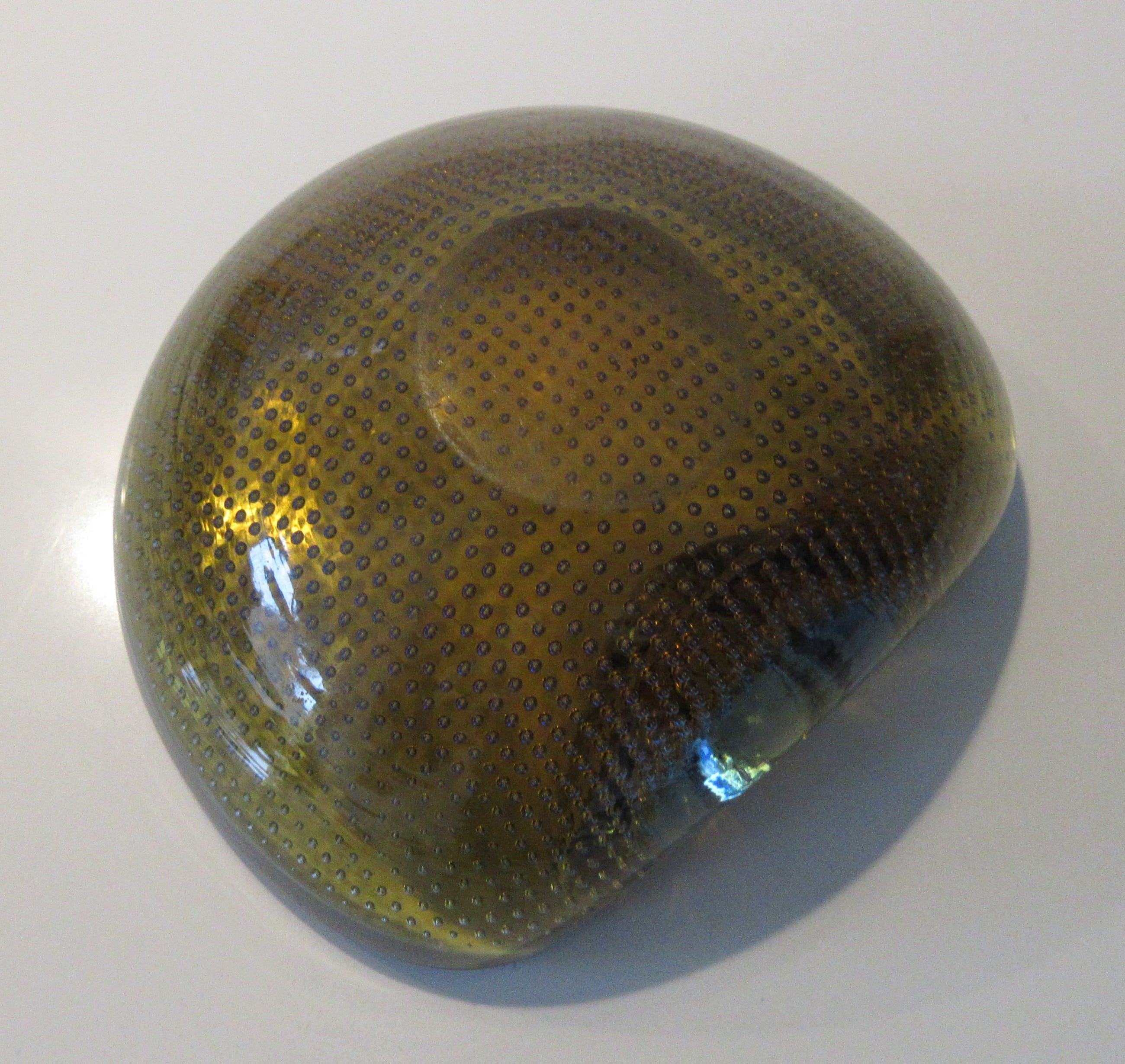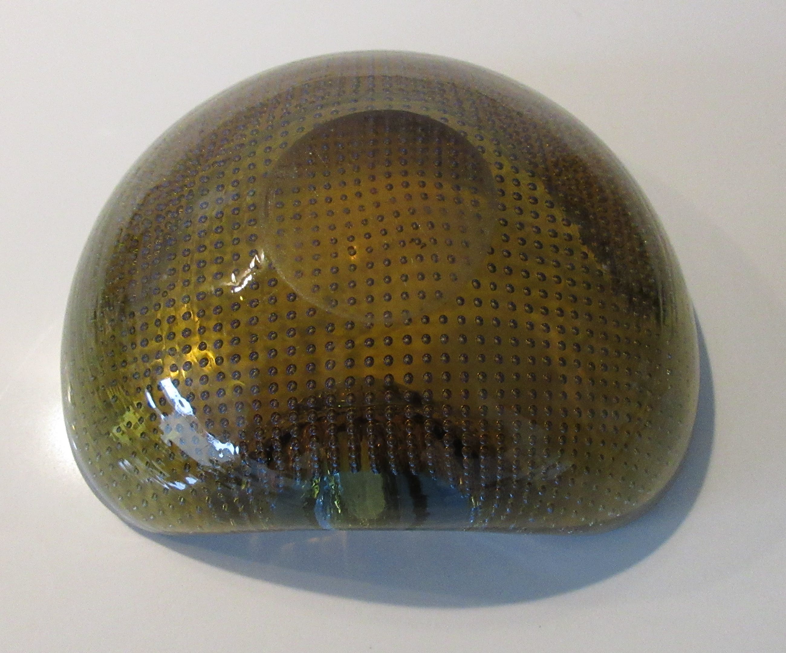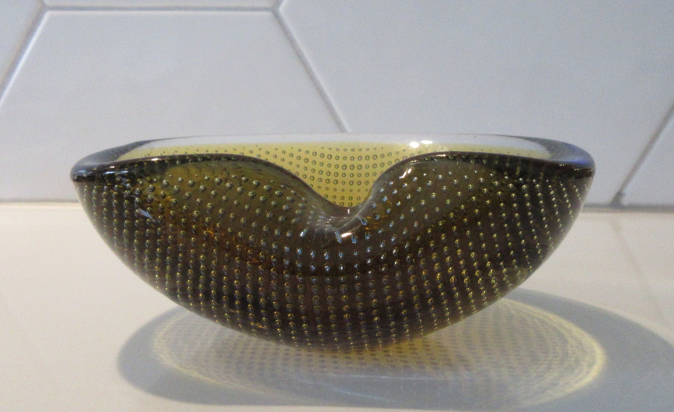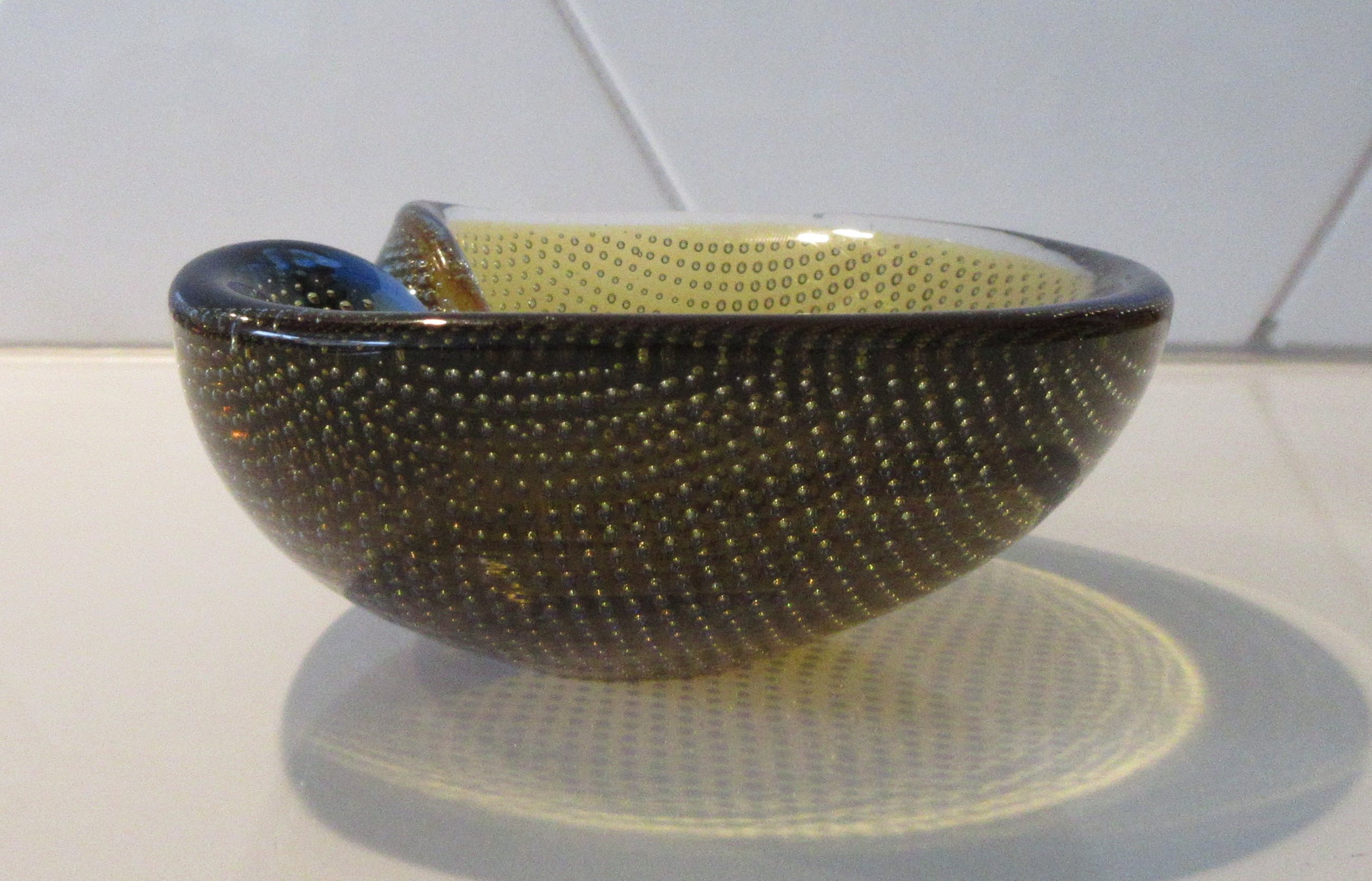 Murano glazen Bullicante asbak. Bullicante is een techniek met ingesloten regelmatige bellen in het glas. De asbak is tweekleurig in cobalt blauw en amber. Niet gemerkt.