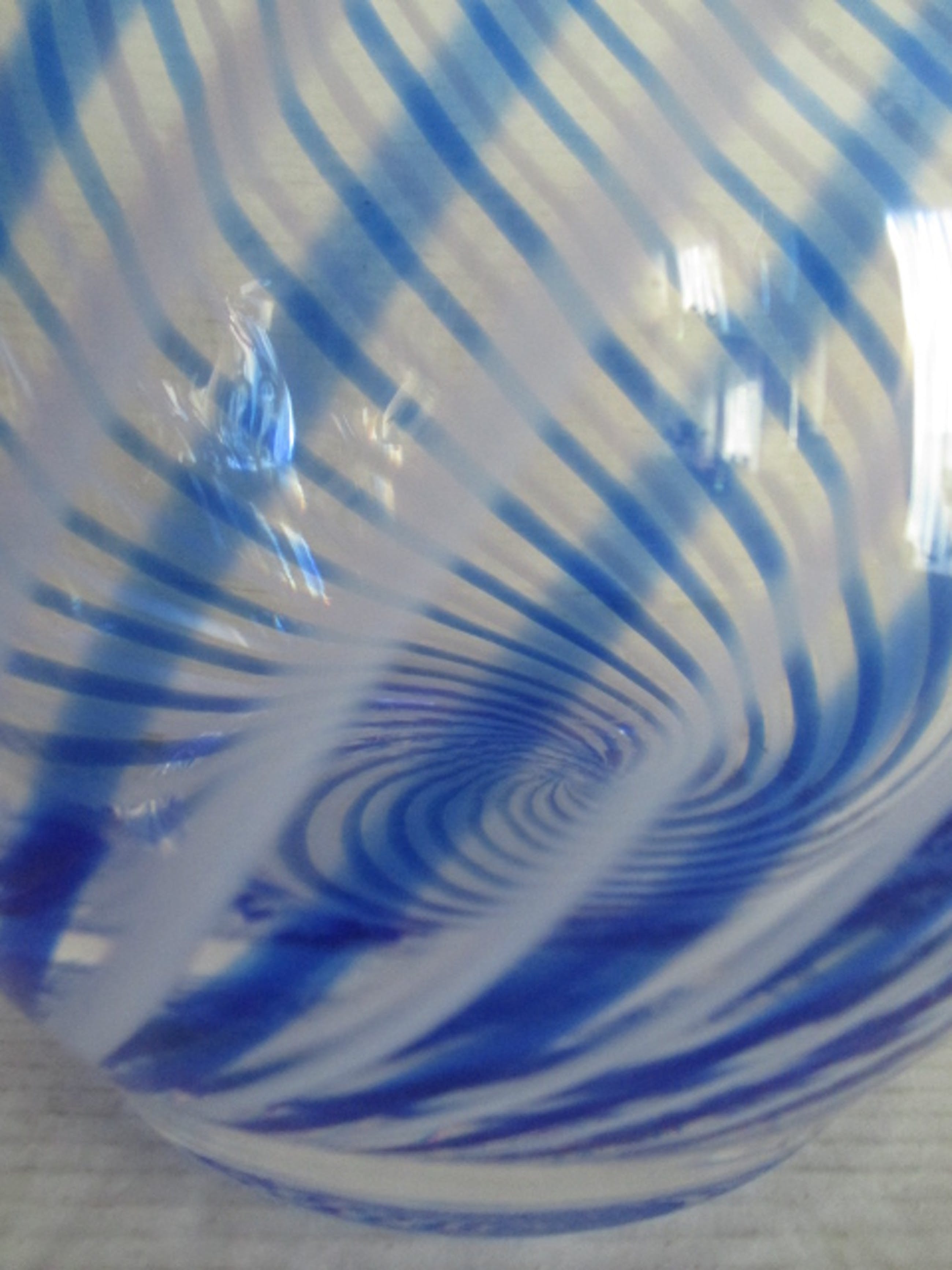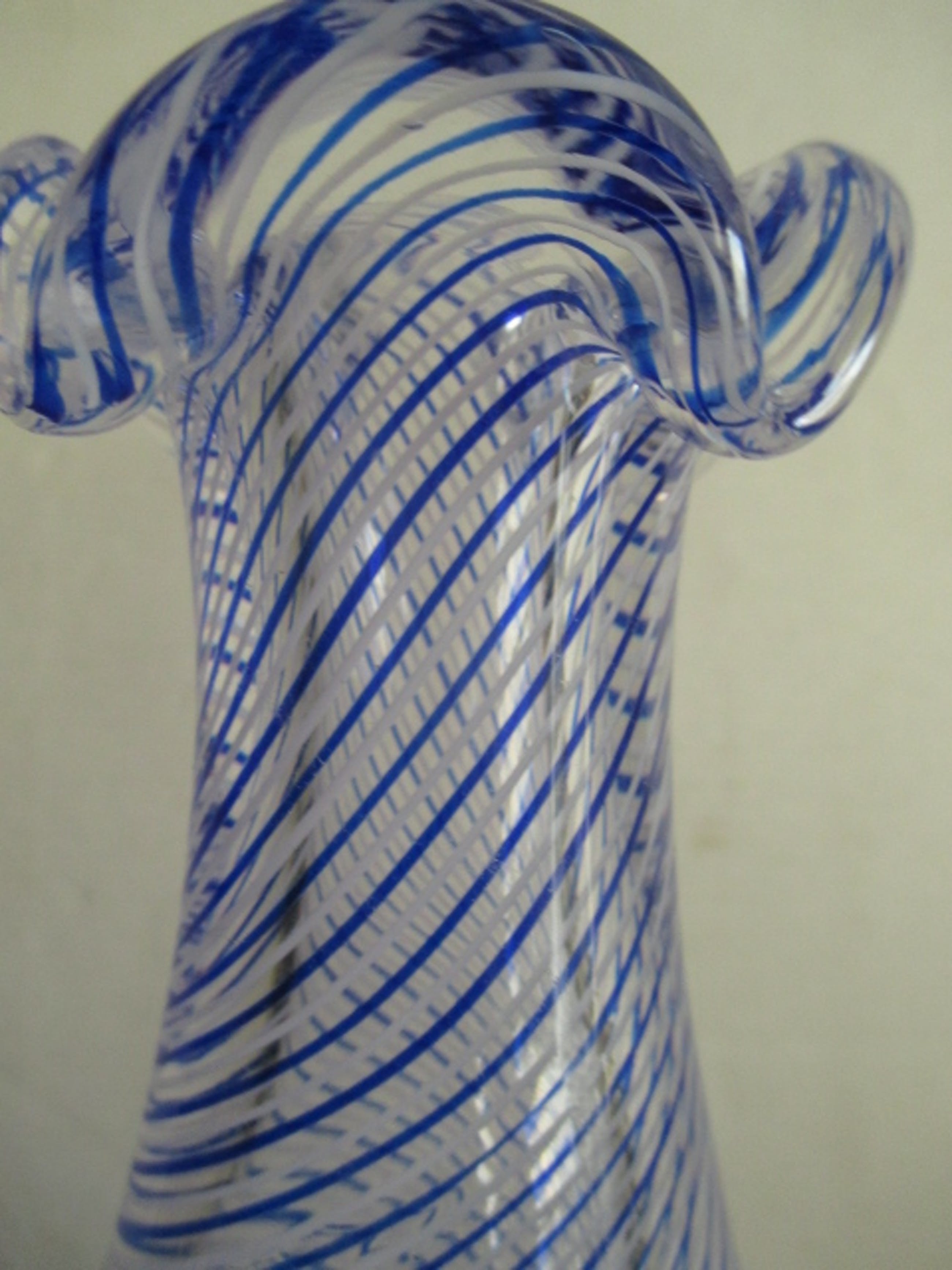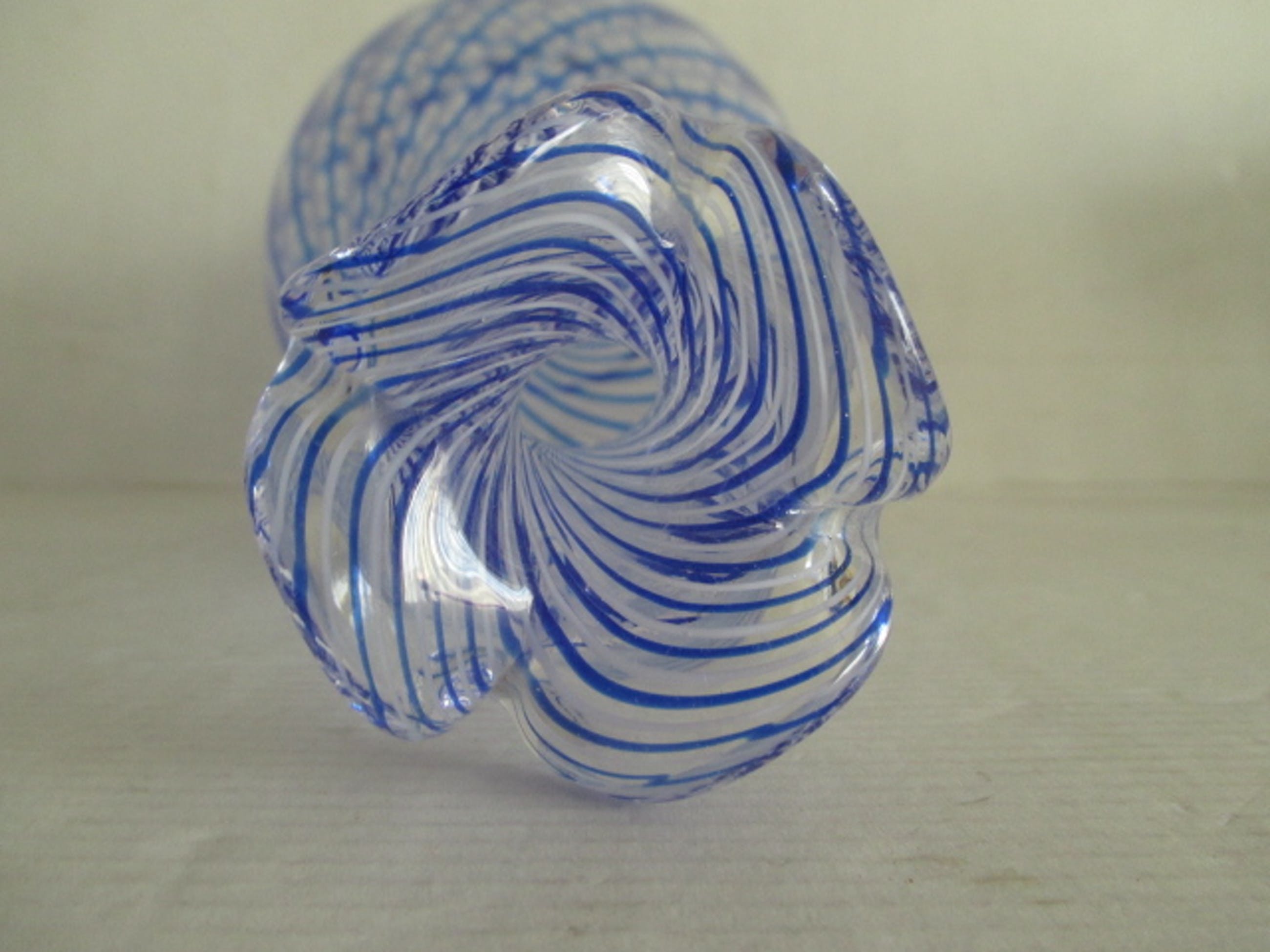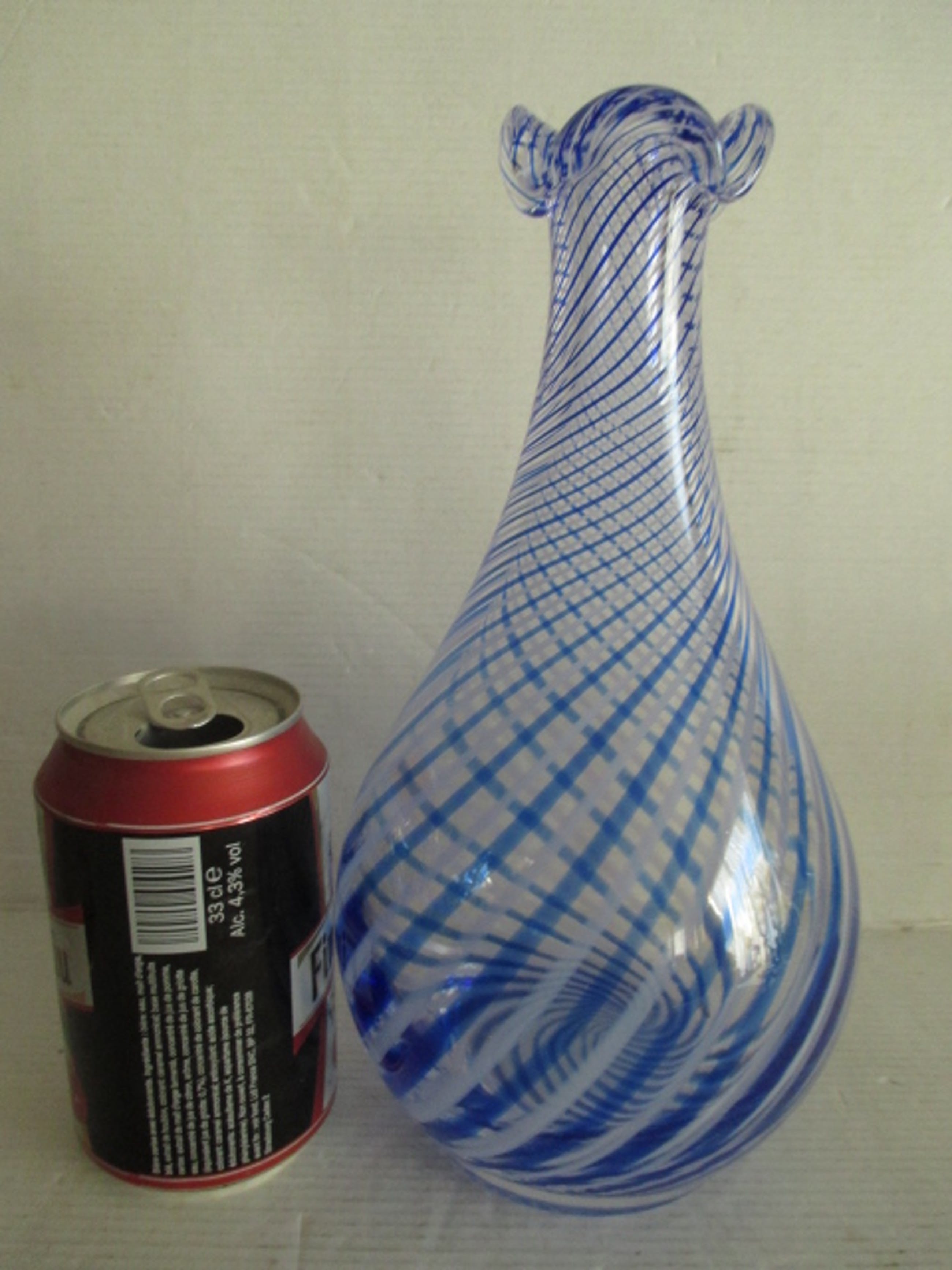 Zeer mooie dik buikvaas met mezza-filigrana spiraal decor, gemaakt op het eiland Murano in het midden van de 20e eeuw.Lichtblauwe en blauwe spiralen op de kleurloos glas, die van onderaan verweven zijn met brede lijnen en naar boven toe worden ze heel dun. Aan de bovenkant eindigt de vaas met vier golven.  Zeer hoge kwaliteit.Getekend op de bodem met een gegraveerde handtekening.Diameter basis 8 cm.In top conditie!Vaas wordt goed verpakt en aangetekend en verzekerd verzonden.
