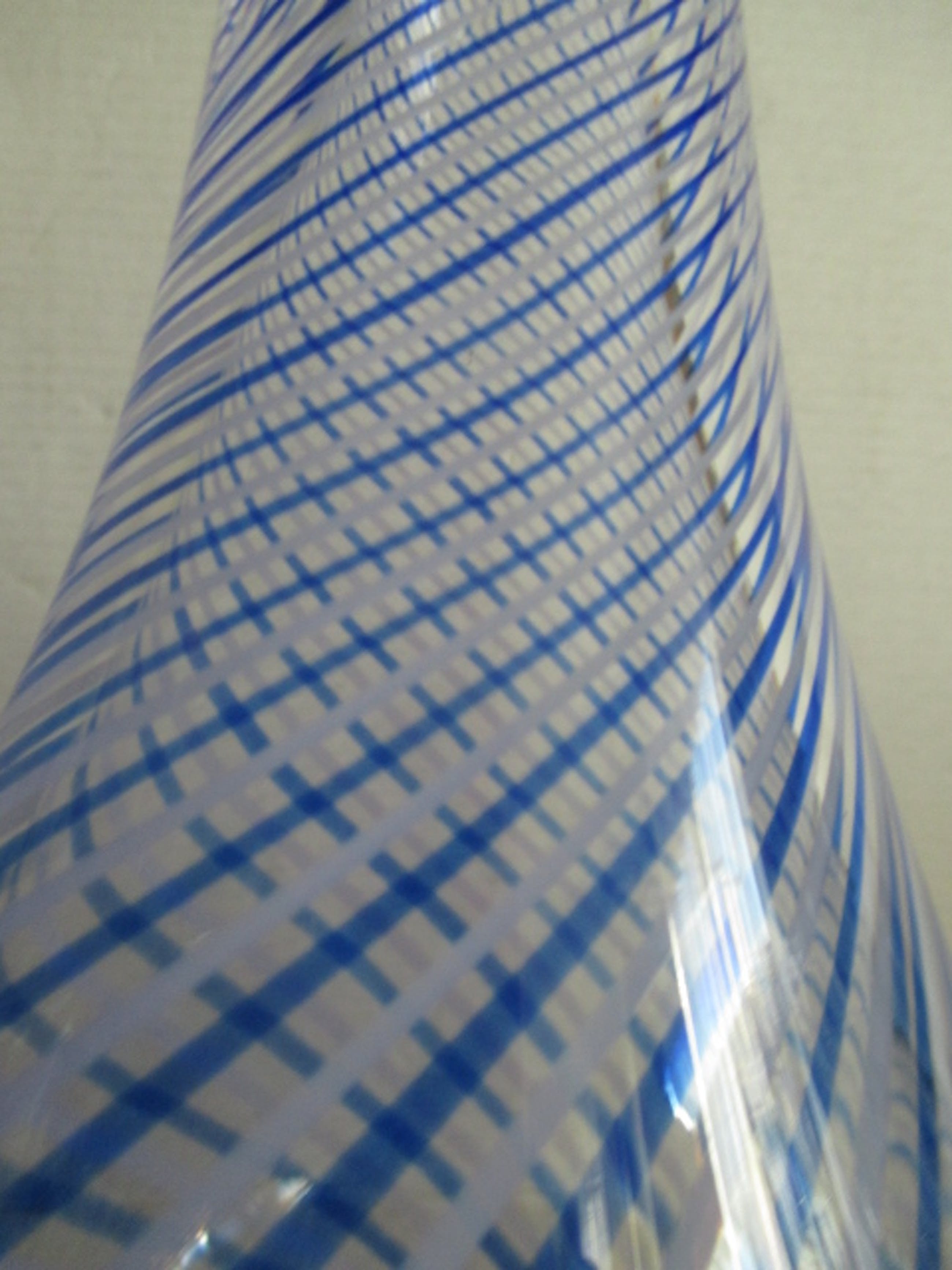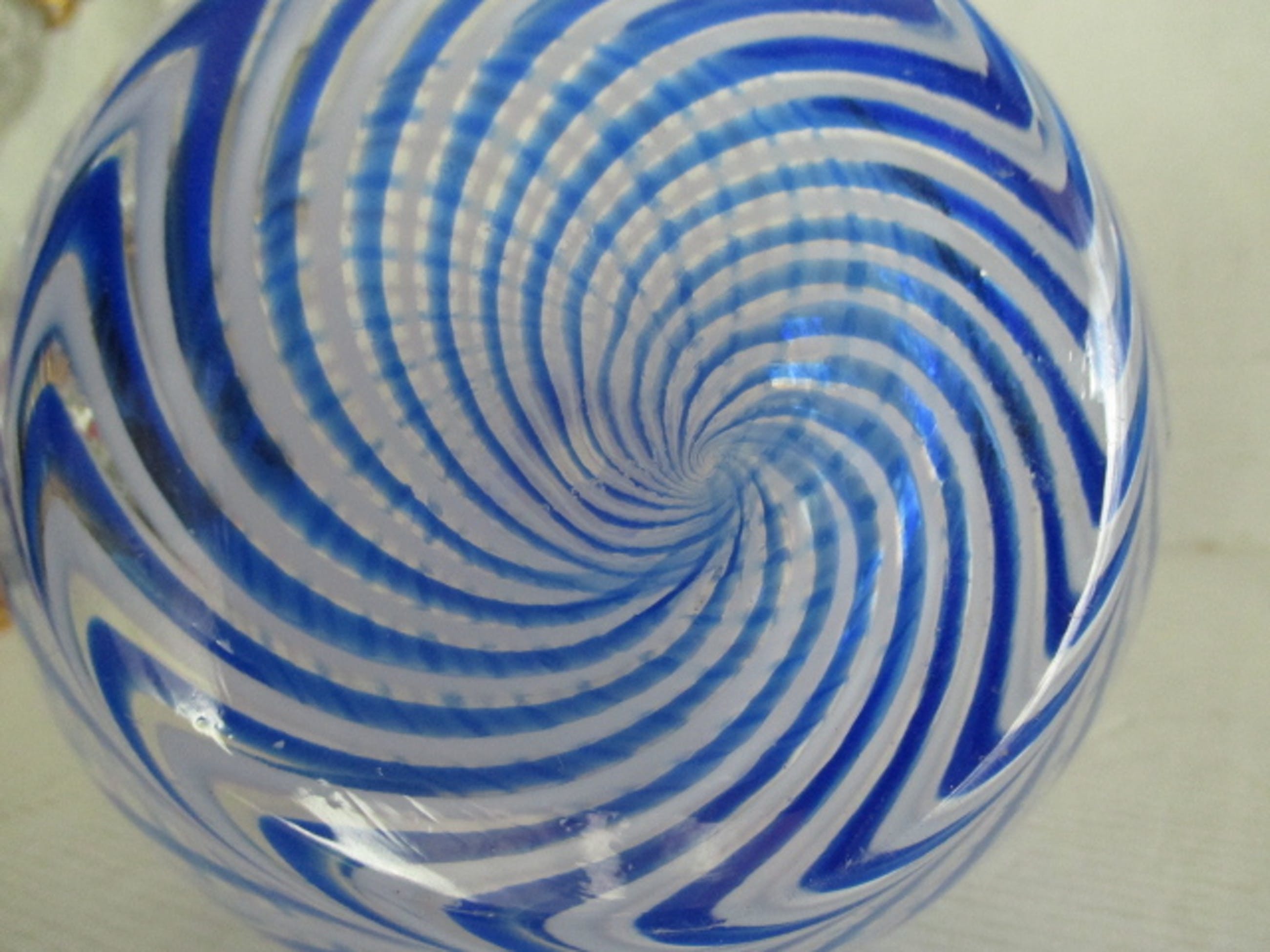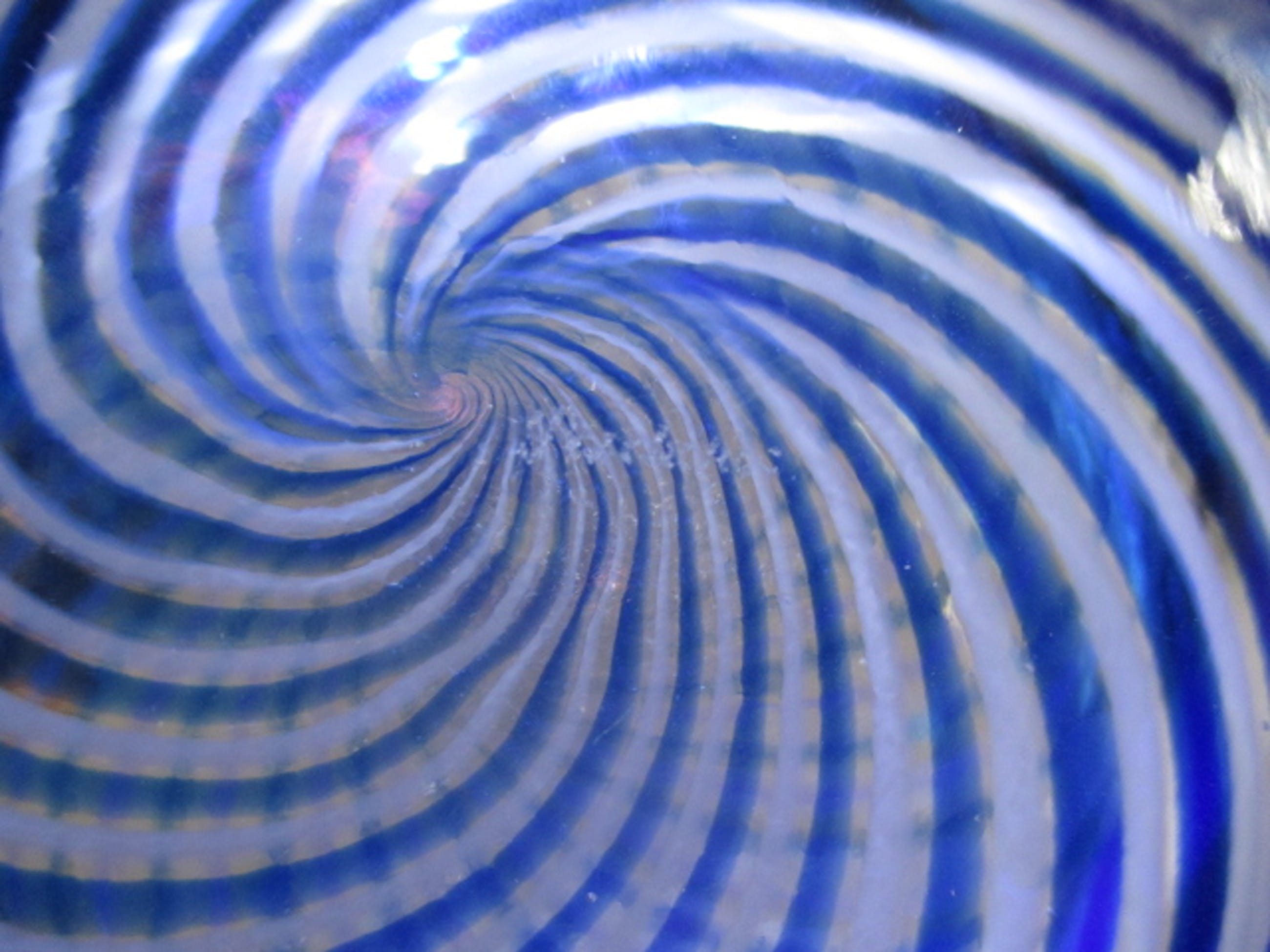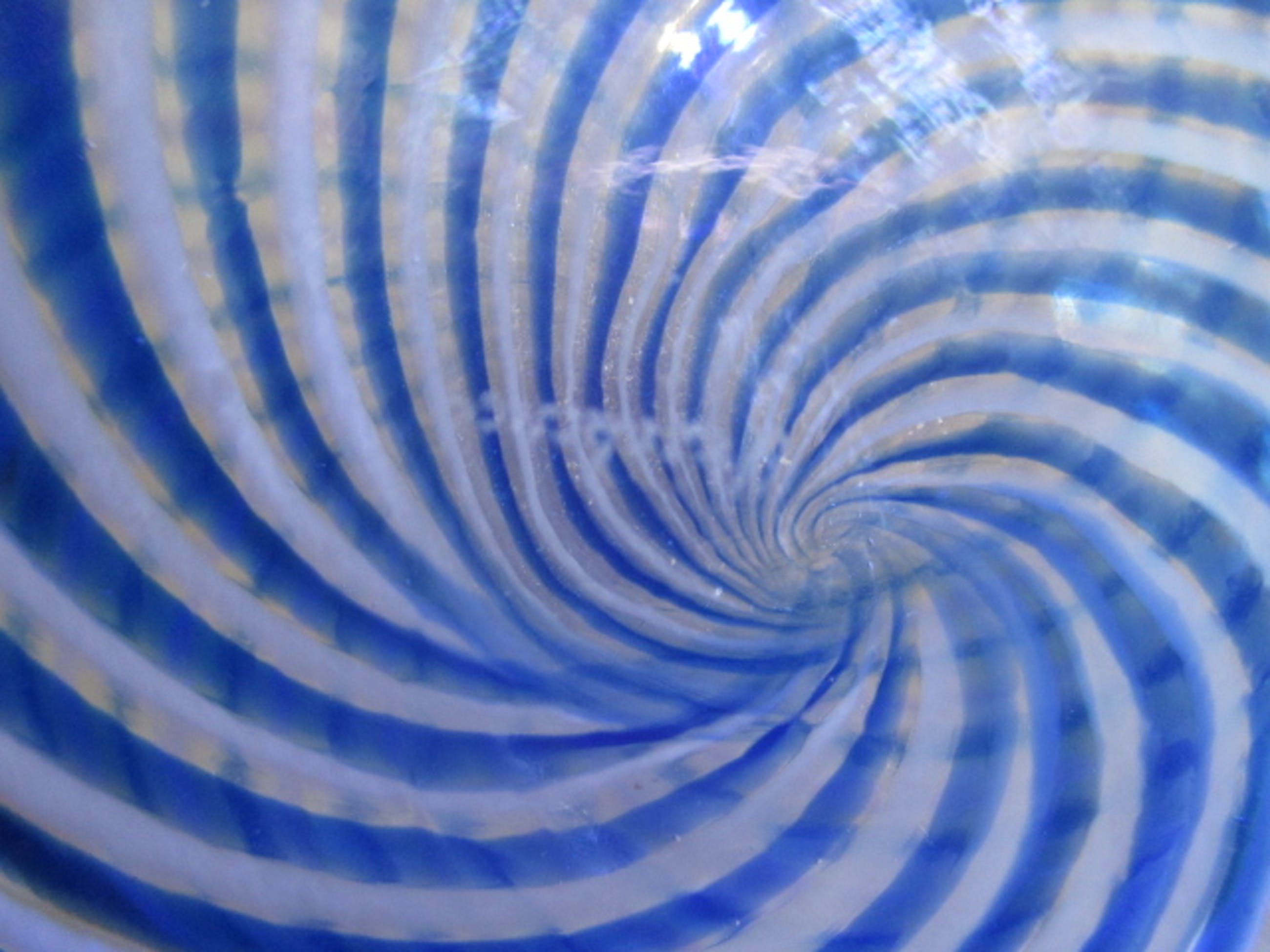 Zeer mooie dik buikvaas met mezza-filigrana spiraal decor, gemaakt op het eiland Murano in het midden van de 20e eeuw.Lichtblauwe en blauwe spiralen op de kleurloos glas, die van onderaan verweven zijn met brede lijnen en naar boven toe worden ze heel dun. Aan de bovenkant eindigt de vaas met vier golven.  Zeer hoge kwaliteit.Getekend op de bodem met een gegraveerde handtekening.Diameter basis 8 cm.In top conditie!Vaas wordt goed verpakt en aangetekend en verzekerd verzonden.