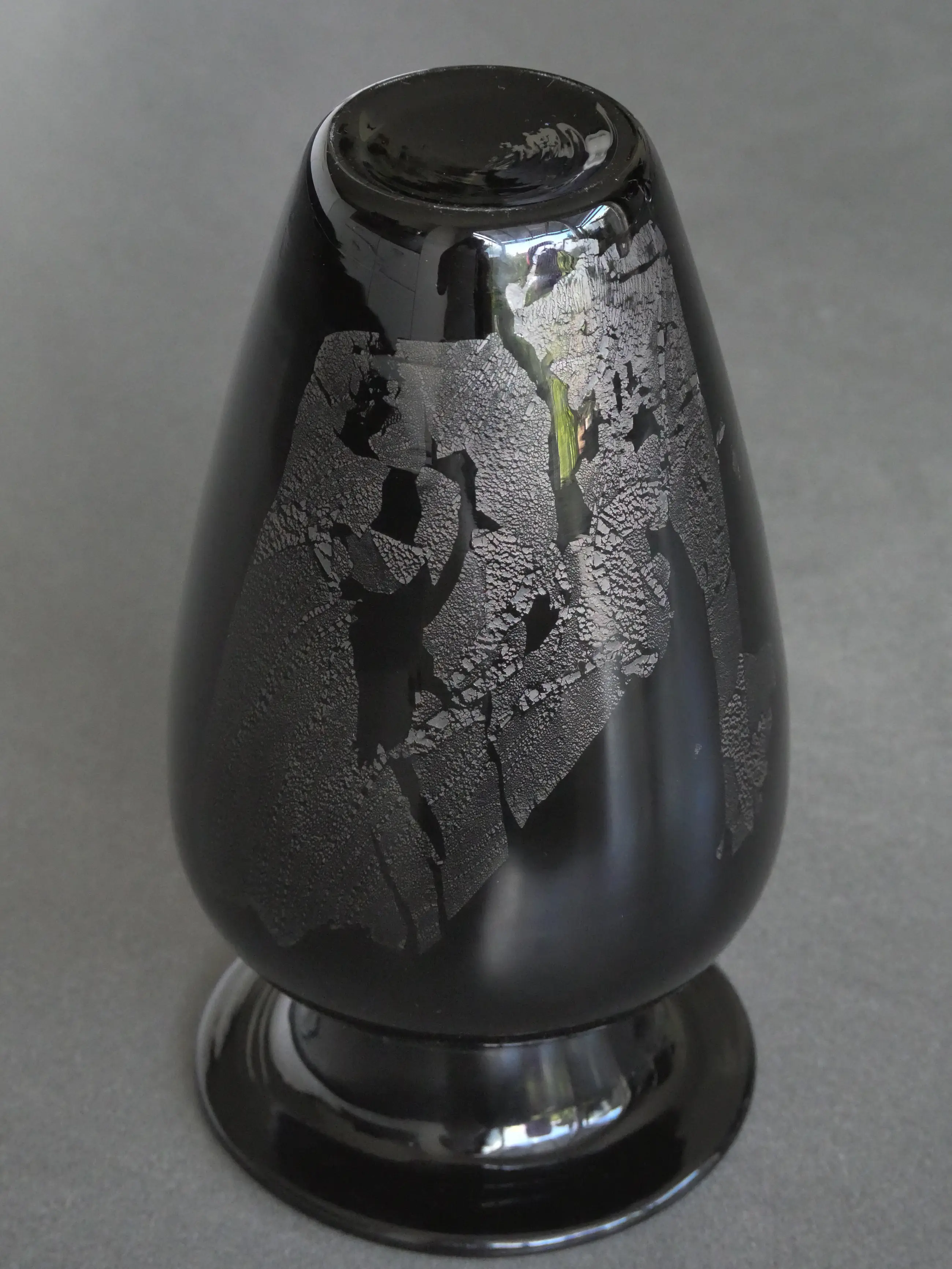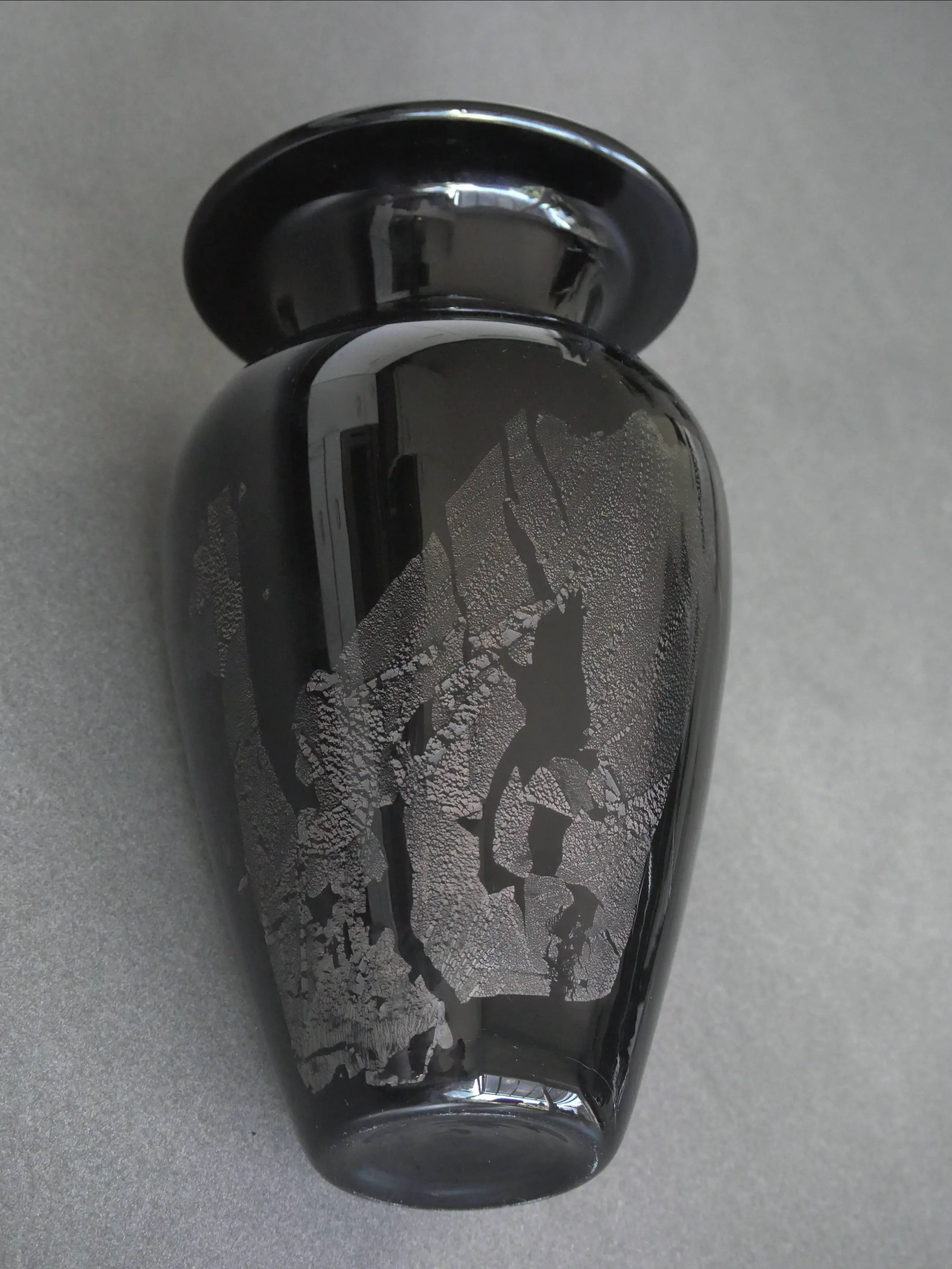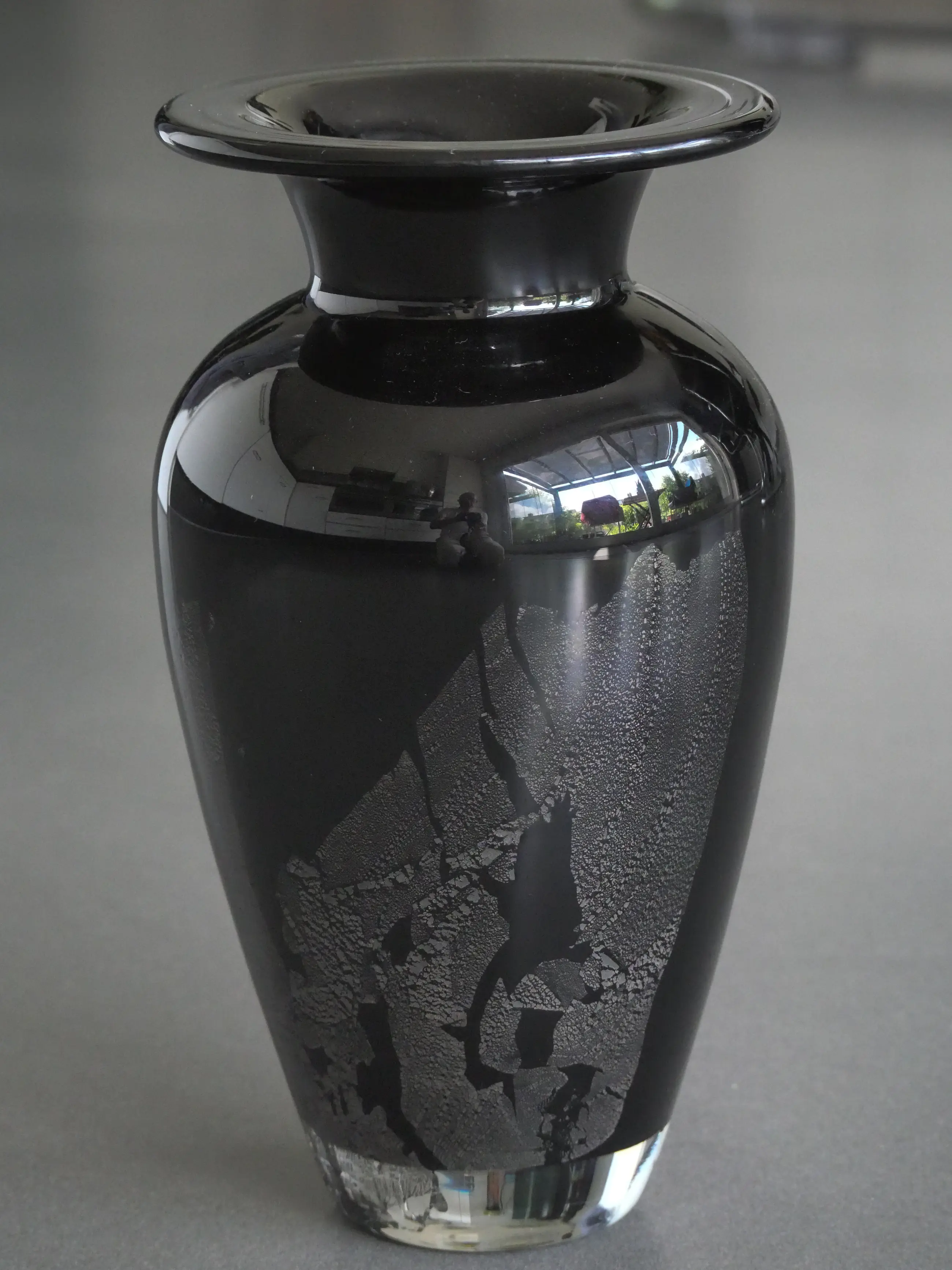 Vaas afkomst waarschijnlijk Murano. Kleur zwart met zilveren flacks Is gesigneerd maar onduidelijk. Verkeert in uitstekende conditie. Gewicht ruim 1 kilo Hoogte: 22,5 cm Diameter: 12 Zie foto's voor de signatuur