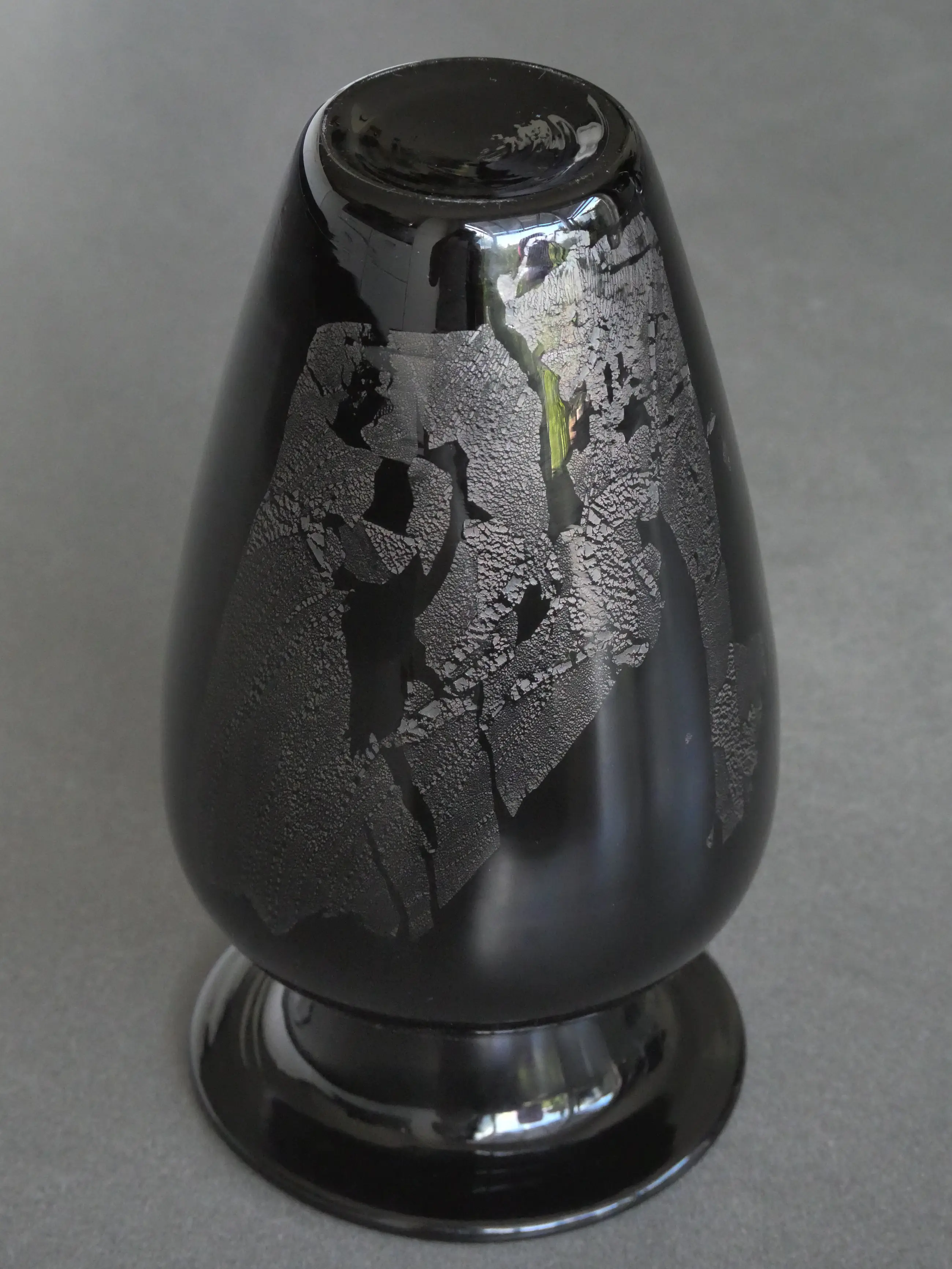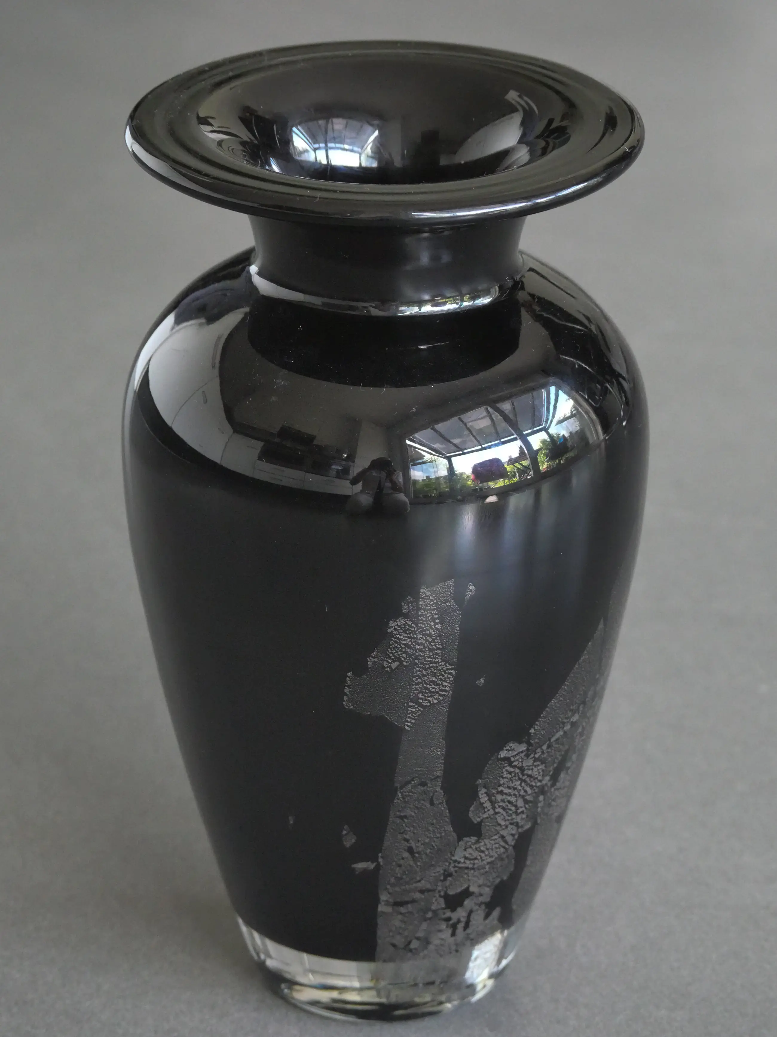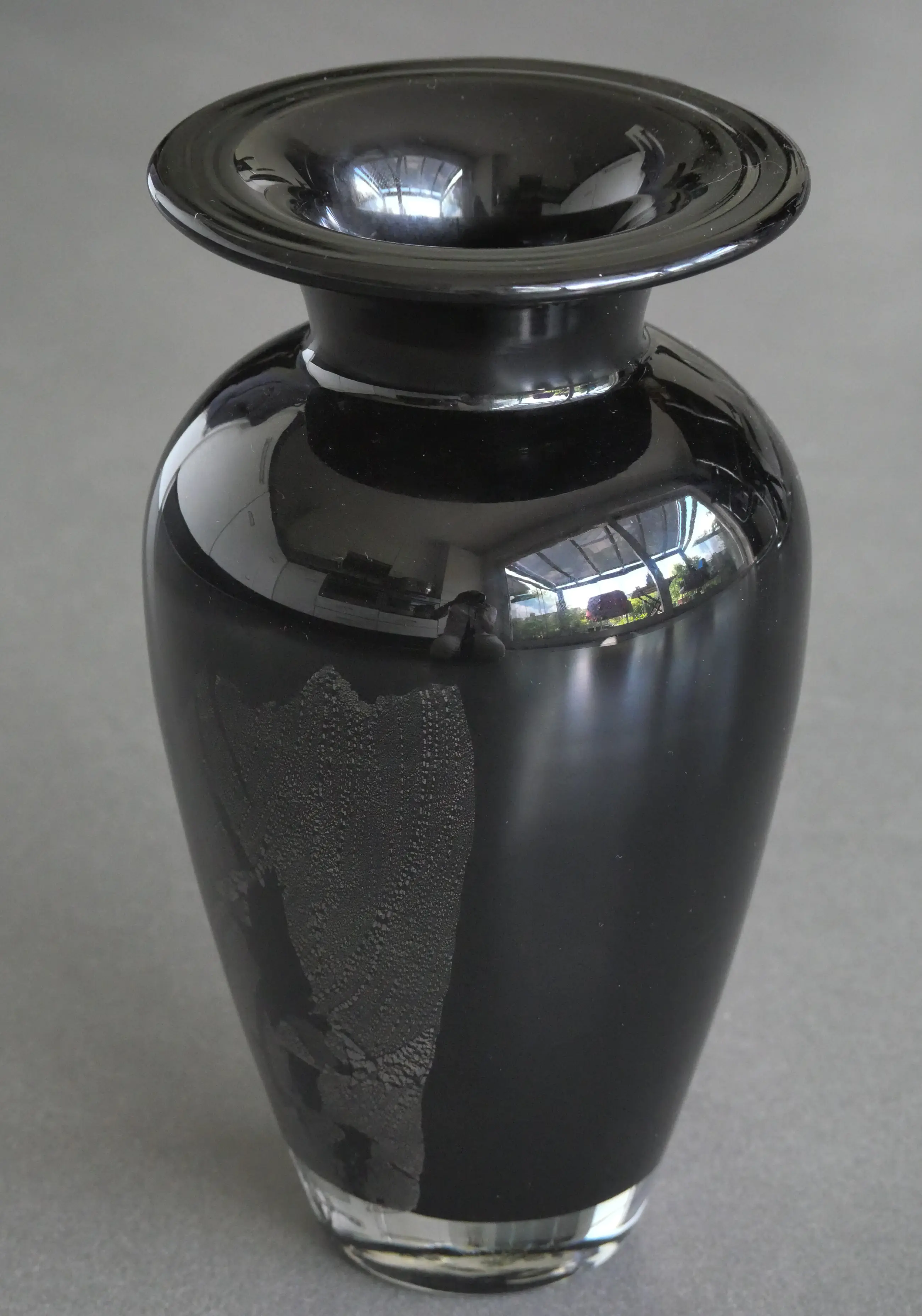 Vaas afkomst waarschijnlijk Murano. Kleur zwart met zilveren flacks Is gesigneerd maar onduidelijk. Verkeert in uitstekende conditie. Gewicht ruim 1 kilo Hoogte: 22,5 cm Diameter: 12 Zie foto's voor de signatuur