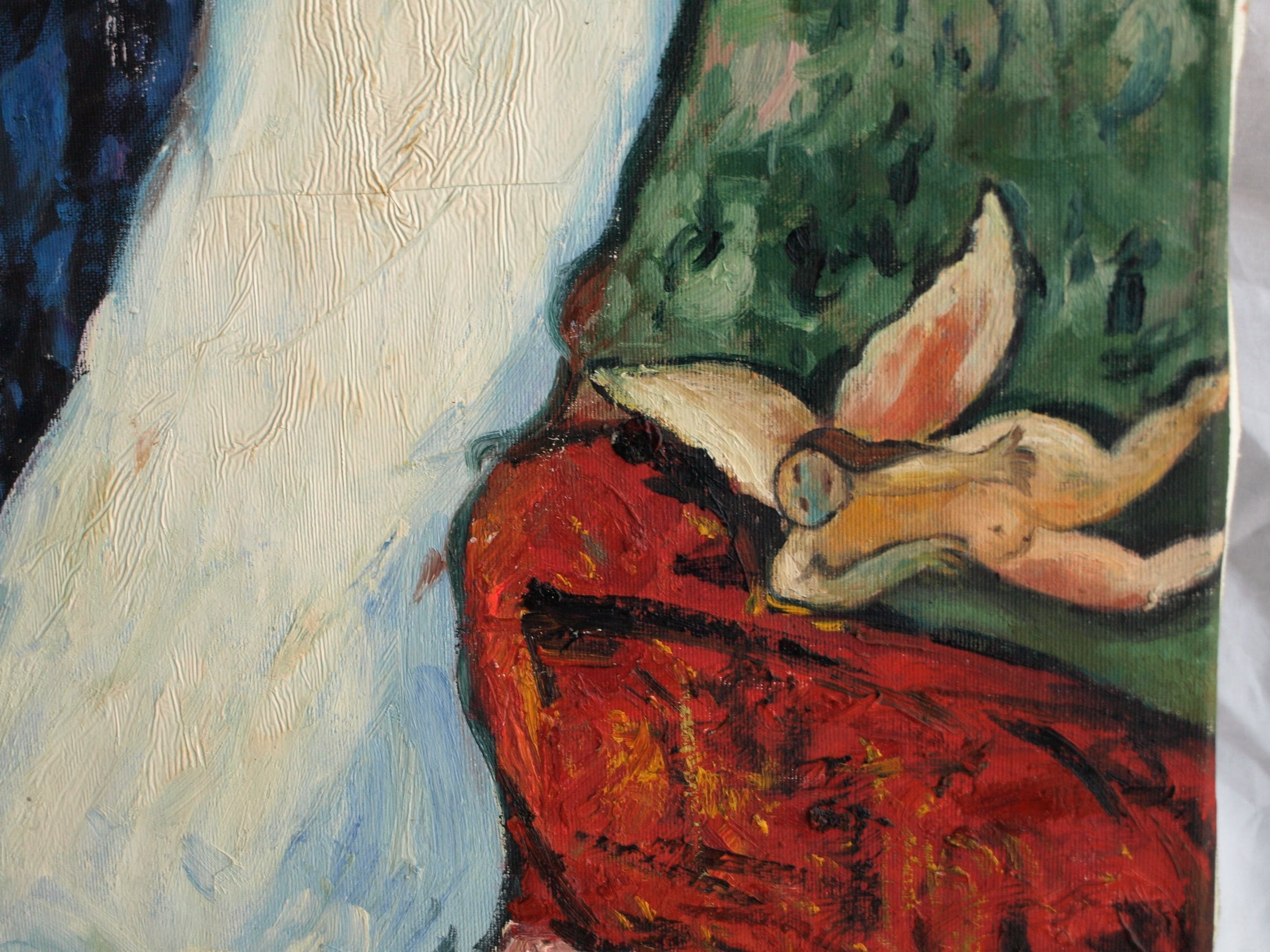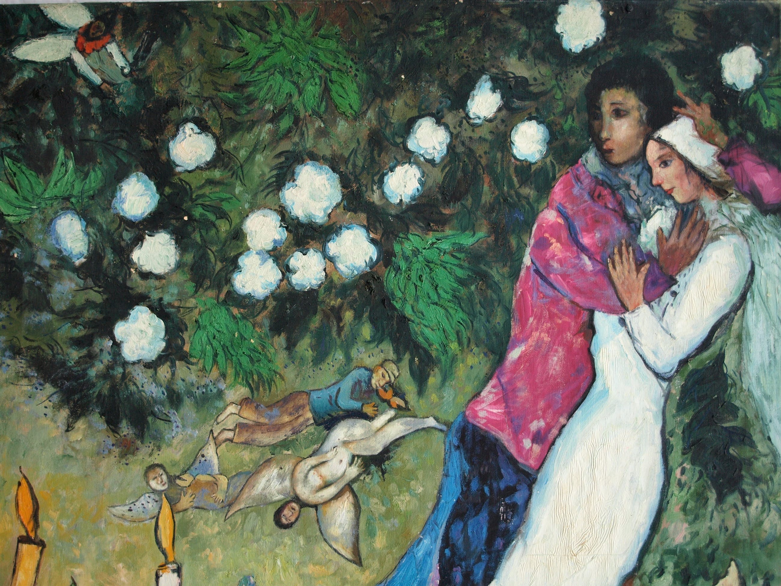 Een schilderij van een ons onbekende kunstenaar, met een voorstelling naar werk van de Franse kunstenaar Marc Chagall (1887-1985), met daarin zijn kenmerkende thema’s: het dorp, zwevende figuren, bruid en bruidegom, bloemen en kaarsen.