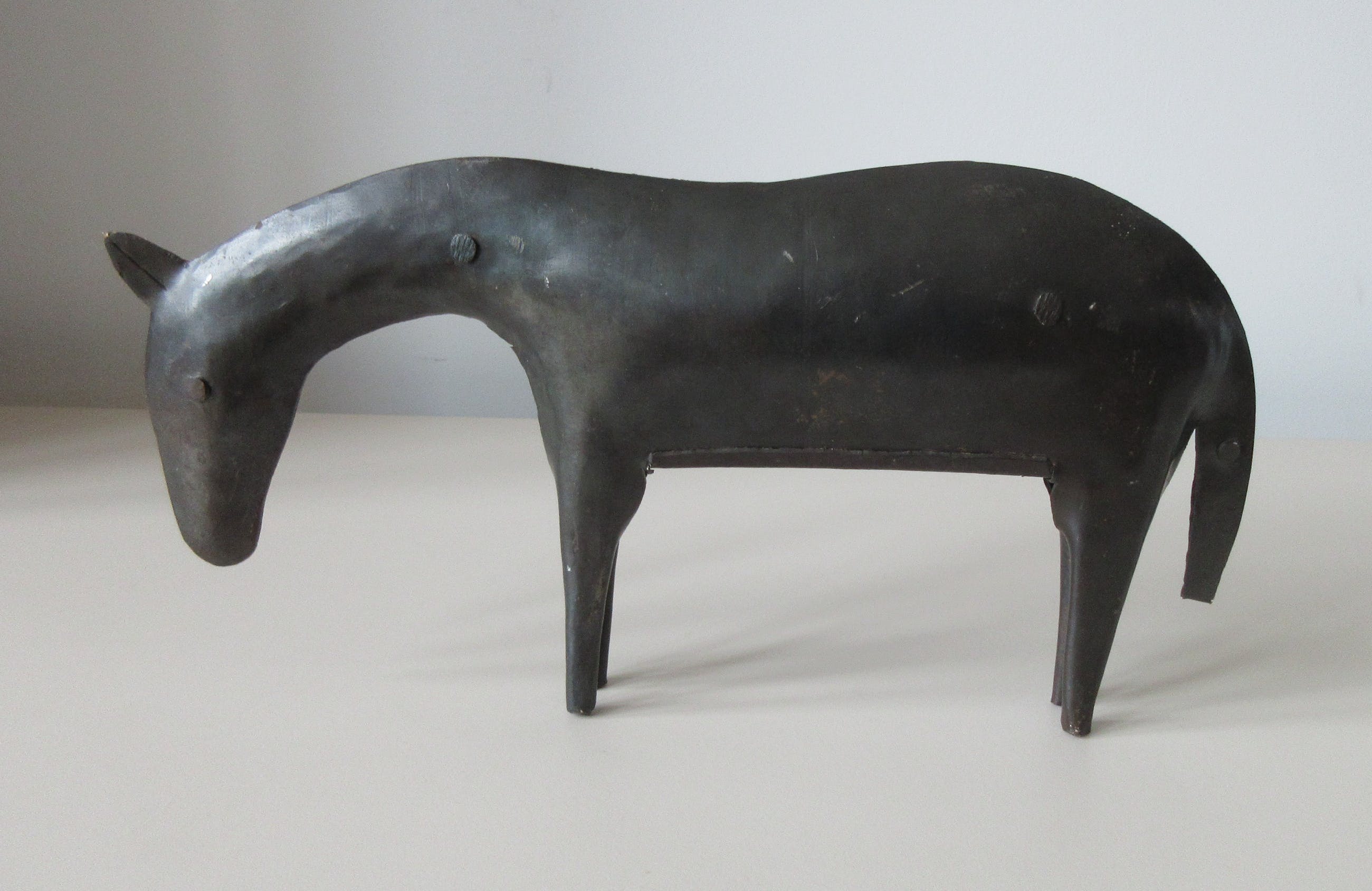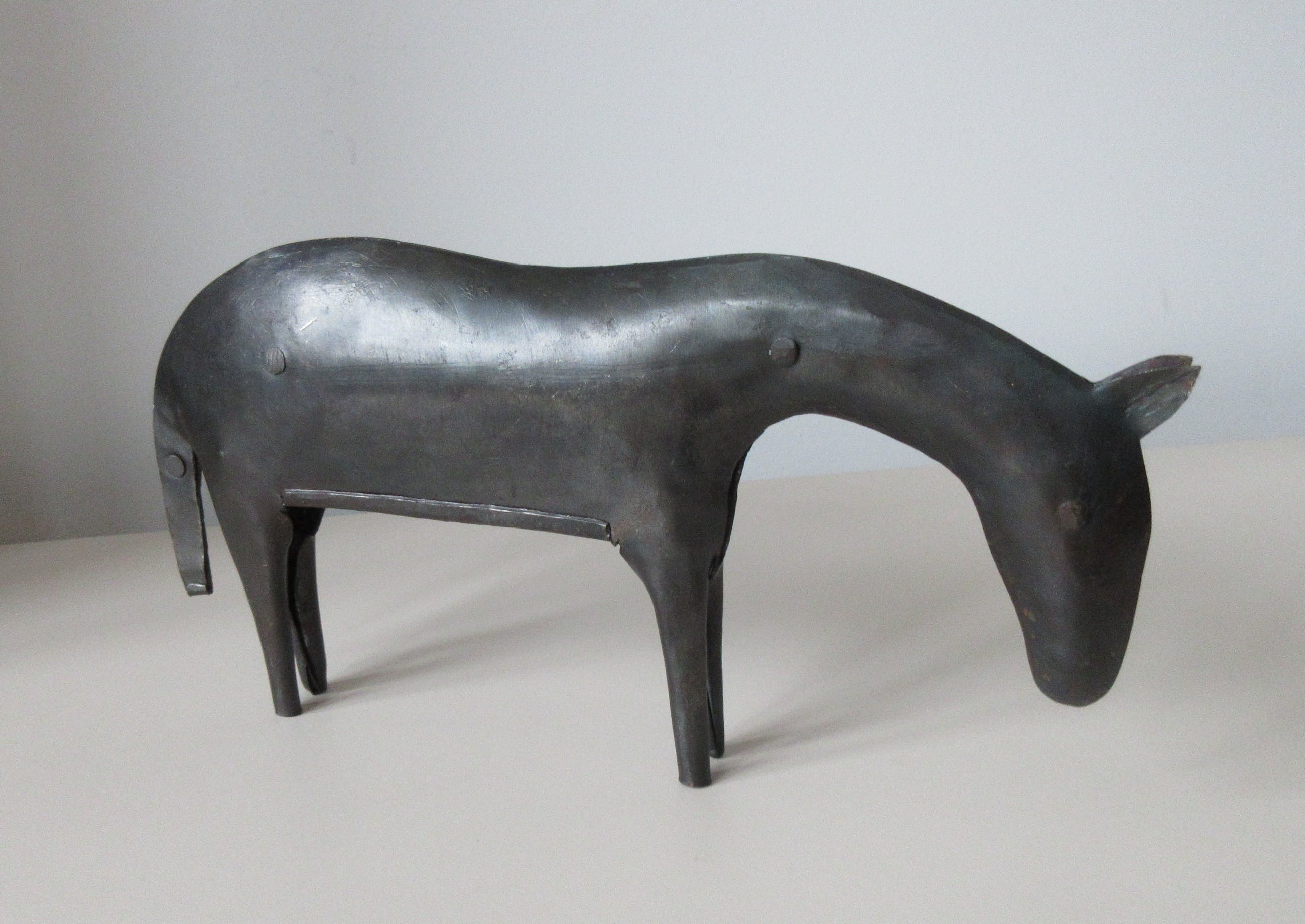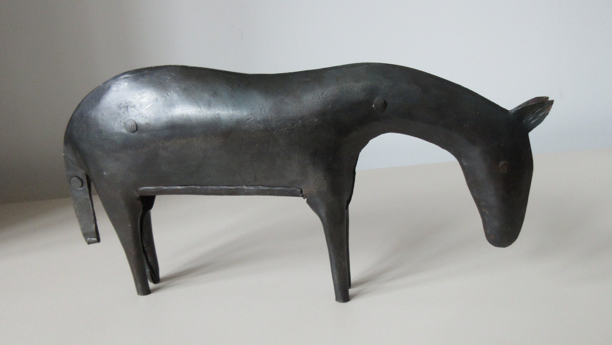 Erg mooi naïef plaatstalen figuur van een paard. Erg mooie patina, van grijs naar groen naar bruin rood. De klinknagels zijn mooi zichtbaar. Niet gesigneerd dus maker onbekend.