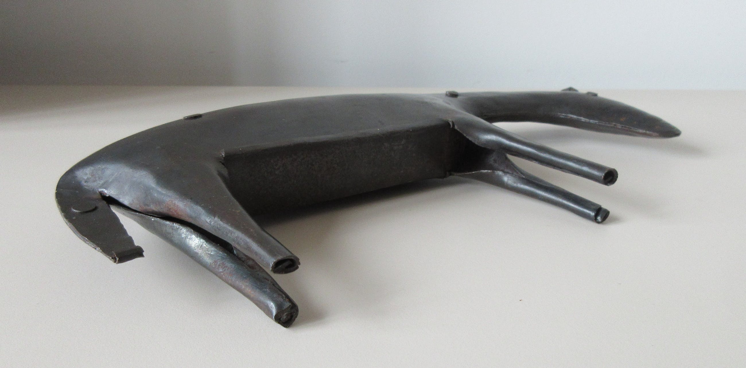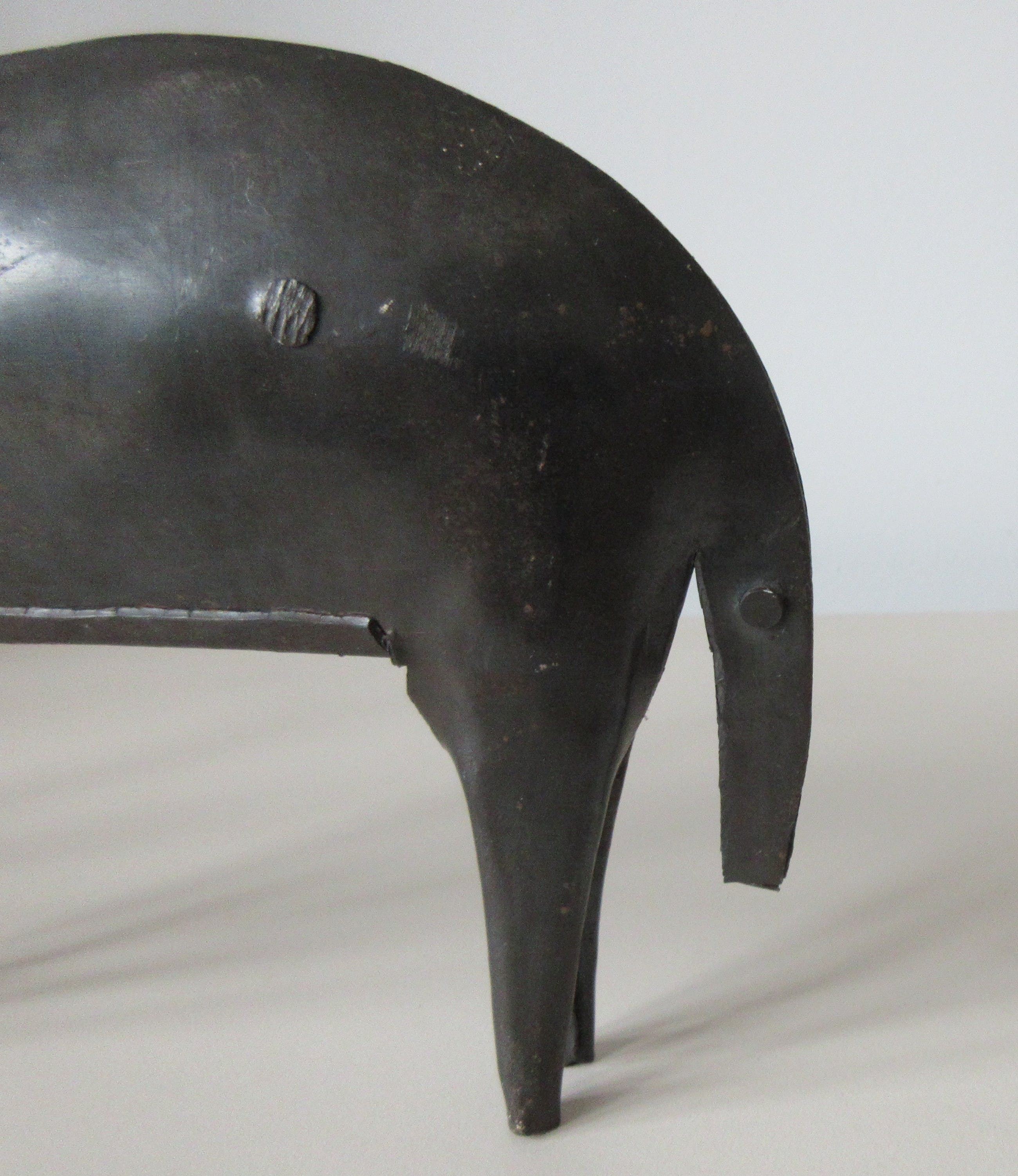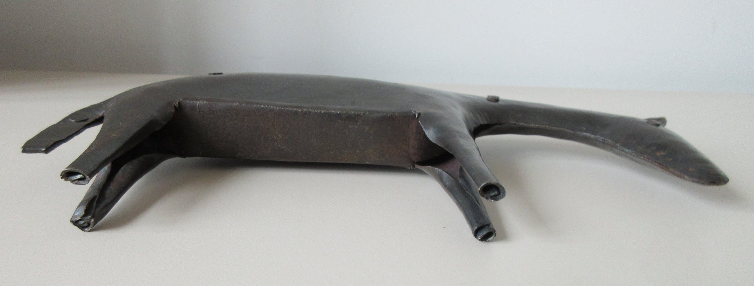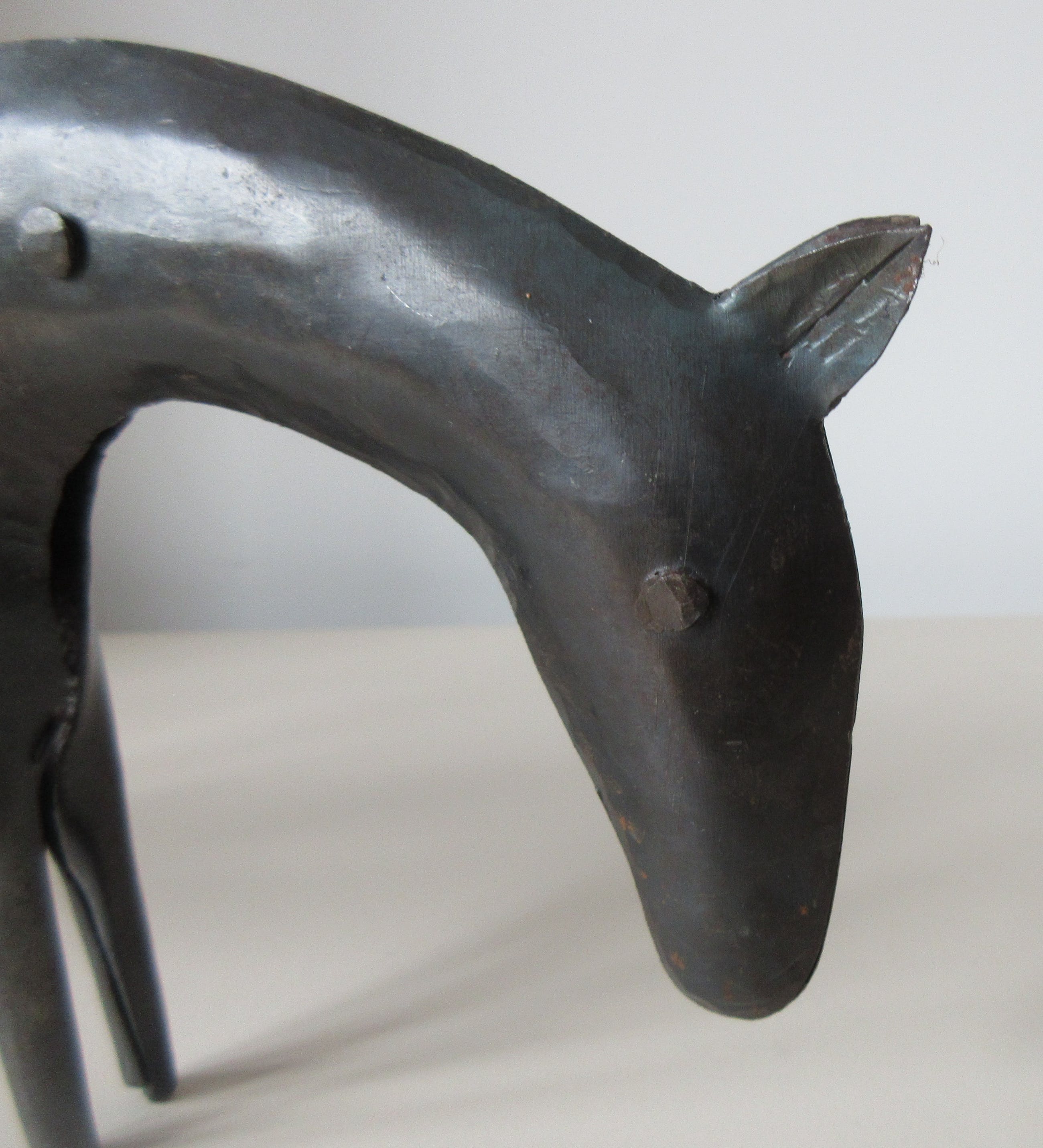 Erg mooi naïef plaatstalen figuur van een paard. Erg mooie patina, van grijs naar groen naar bruin rood. De klinknagels zijn mooi zichtbaar. Niet gesigneerd dus maker onbekend.