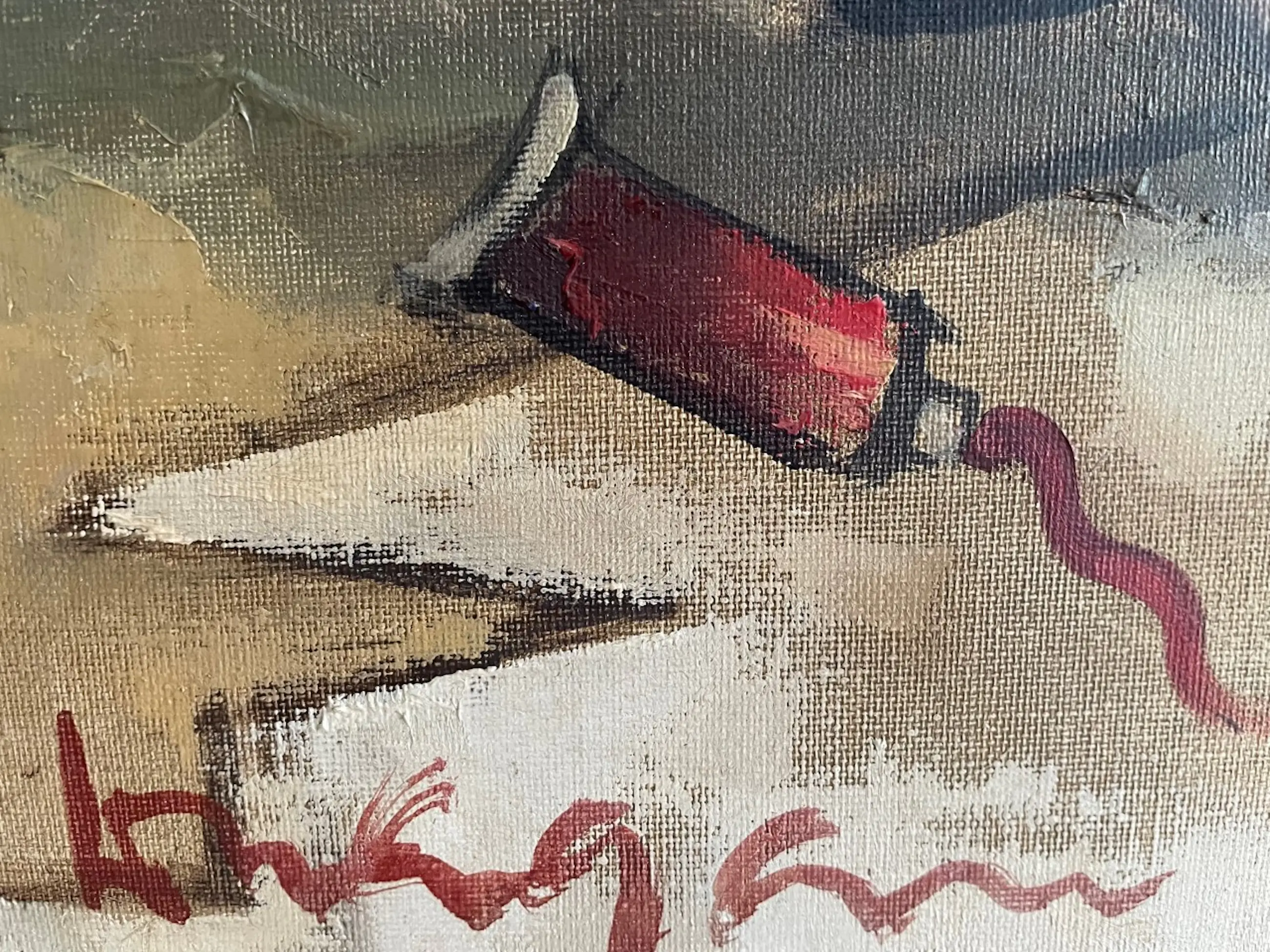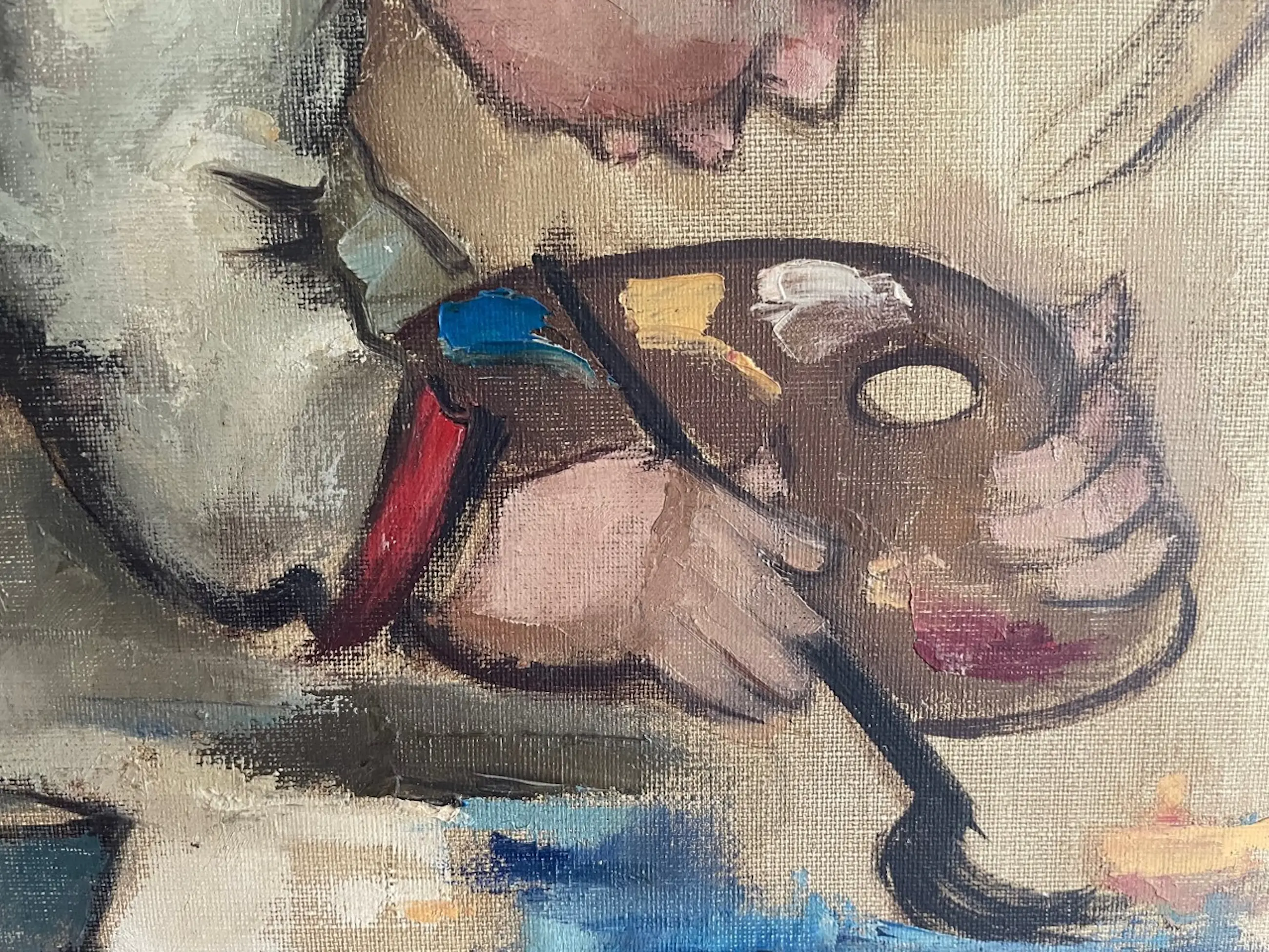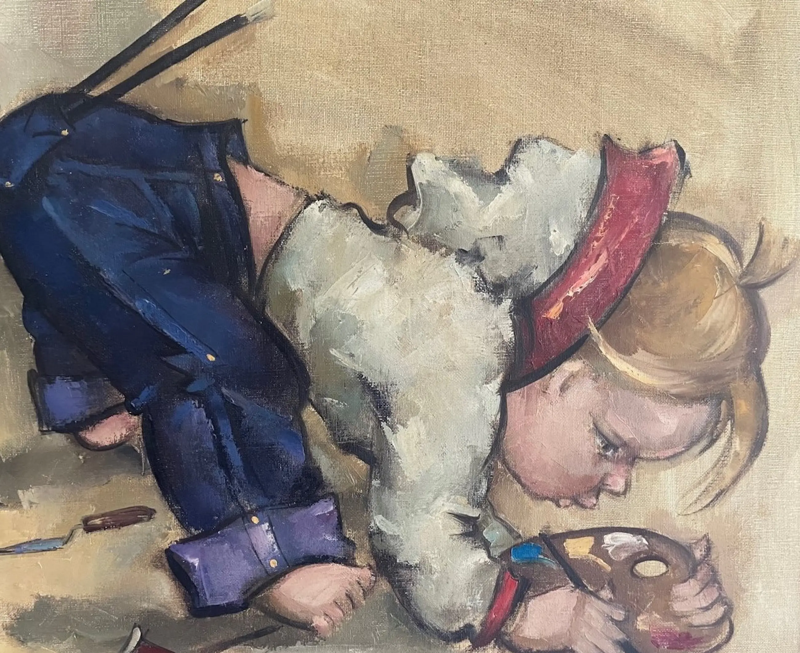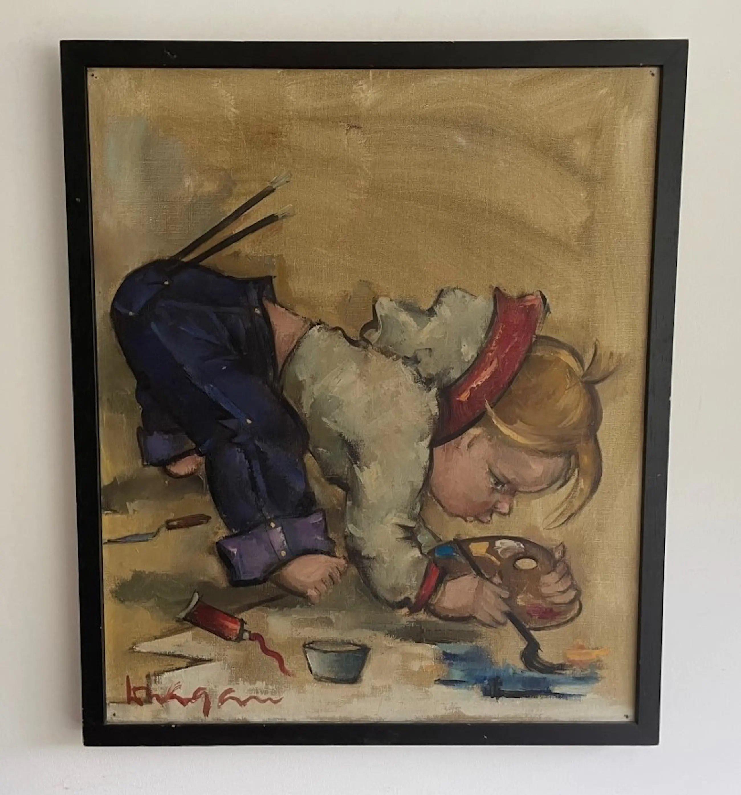 Naief schilderijtje van een spelend kind. Gesigneerd Dragan, Paris'65. Heeft helaas in gaatje in het canvas verder in goede conditie,