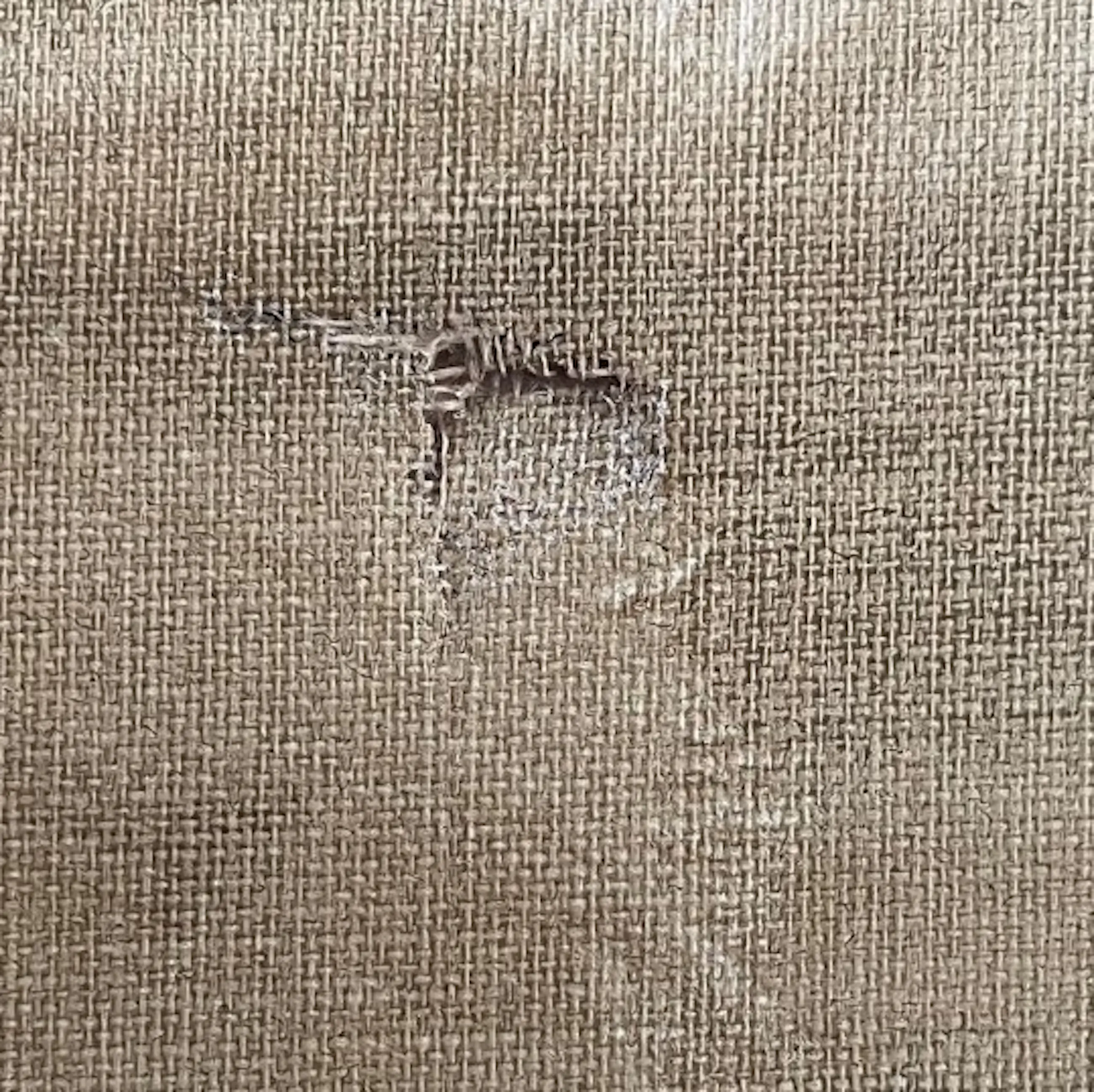 Heeft in gaatje in het canvas (zie foto)