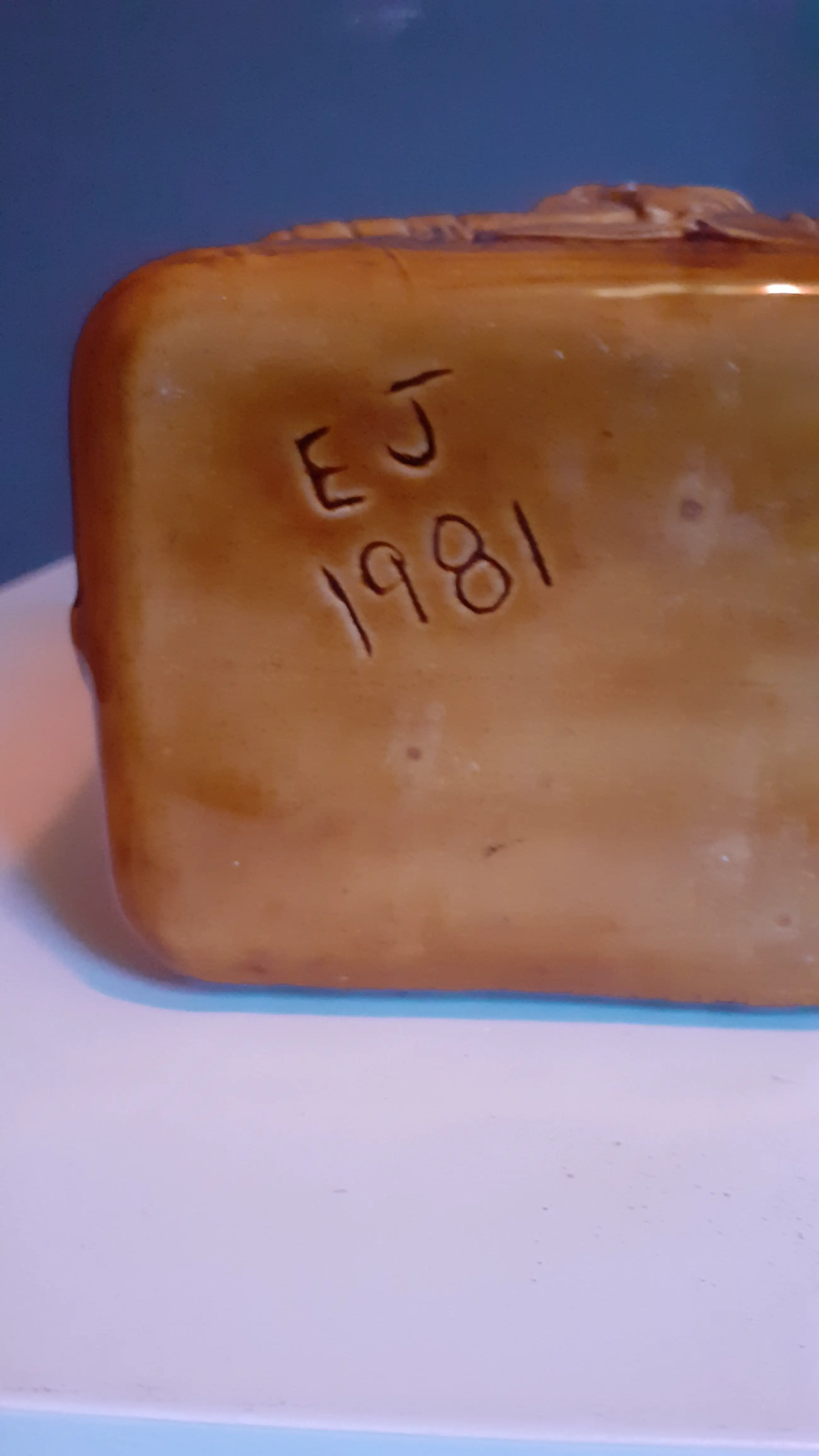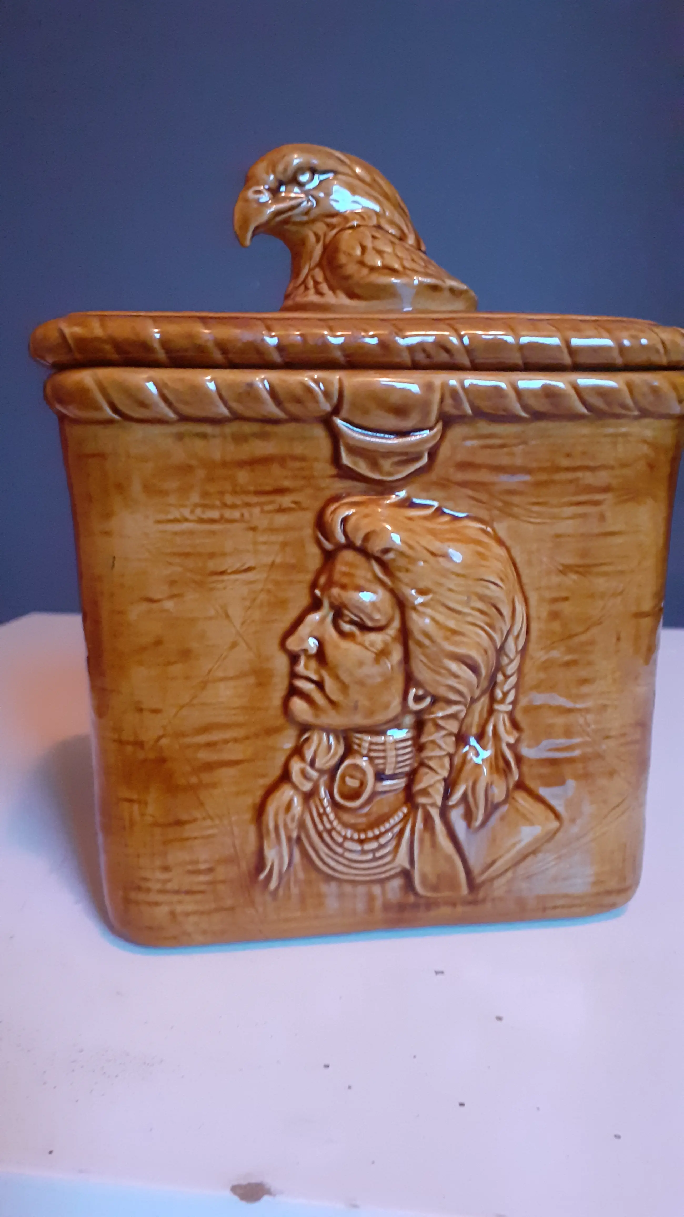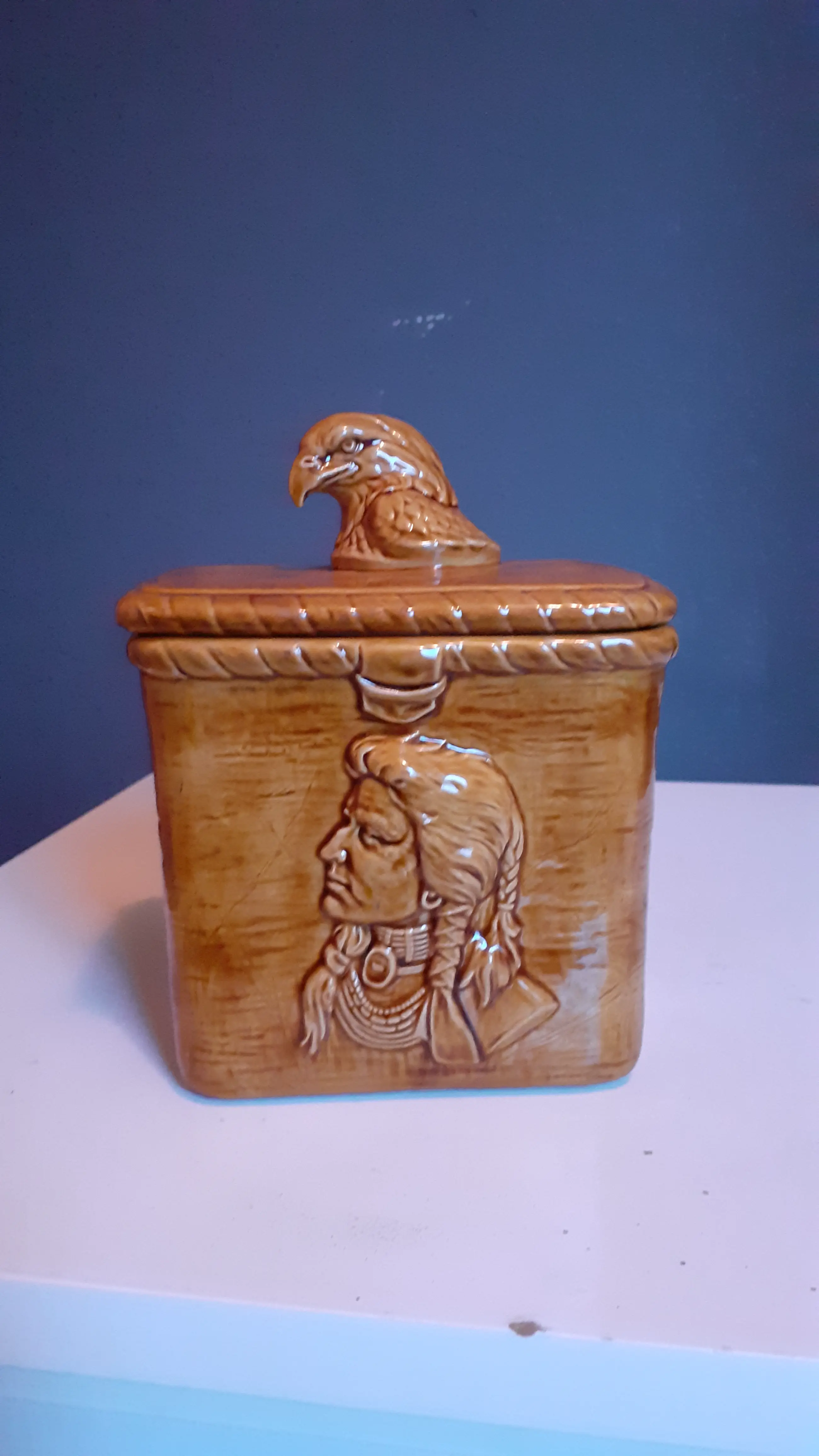 In 1981 door native gemaakt en gesigneerd met E.J. Mooi kwaliteitskeramiek, GEEN toeristenproductie. Tabakspot van geglazuurd keramiek, kleur lichtbruin. Symbolen van vredespijp, Adelaar en native indian. Gedetailleerd