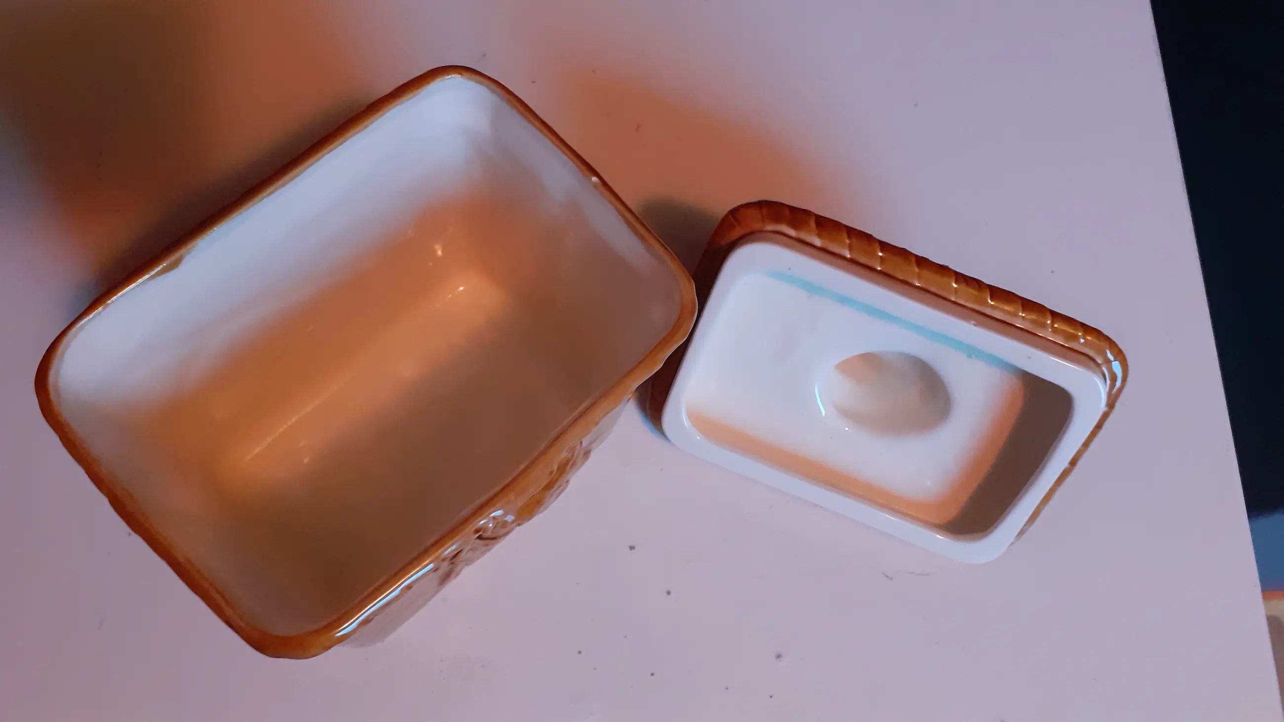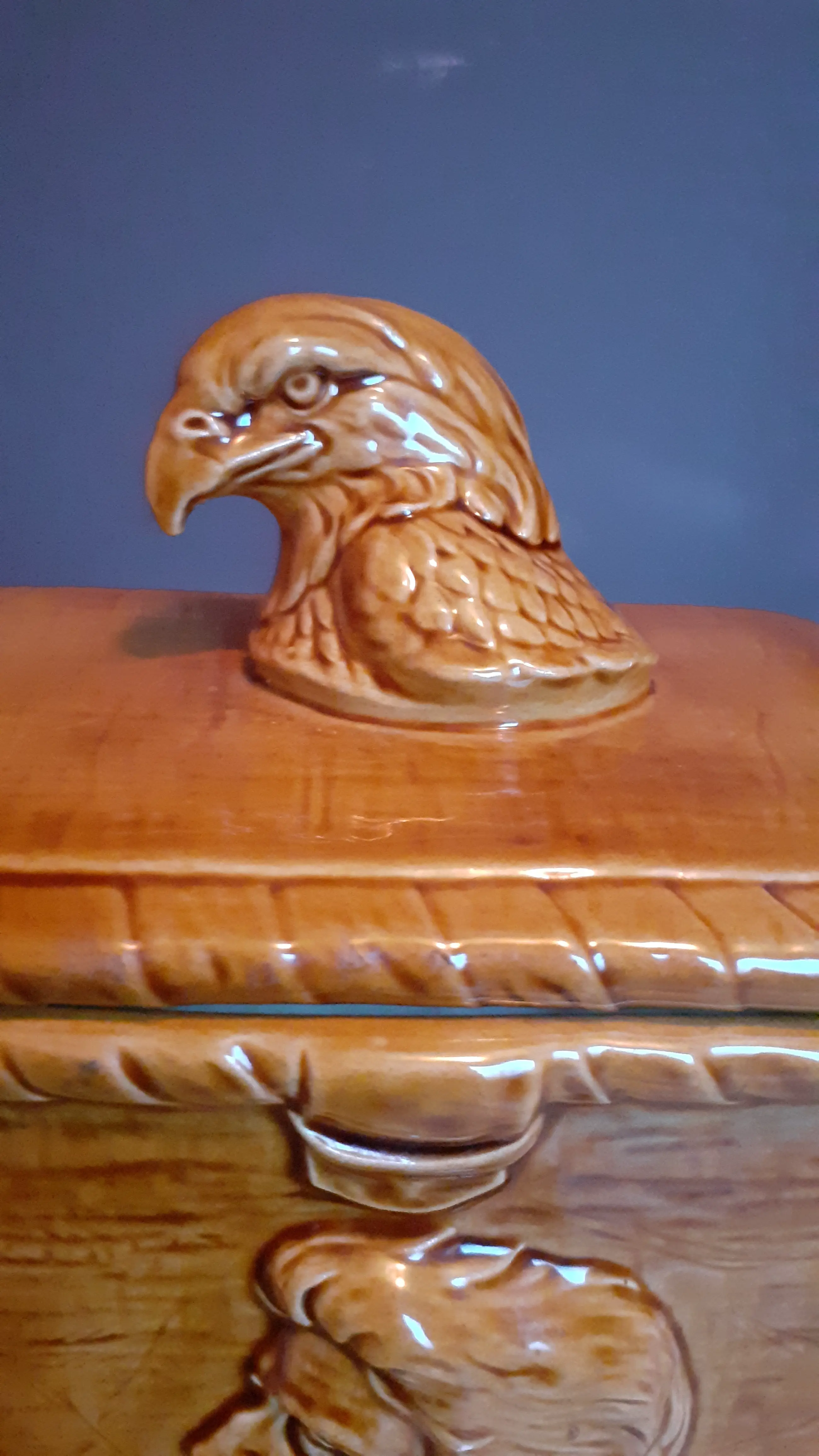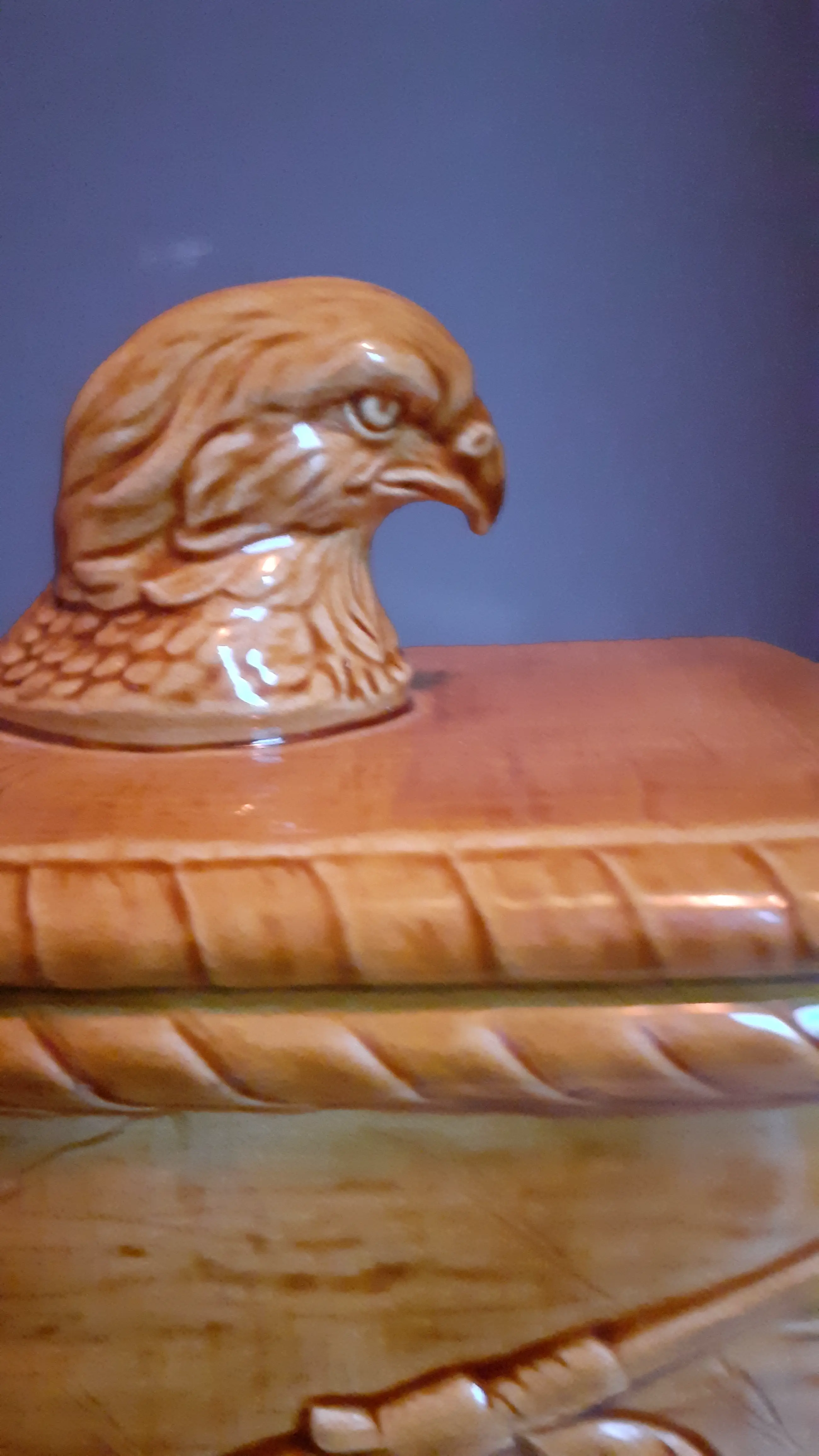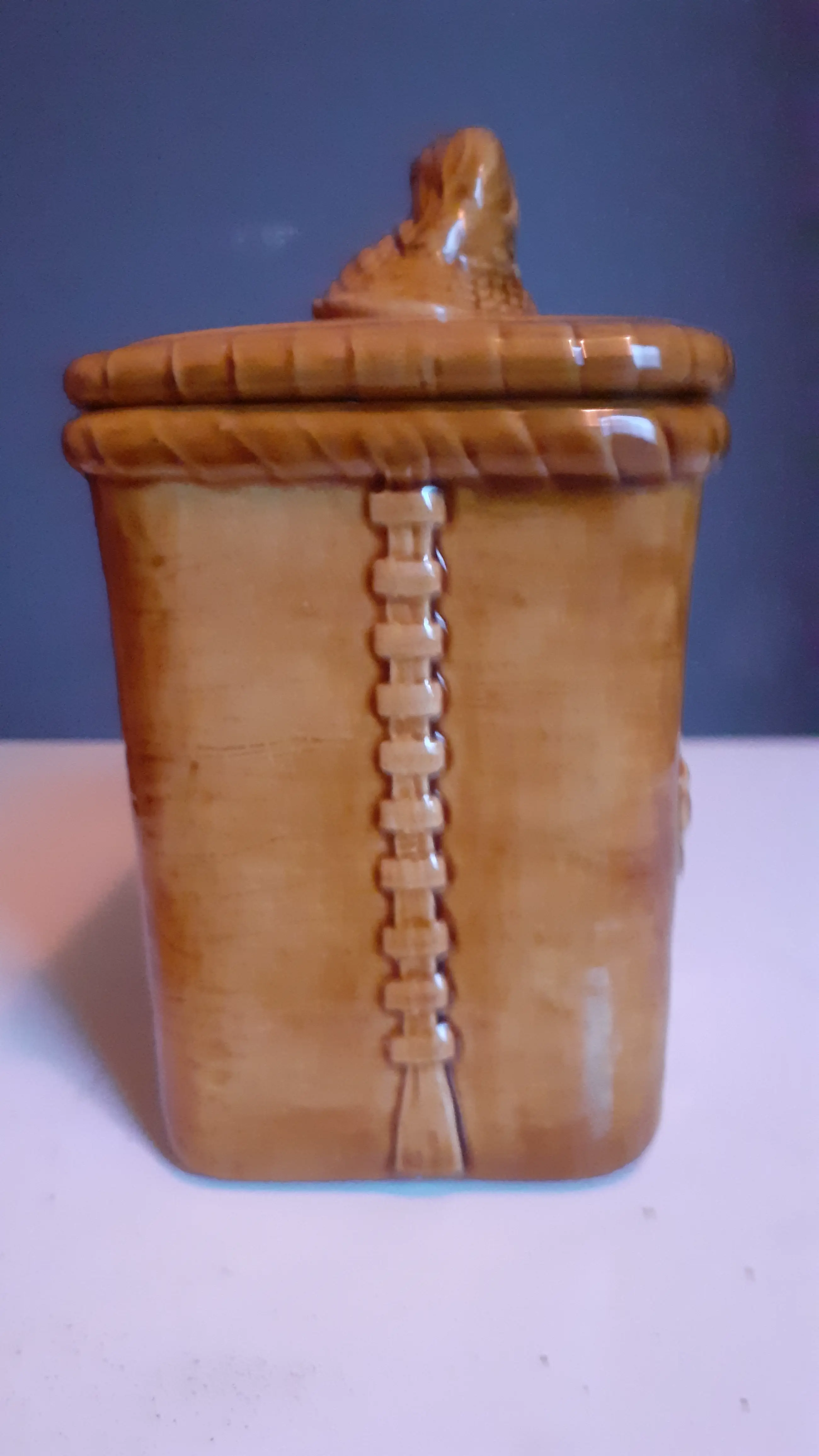 In 1981 door native gemaakt en gesigneerd met E.J. Mooi kwaliteitskeramiek, GEEN toeristenproductie. Tabakspot van geglazuurd keramiek, kleur lichtbruin. Symbolen van vredespijp, Adelaar en native indian. Gedetailleerd