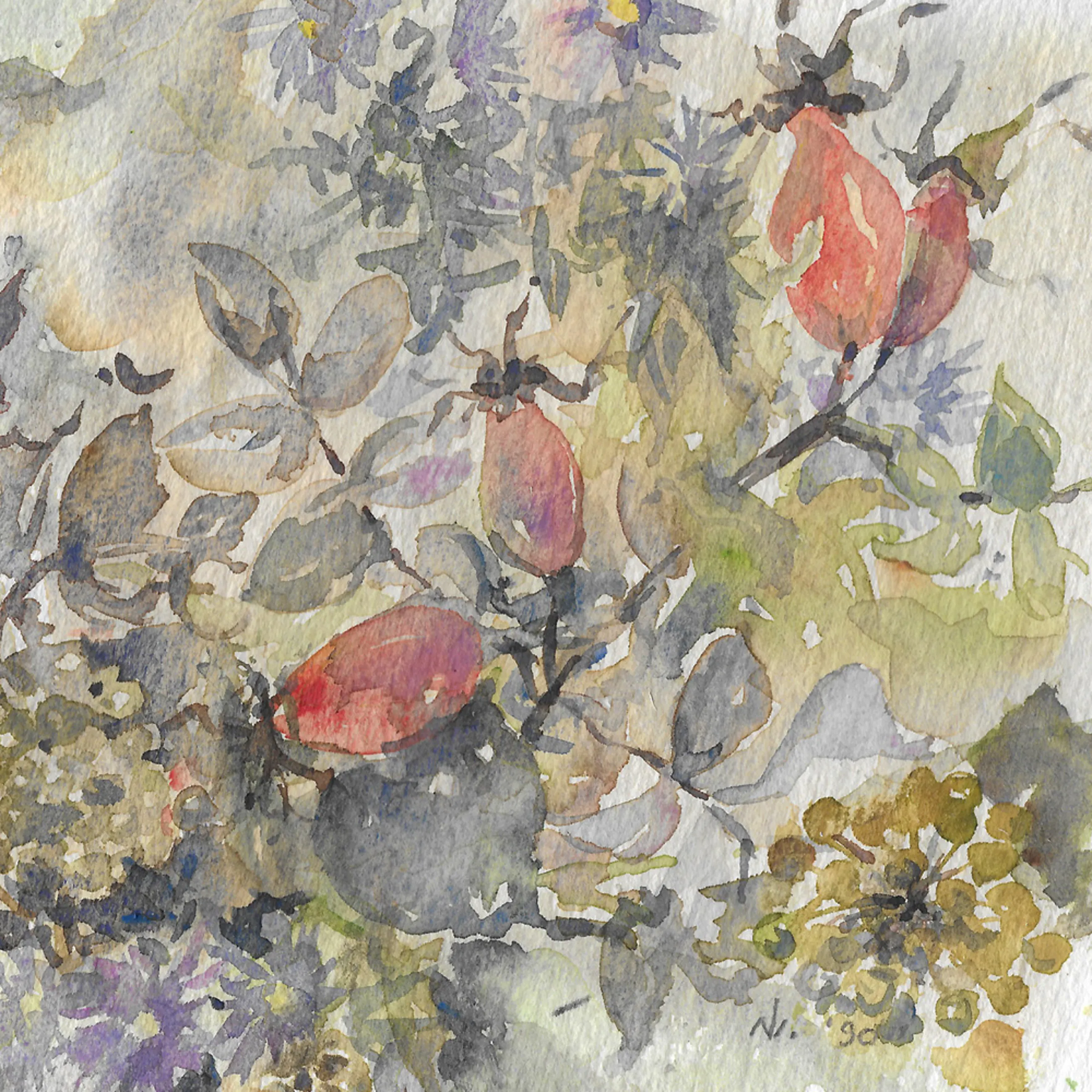 Betreft een aquarel van Nel Vreugdenhil-Verhave uit 1990. Werk in herfstkleuren. Rechtsonder gesigneerd met monogram 'NV' en gedateerd '90'.