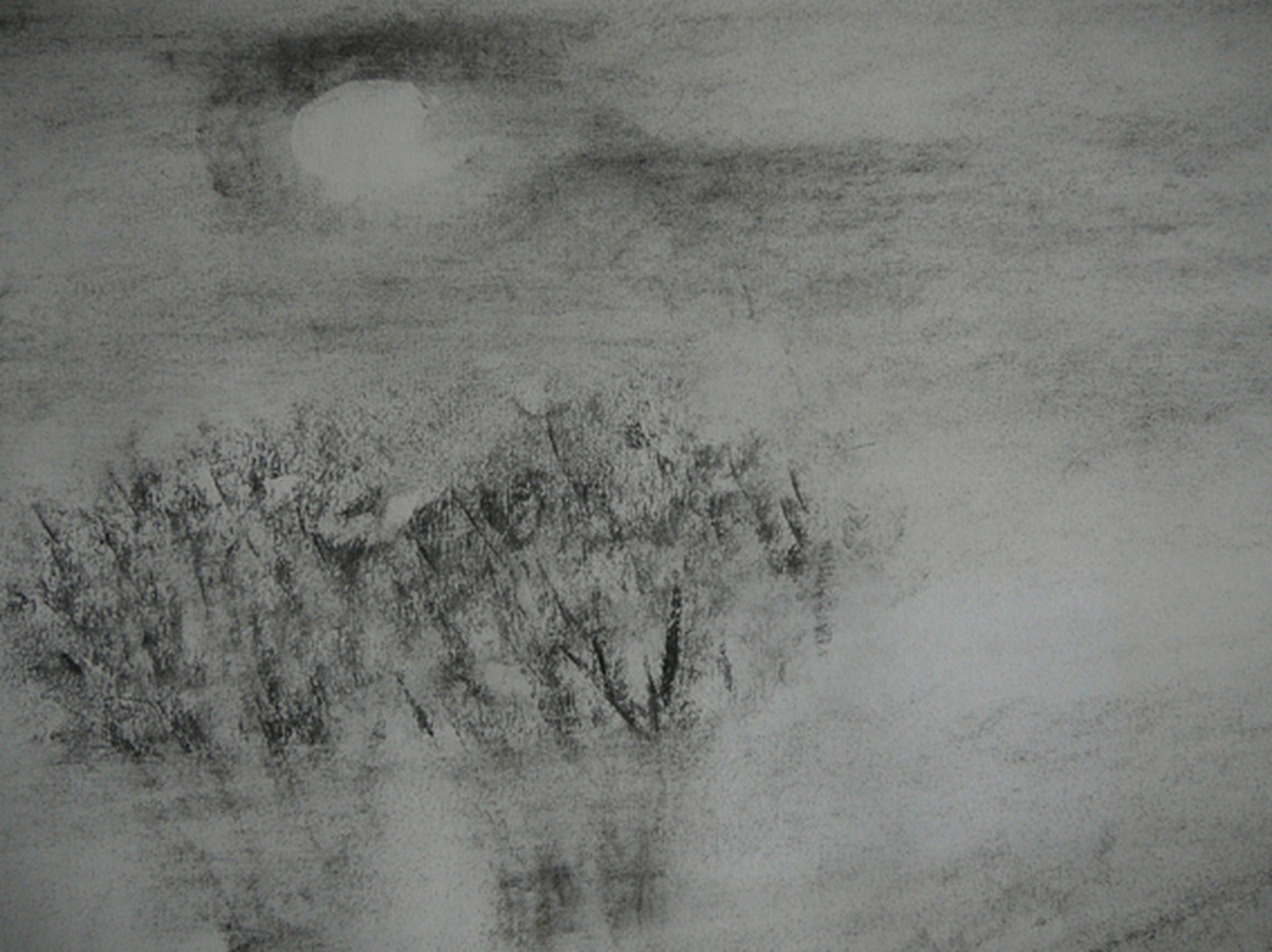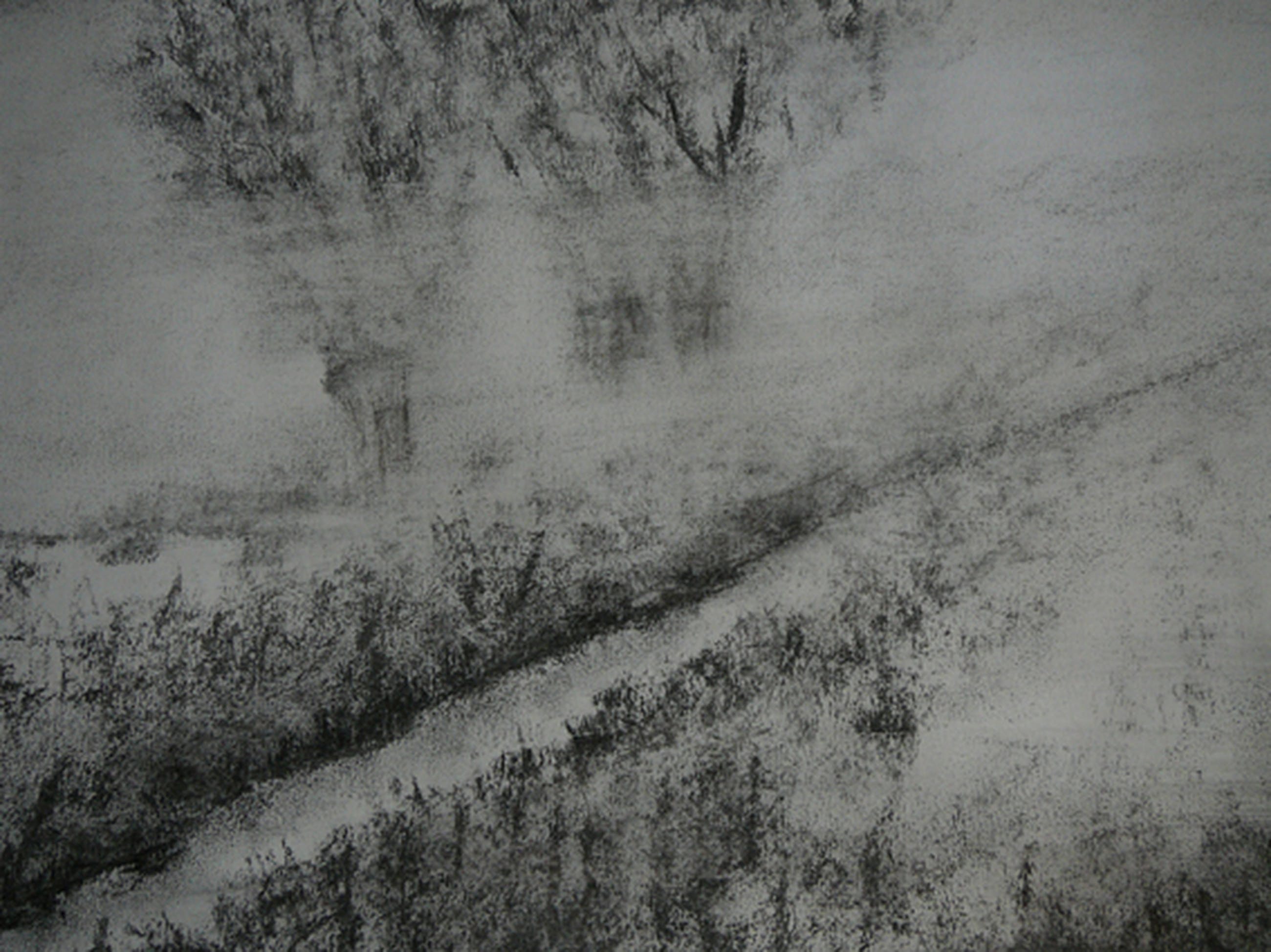 Buitengewoon fascinerende houtskooltekening voorstellende een beneveld polderlandschap bij zonsopkomst. Maximaal diffuus effect door toepassing van houtskooltechniek. Interessant is tevens de relatief hoge positie van waaruit de kunstenaar deze tekening heeft gemaakt. Het werk is rechts-onder 'gesigneerd' met F. door een mij niet bekende kunstenaar.