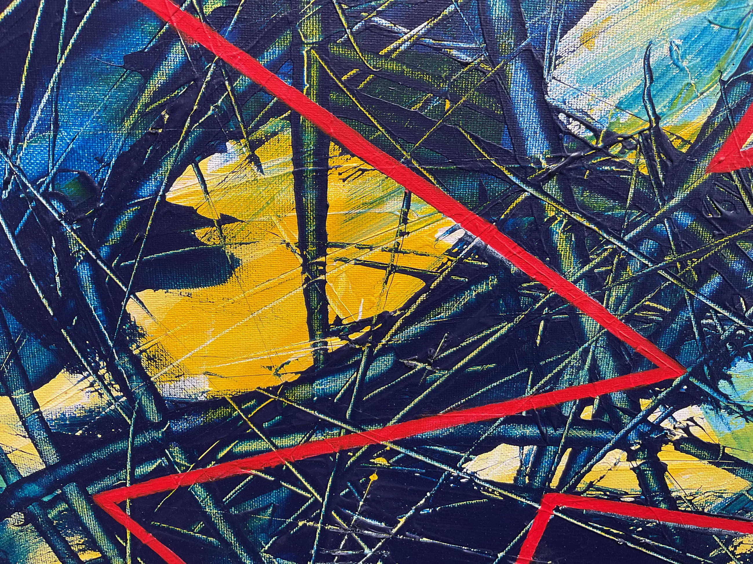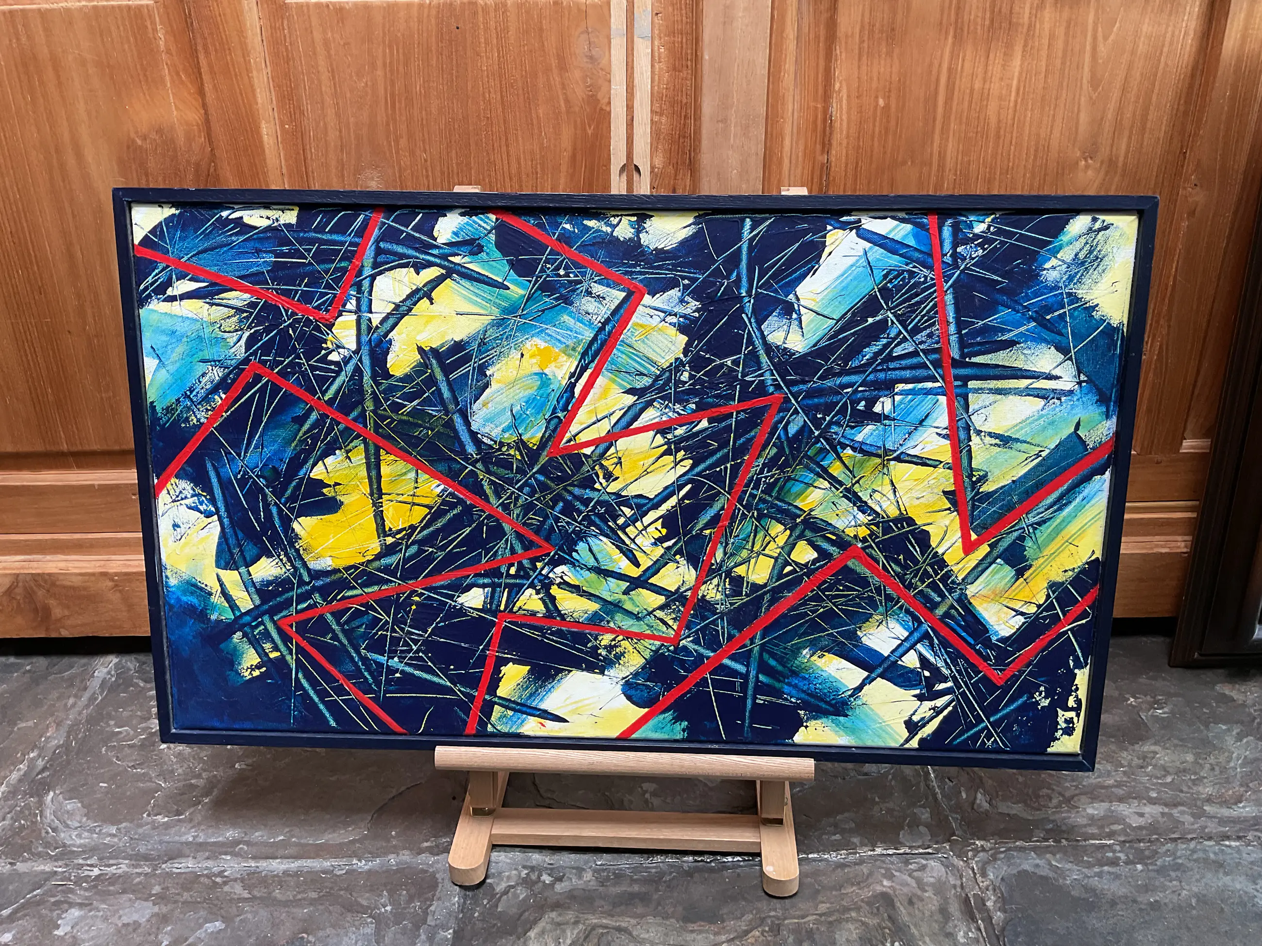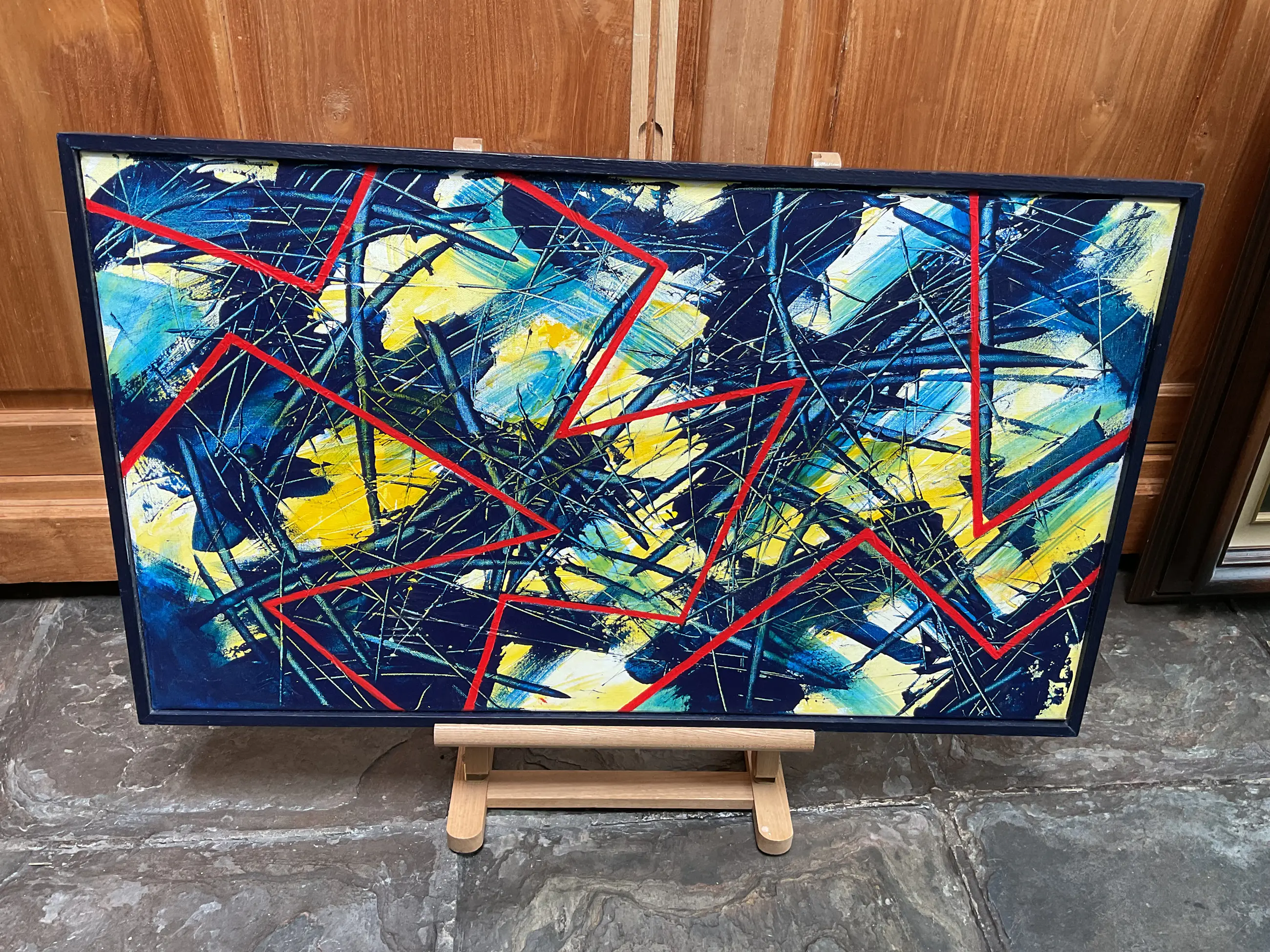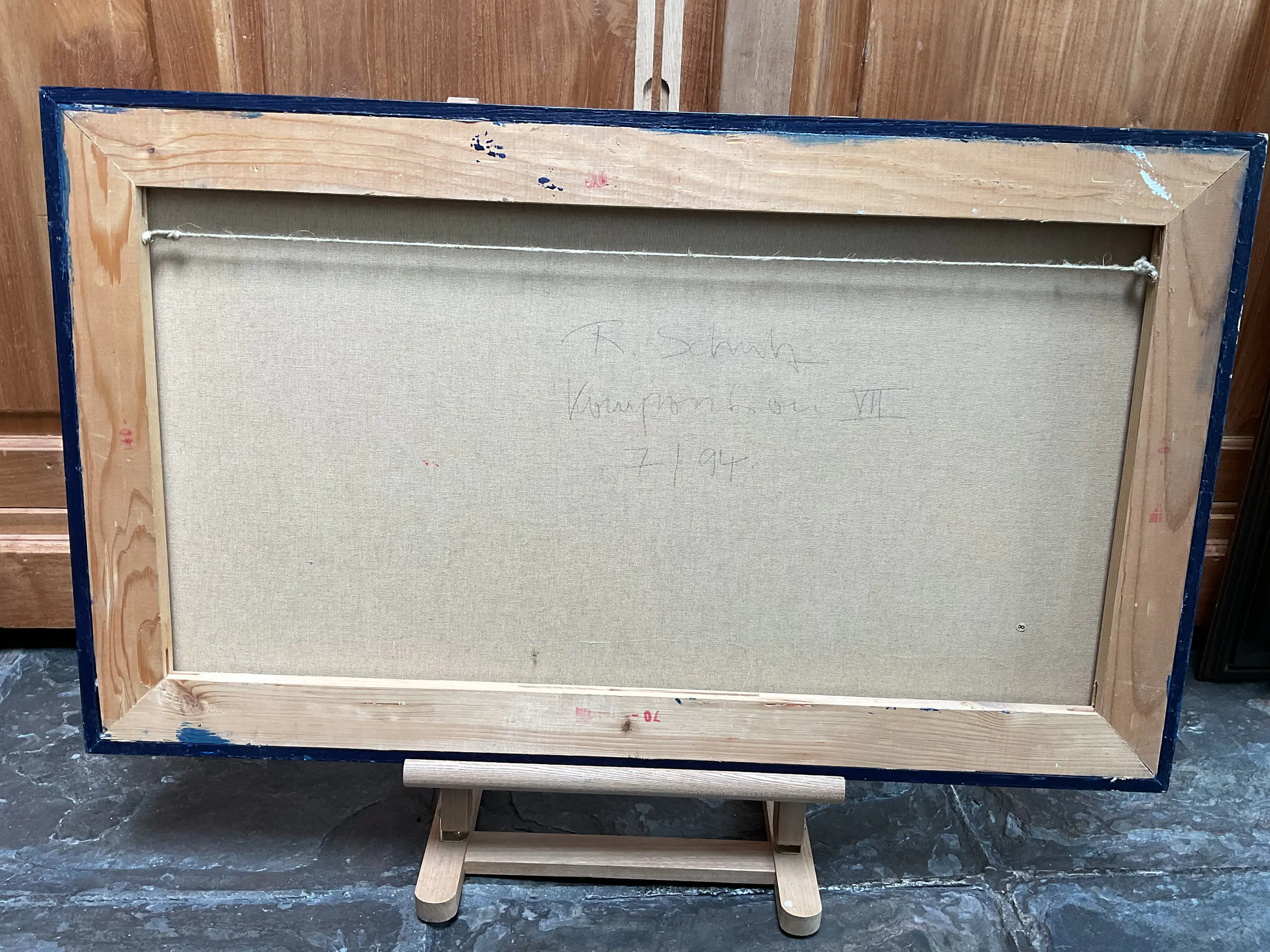 Abstract werk. Is op de achterkant van het doek beschreven. Waarschijnlijk de naam en titel en de datum.