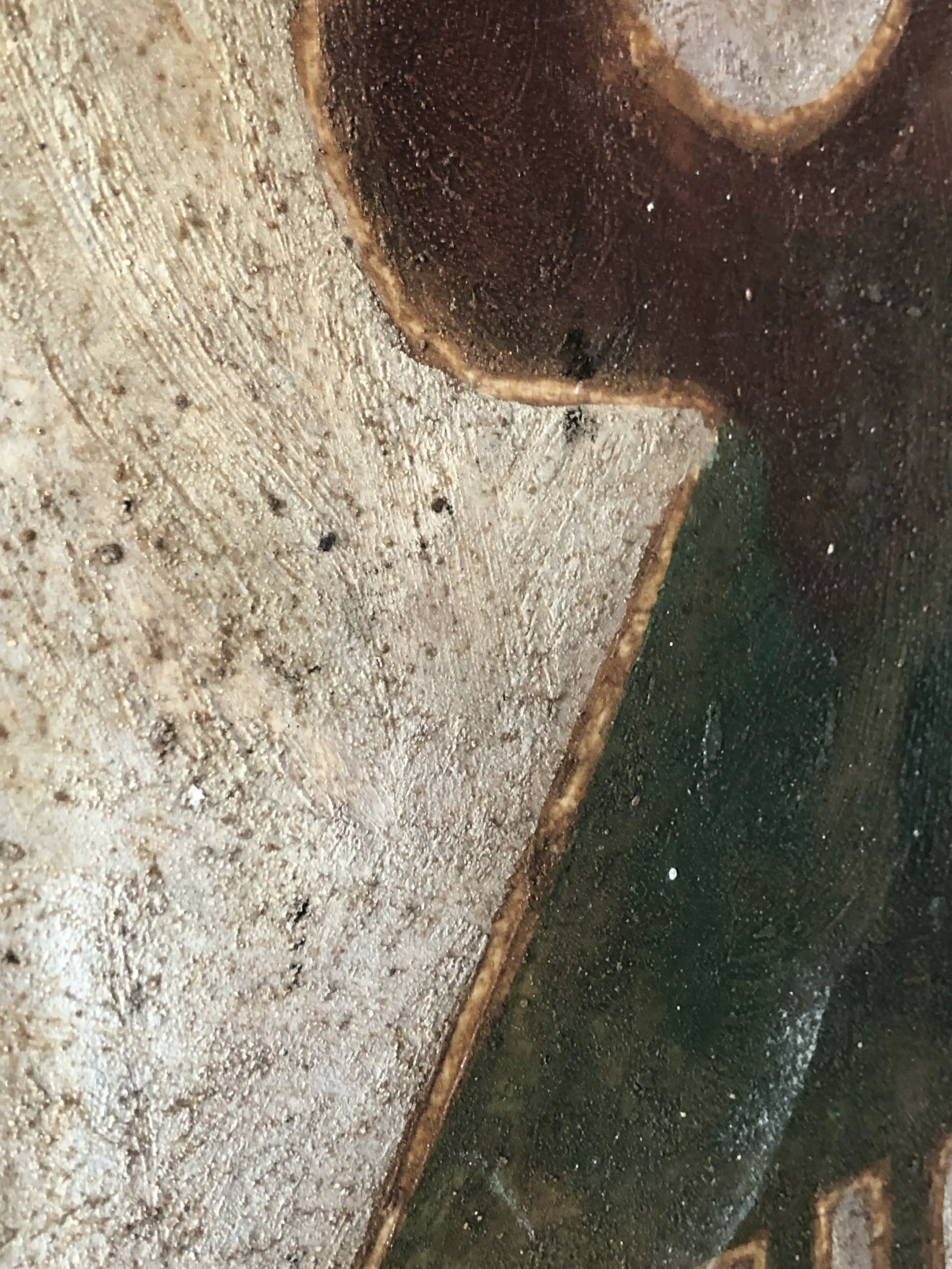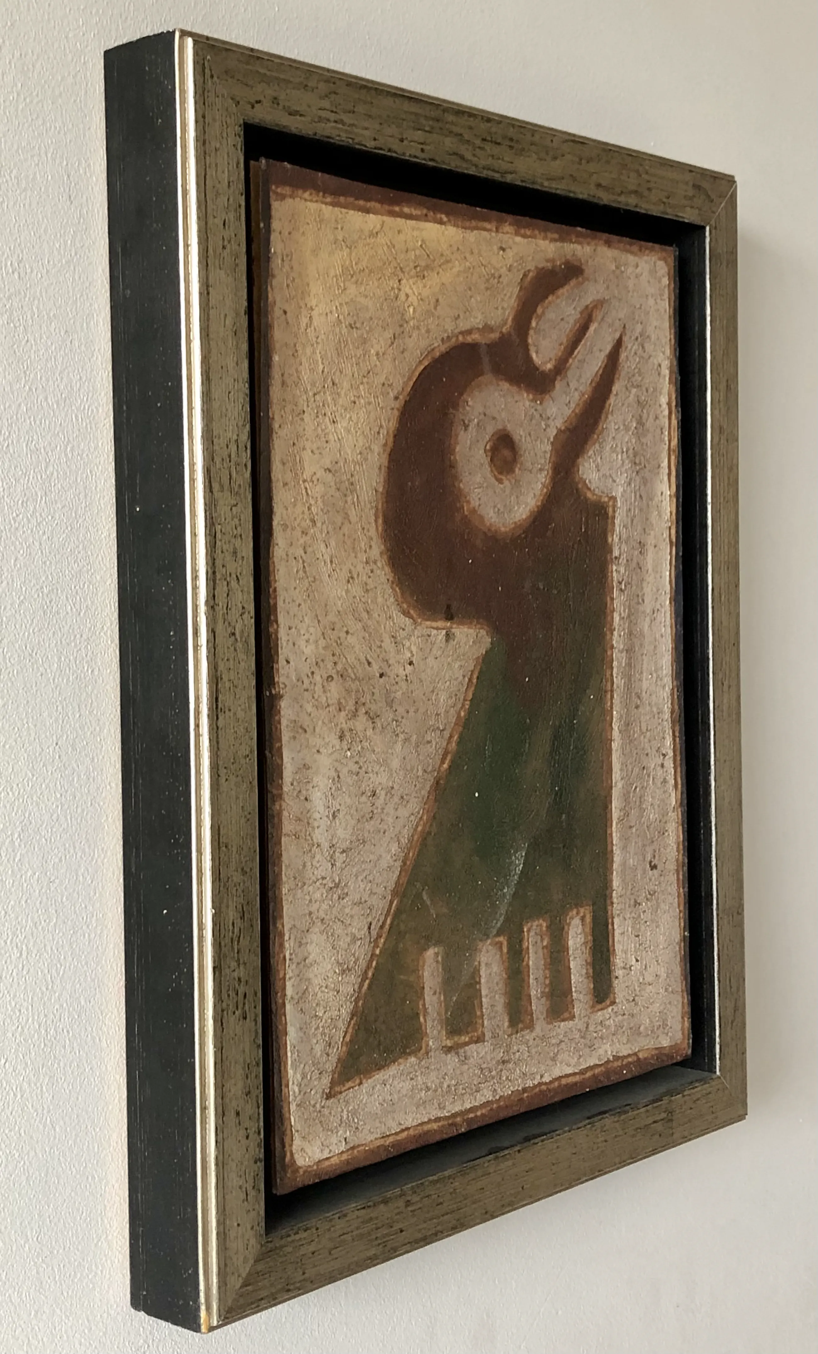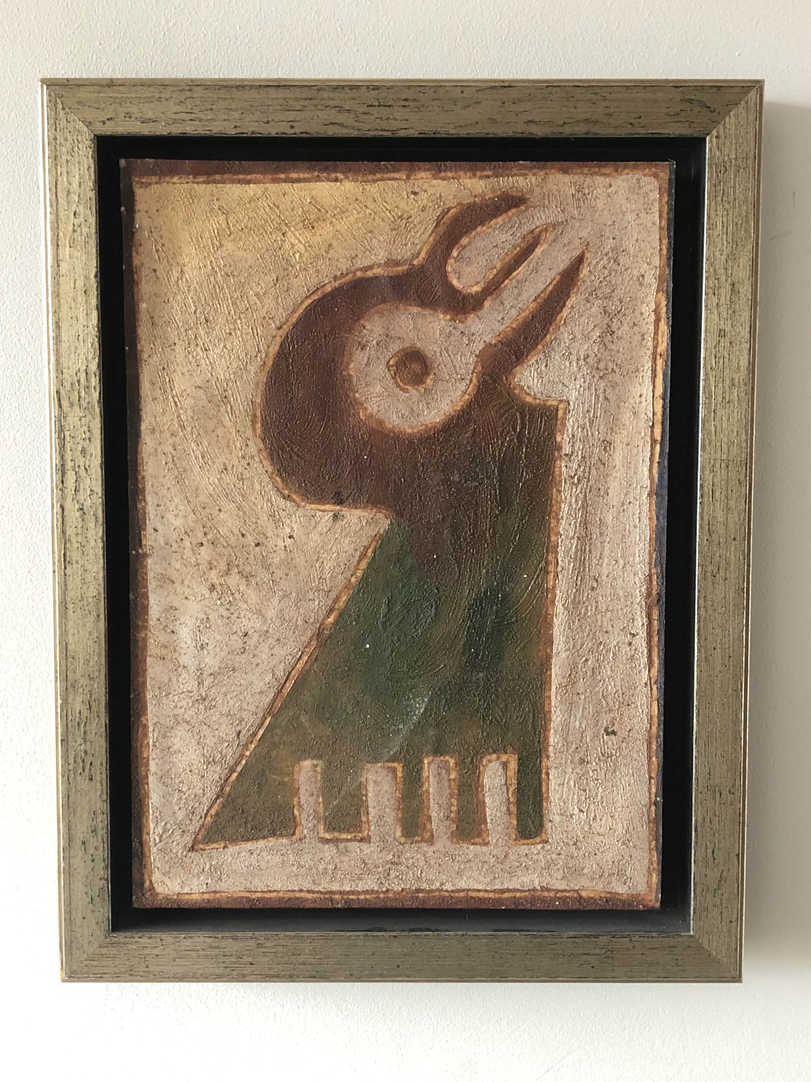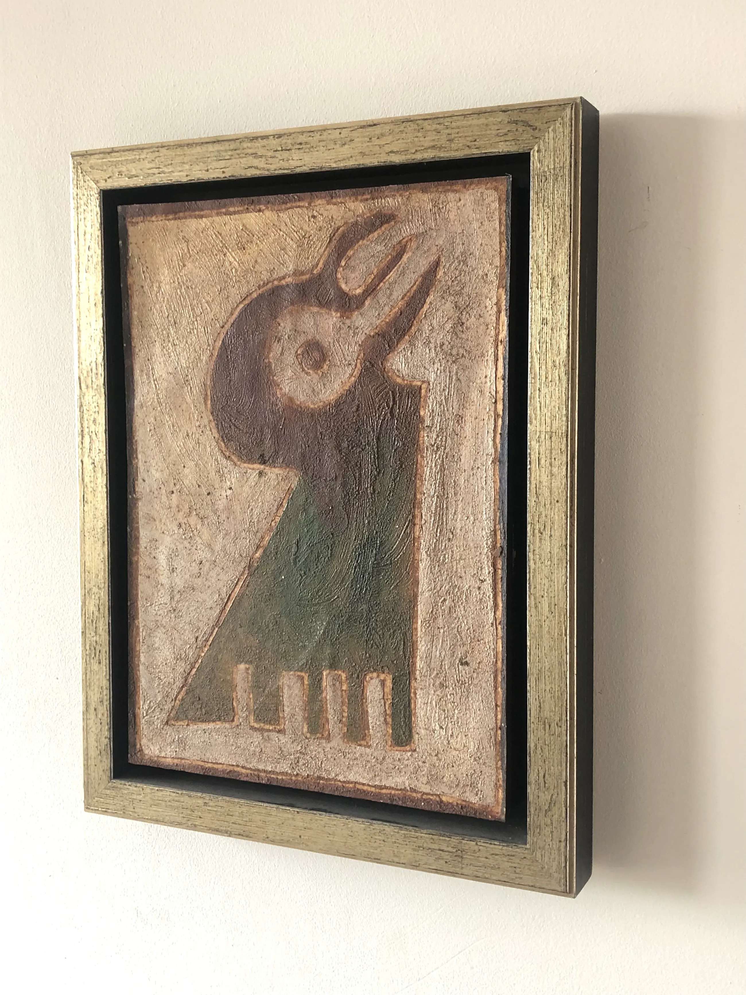 Fascinerend werk van een ons onbekende kunstenaar. Olieverf met (vermoedelijk) zand waardoor er een grove structuur onstaat. Papier op paneel gevat in een nette baklijst.