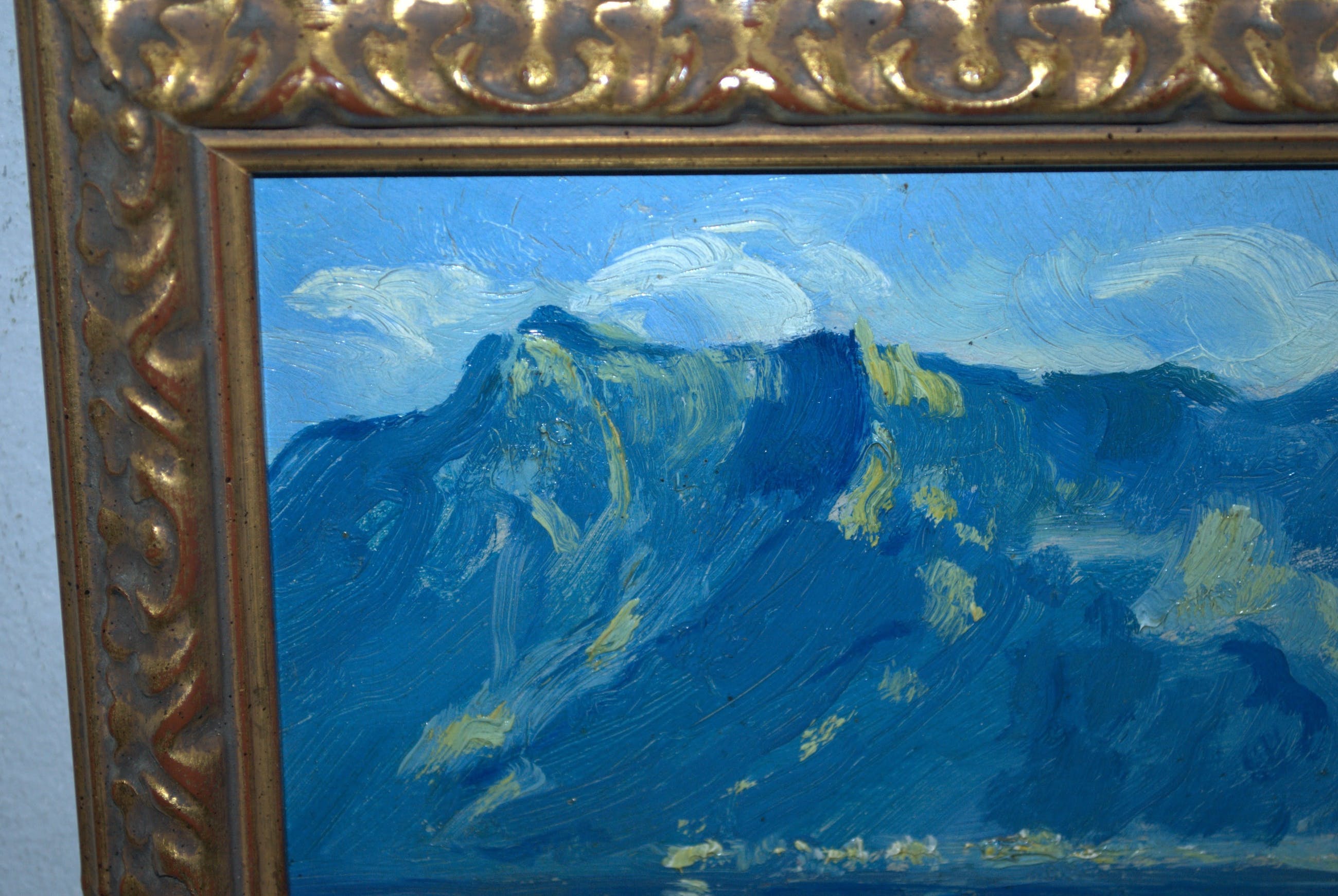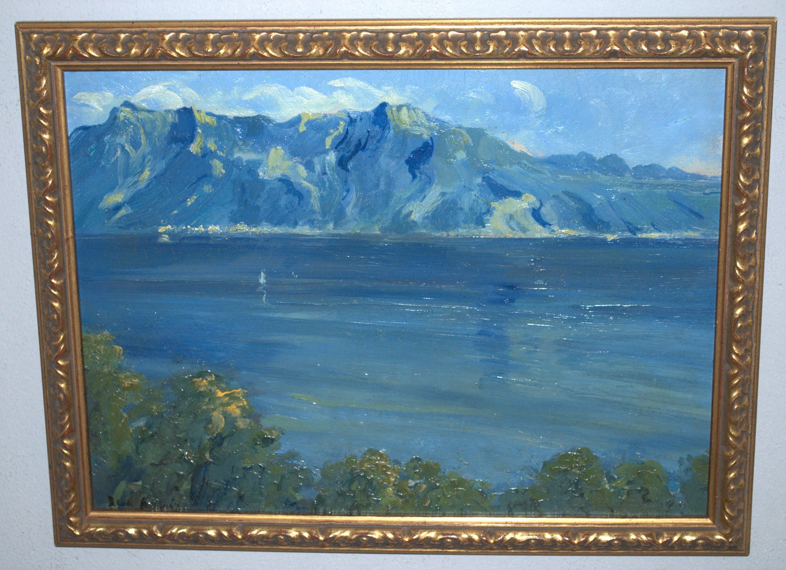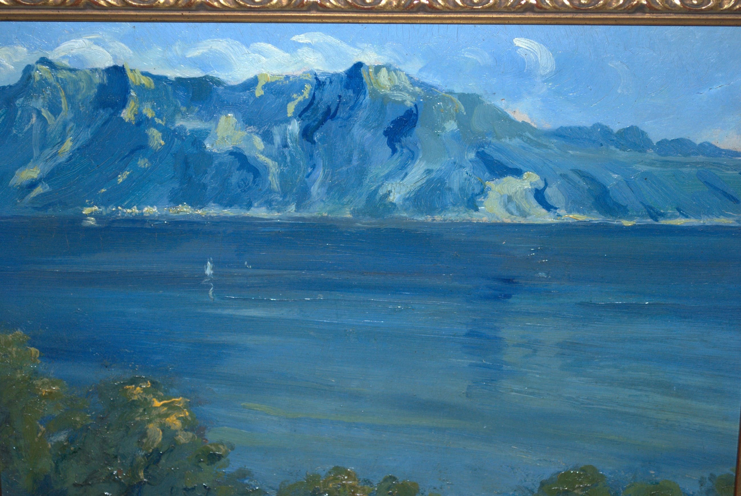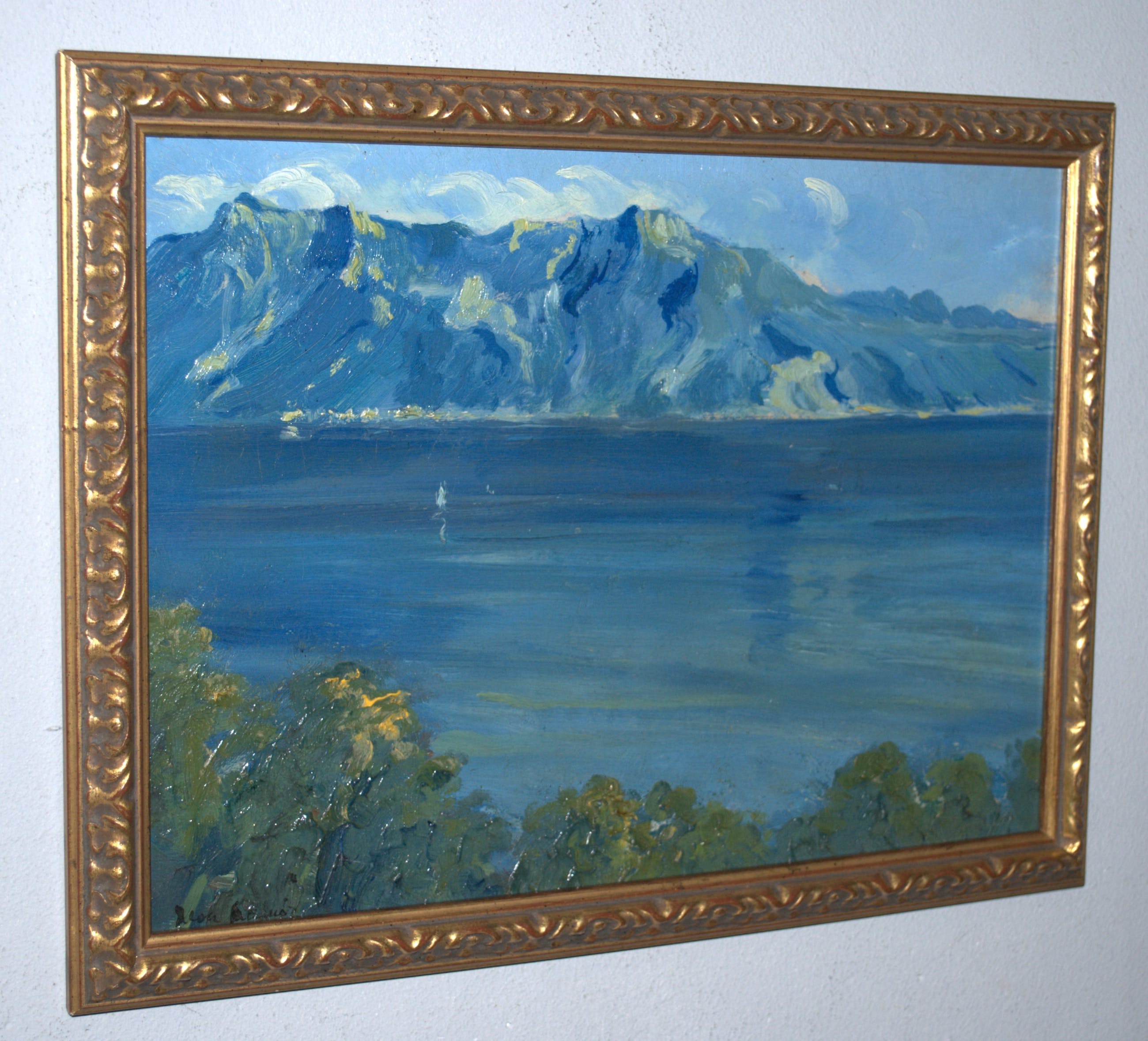 Niet of onleesbaar gesigneerd - olieverf 1e helft 20eE, mogelijk Frans - uitzicht op water en bergen kopen? Bied vanaf 10!