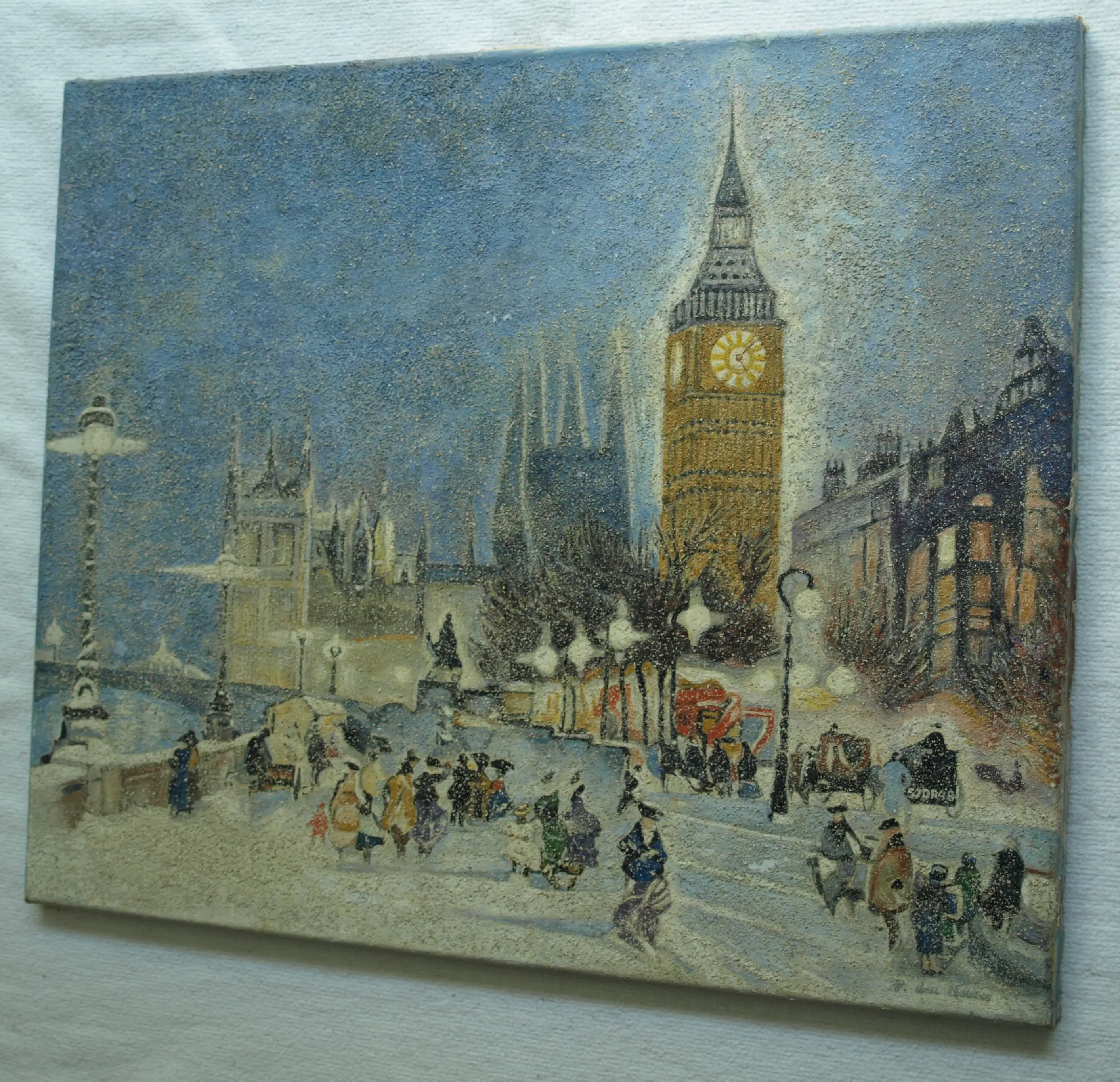 Een schilderij van een ons onbekende kunstenaar. Helaas is de signatuur moeilijk te lezen….. -Gemengde techniek: olieverf en zand op doek, opgespannen op een houten spieraam. -Gesigneerd rechtsonder. Jaartal onbekend. -Afmetingen: Spieraam, 50 x 60 x 2 cm. -Herkomst: Uit een inboedel. -Conditie: In goede staat met lichte slijtplekjes. Zie ook de foto’s voor een eigen indruk.