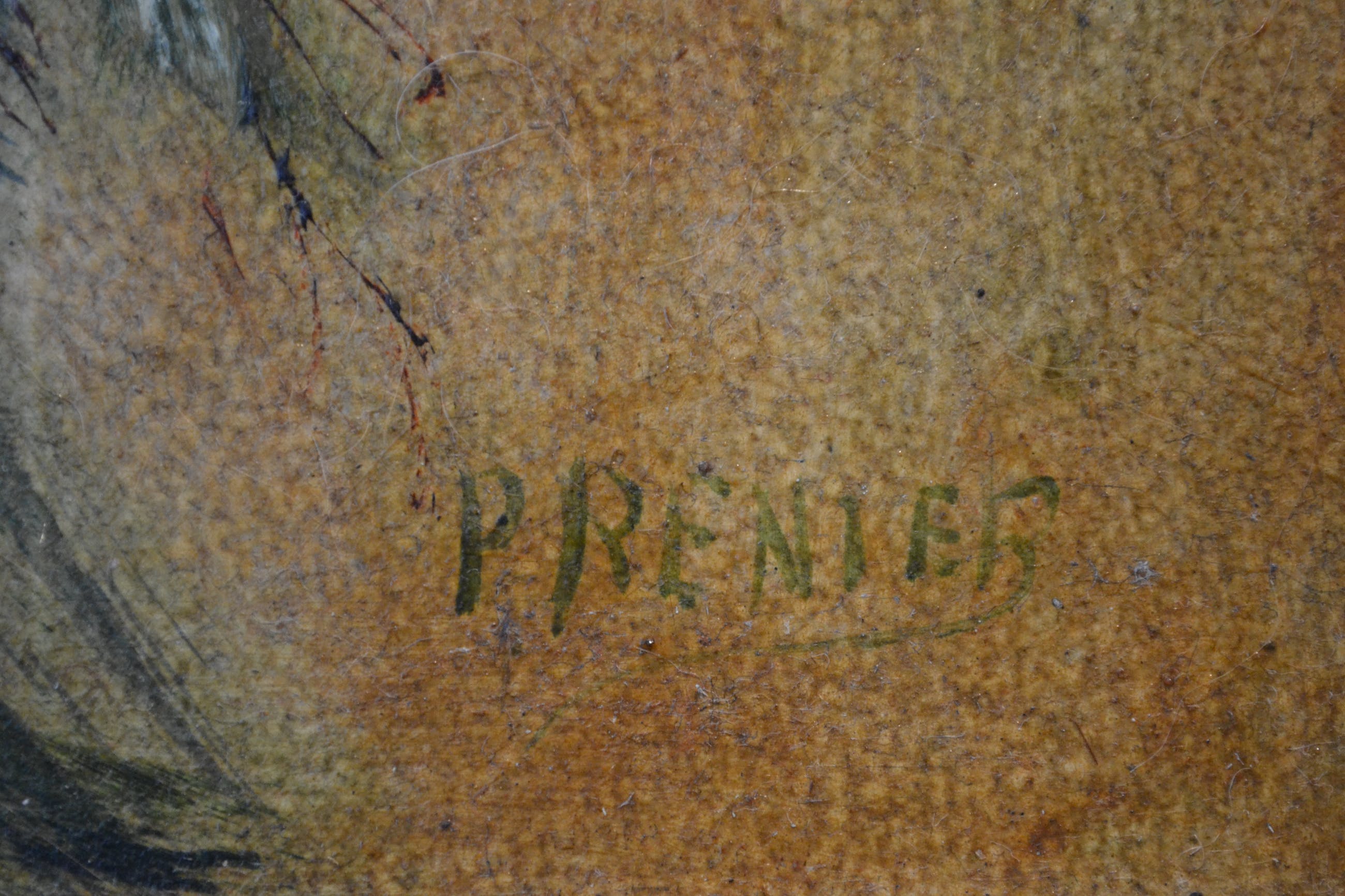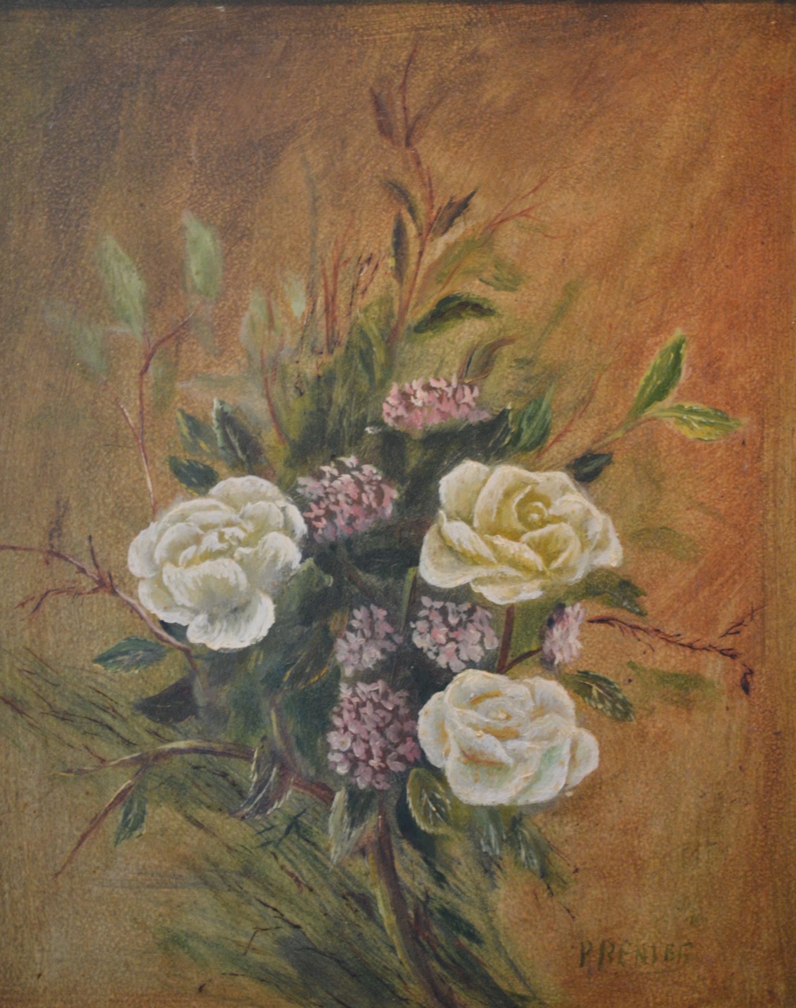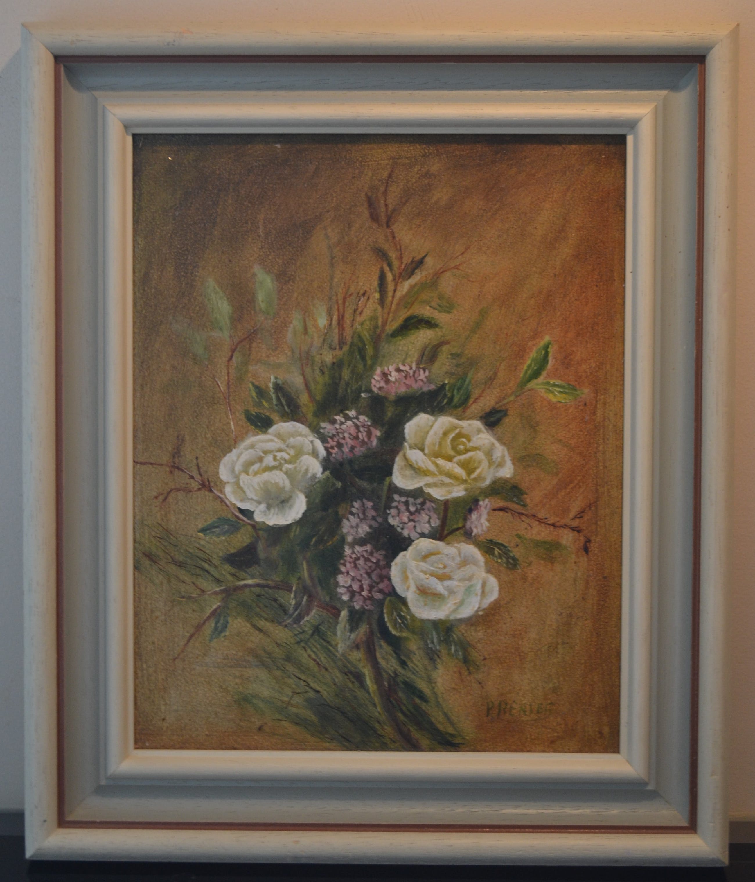 Bloemstilleven. Olieverf op board, r.o. gesigneerd maar moeilijk leesbaar (P. Renier?). In goede staat.
