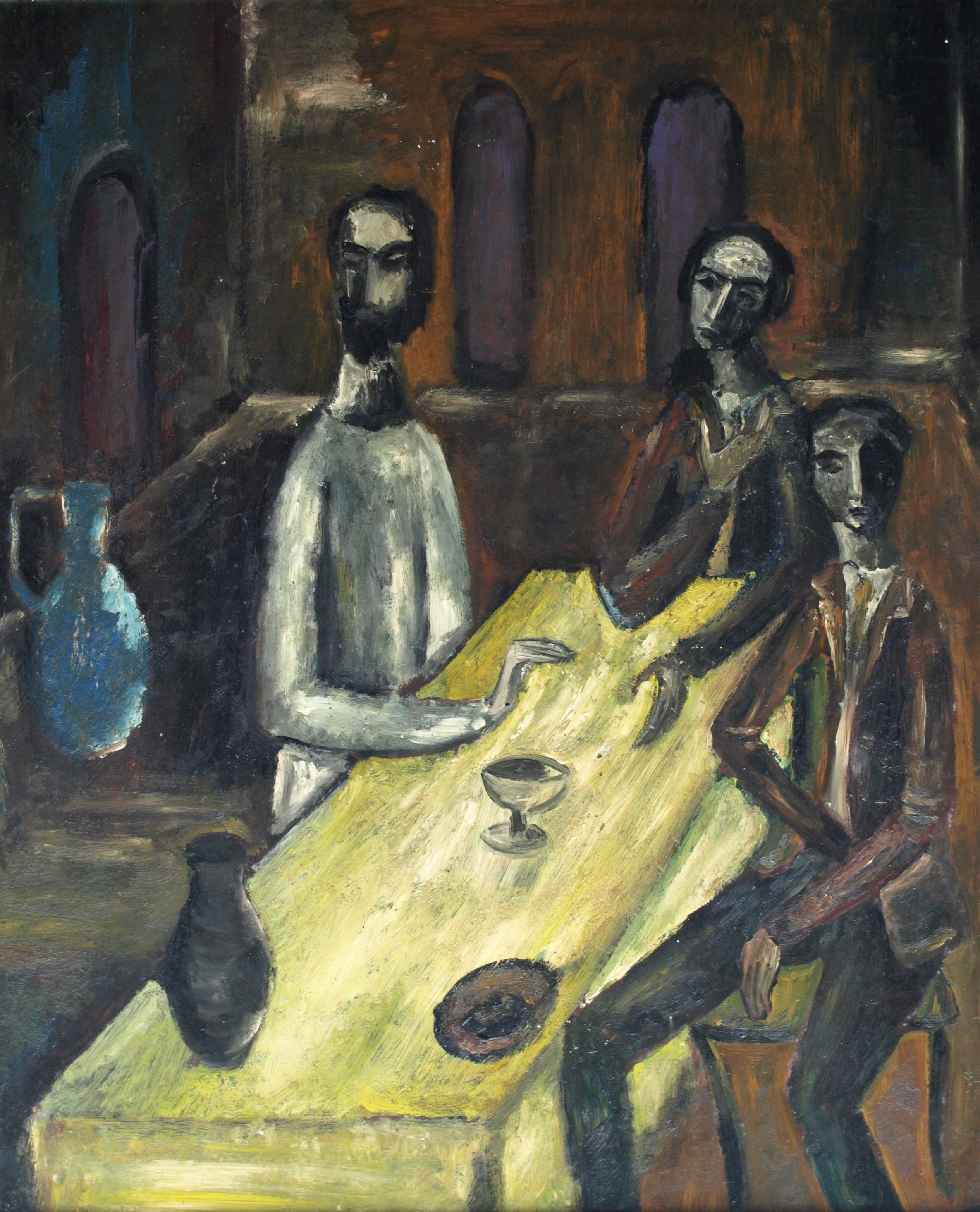 Onbekend - Olieverf op board , “Aan de tafel” – gesigneerd & ingelijst - Verkocht