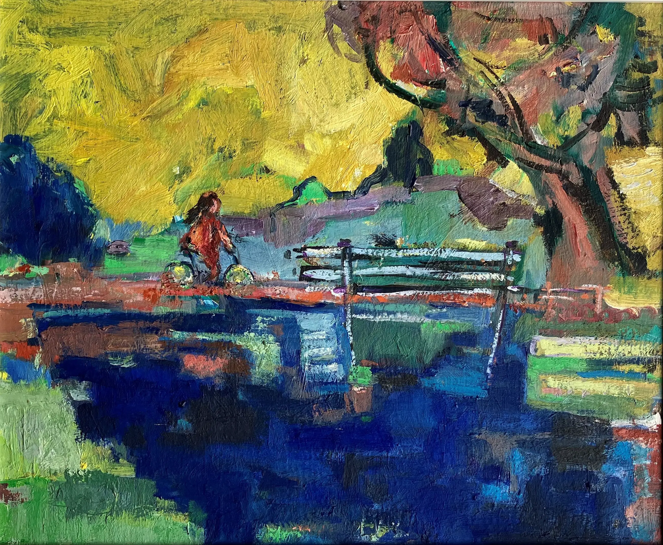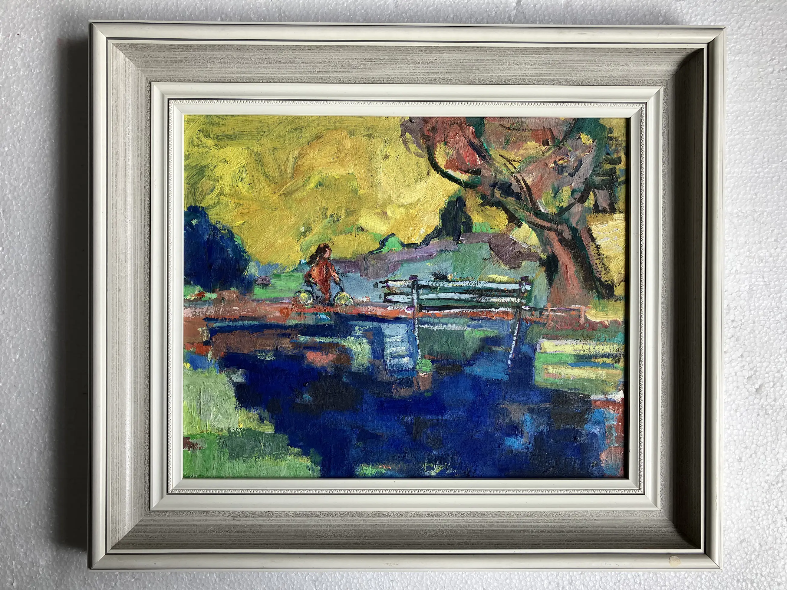 Zeer fraai kleurrijk schilderij met fietsende vrouw in landschap. De sticker met naam verso zou de schilder kunnen zijn of een vroegere eigenaar. Niet gesigneerd maar doet erg denken aan het werk van Eef van Brakel.