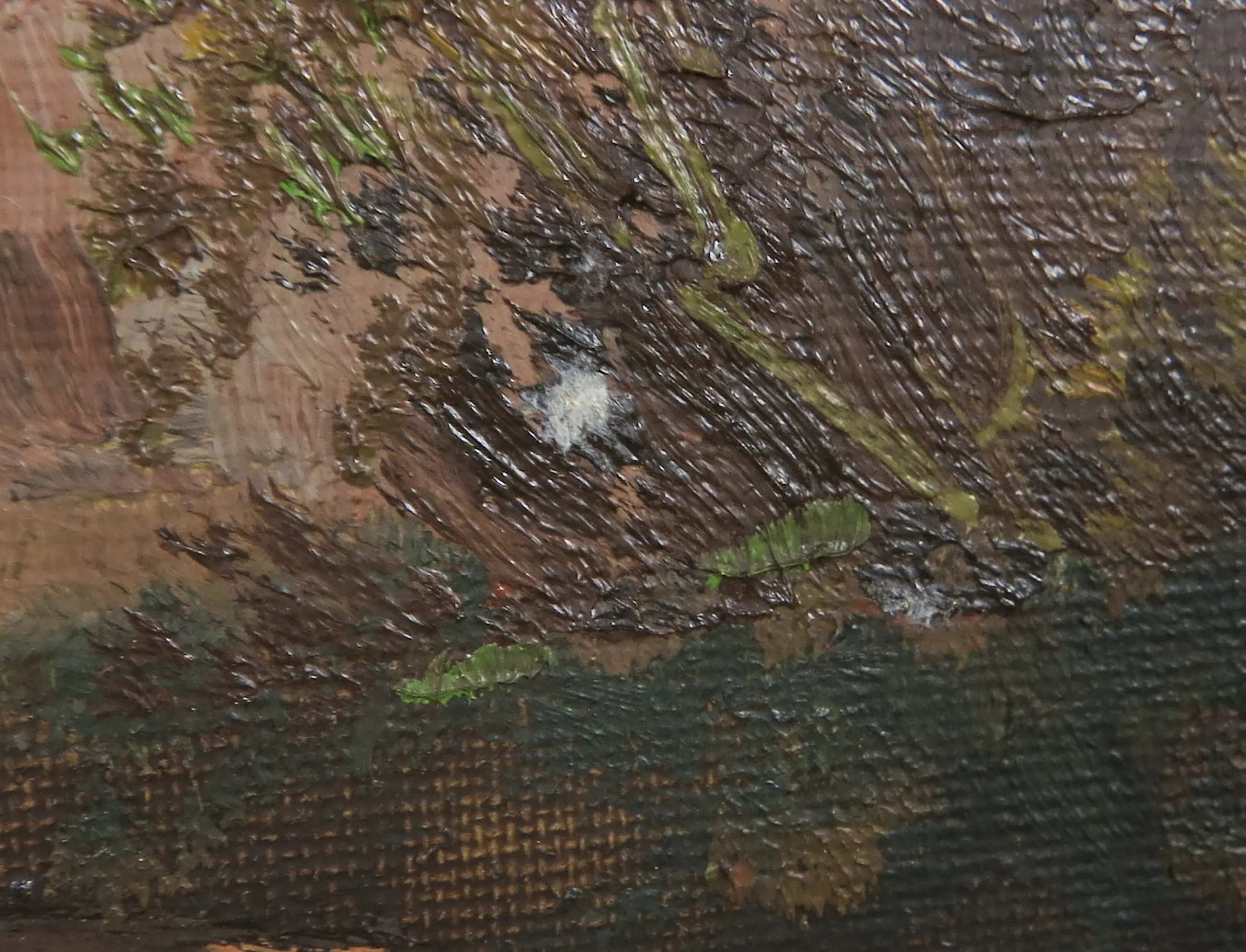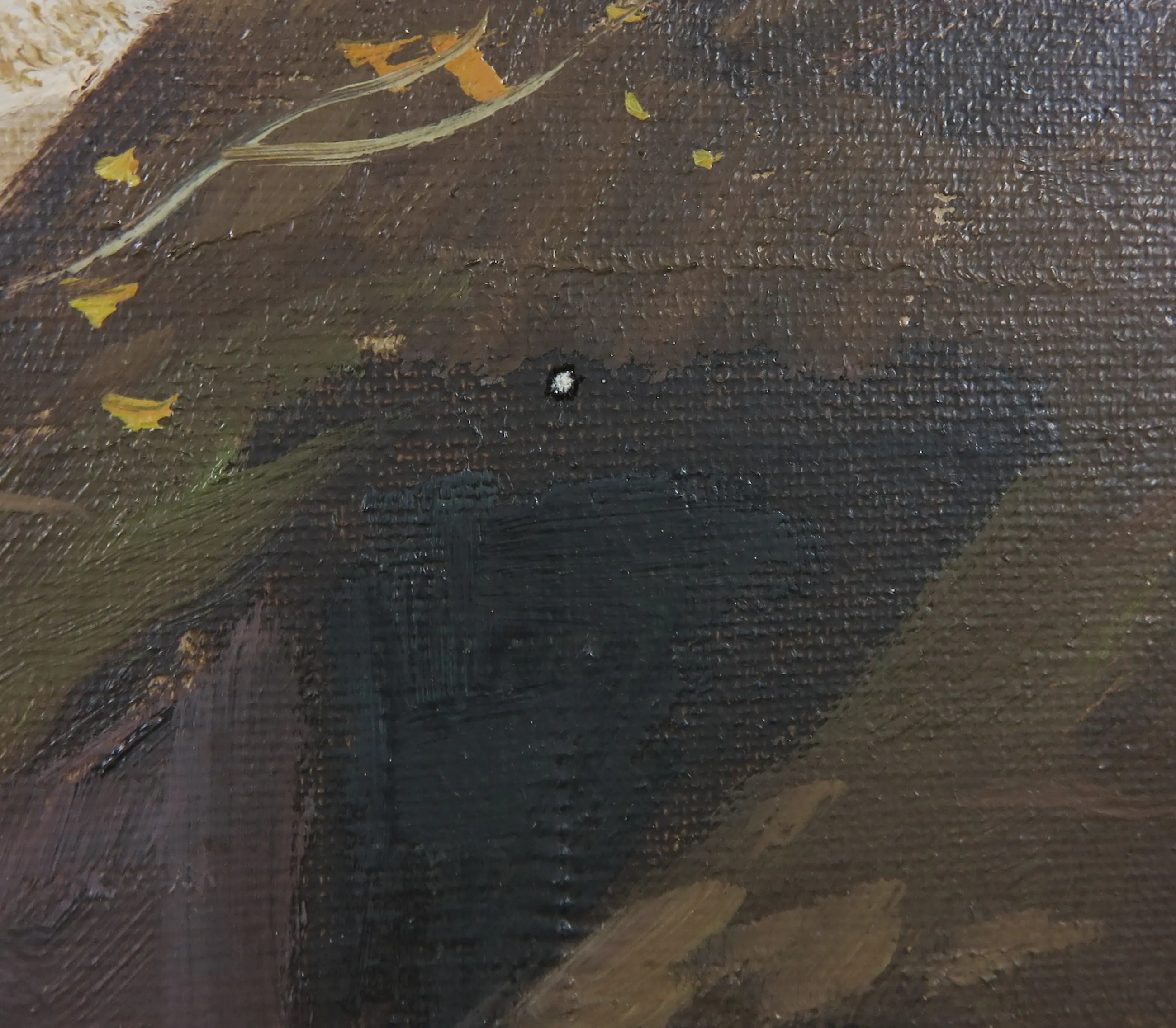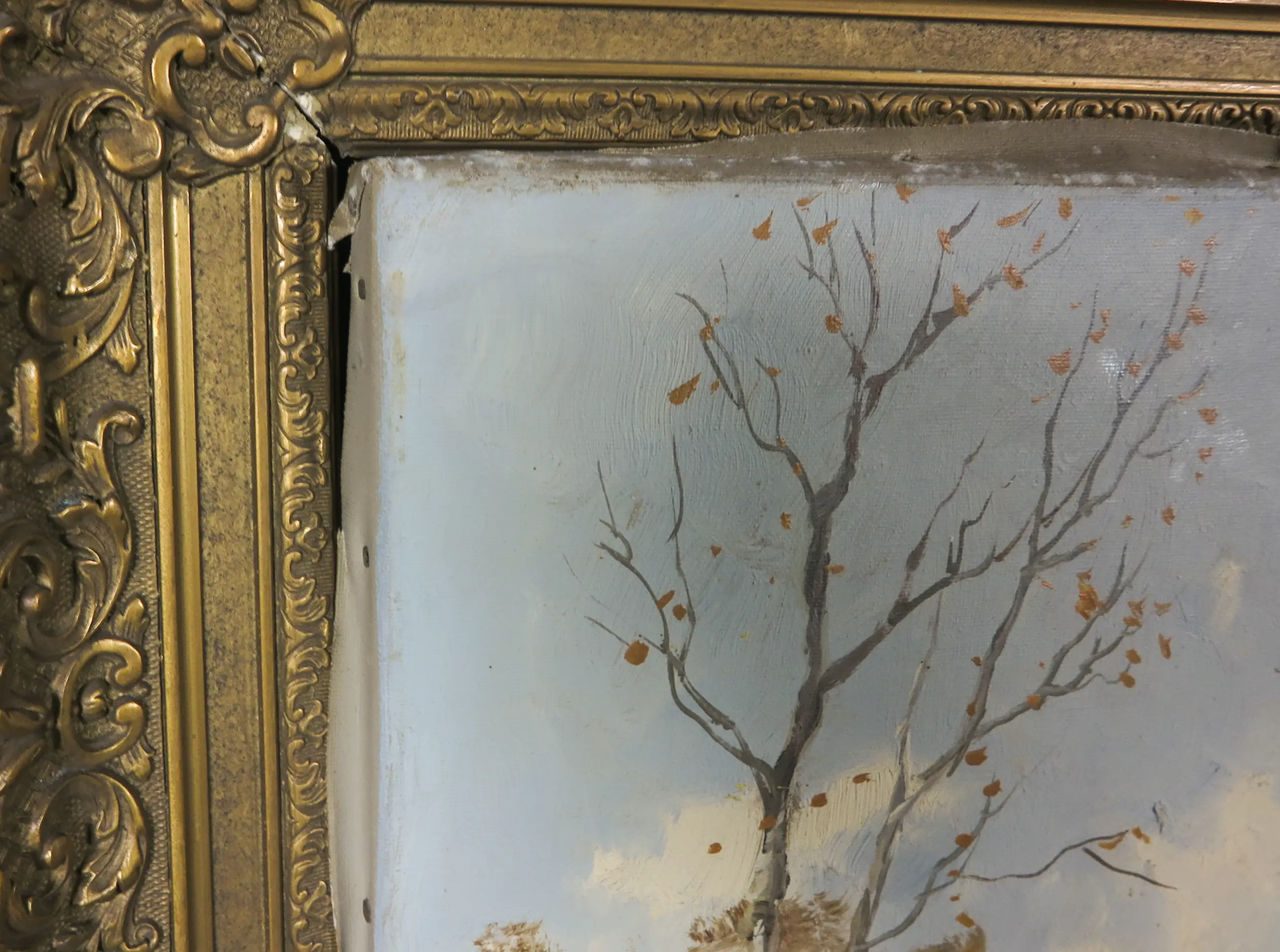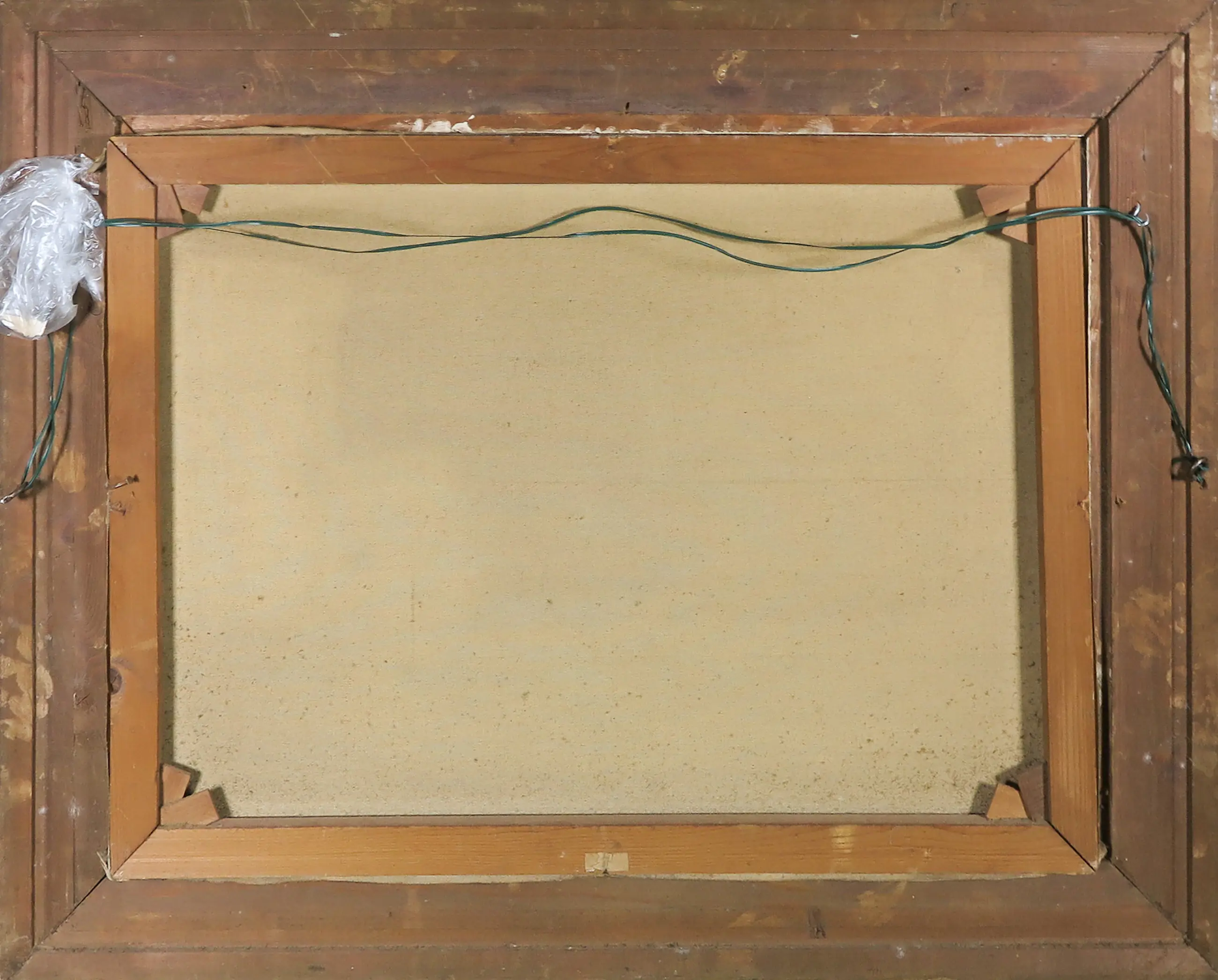 Het werk heeft een aantal plekjes op de compositie zitten, daarnaast zit het werk niet goed in de lijst, beiden zijn op de detailfoto's te zien. De lijst heeft een aantal beschadigingen. | |