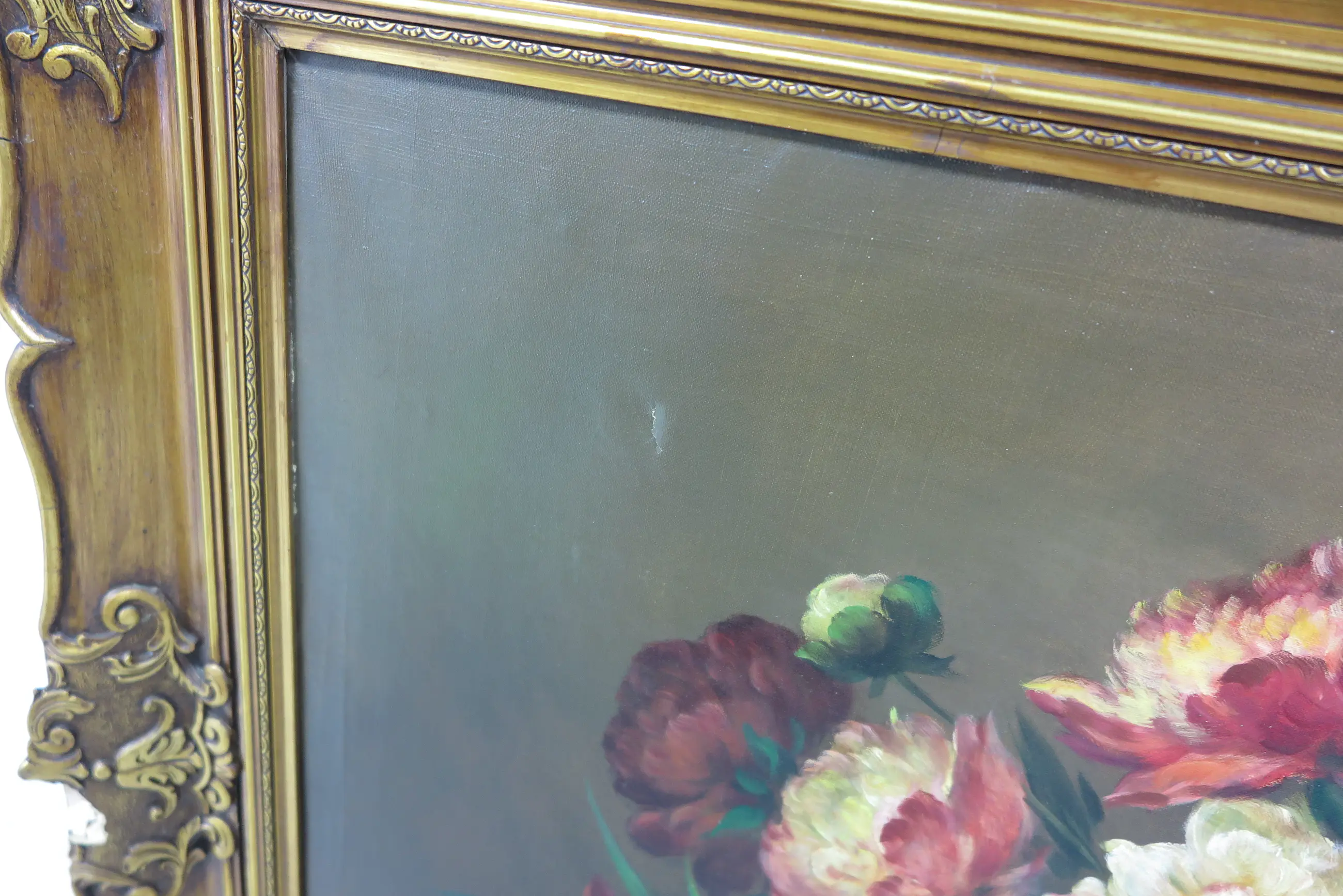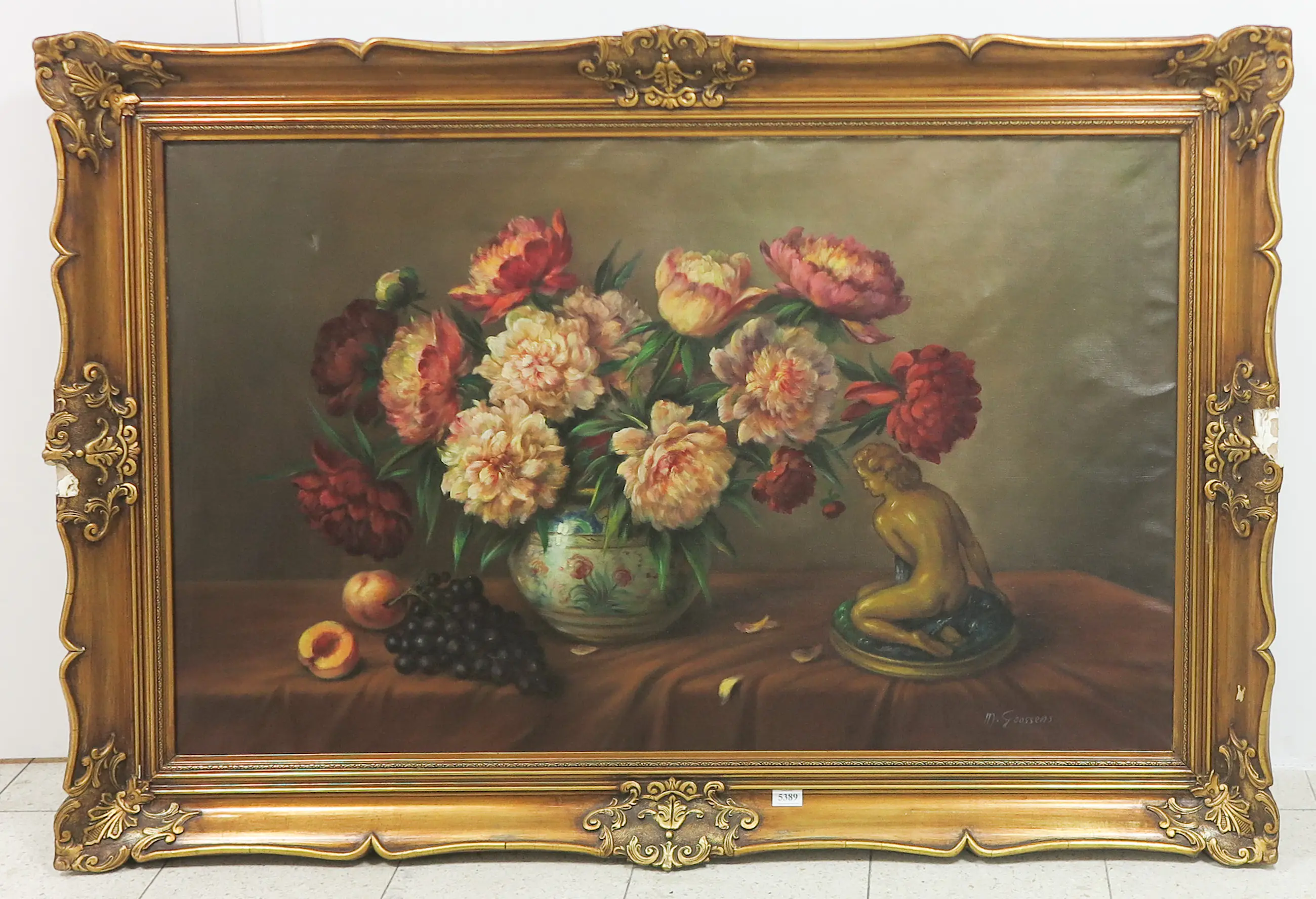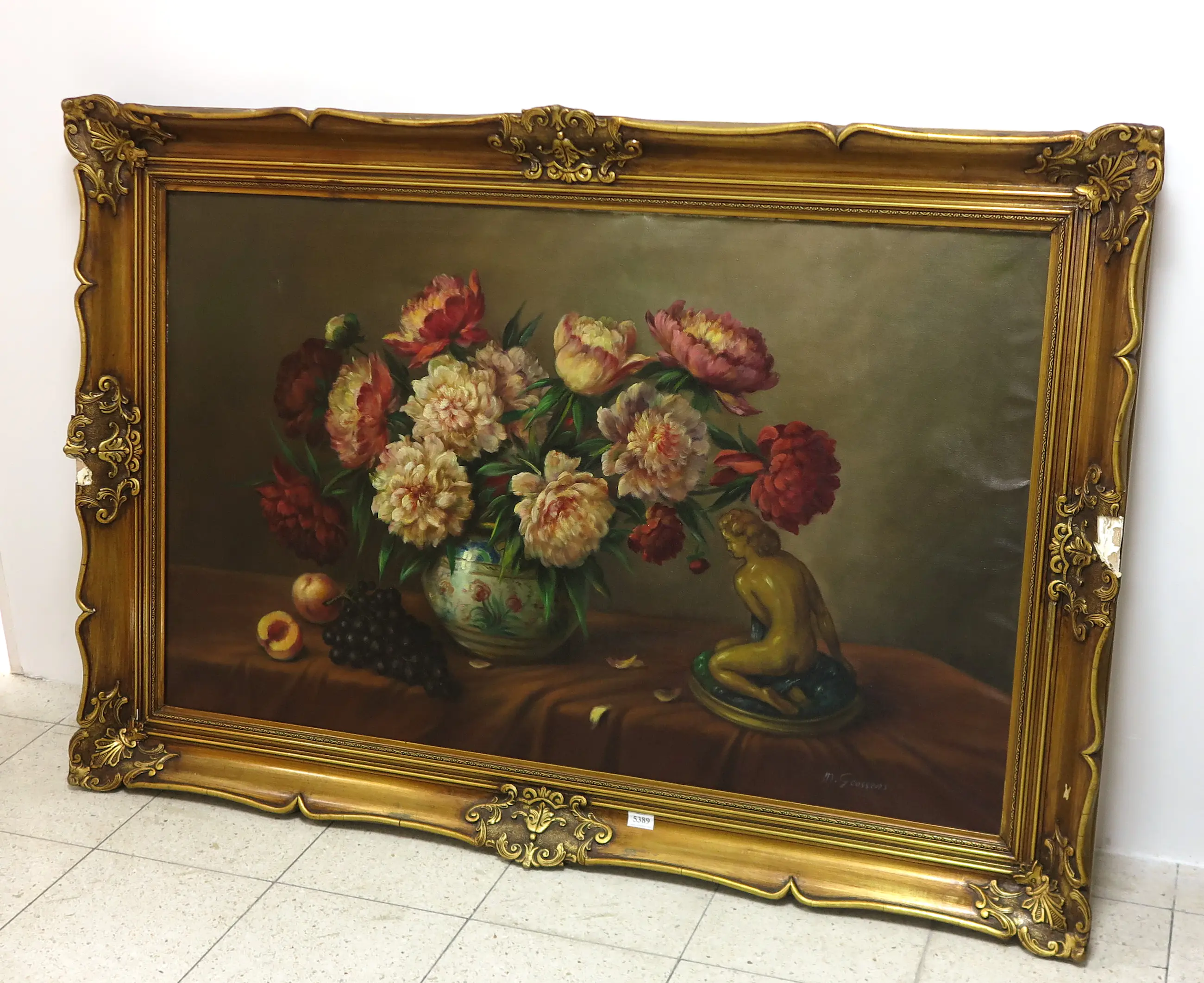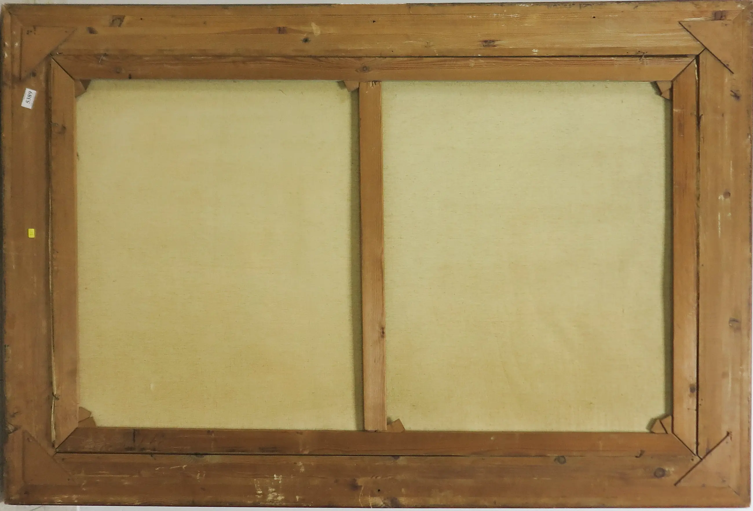 | Meerdere plooien langs de randen van het doek / verlies van spanning. Verder een beschadiging / deukje in het doek linksboven. Lijst heeft beschadigingen. | |