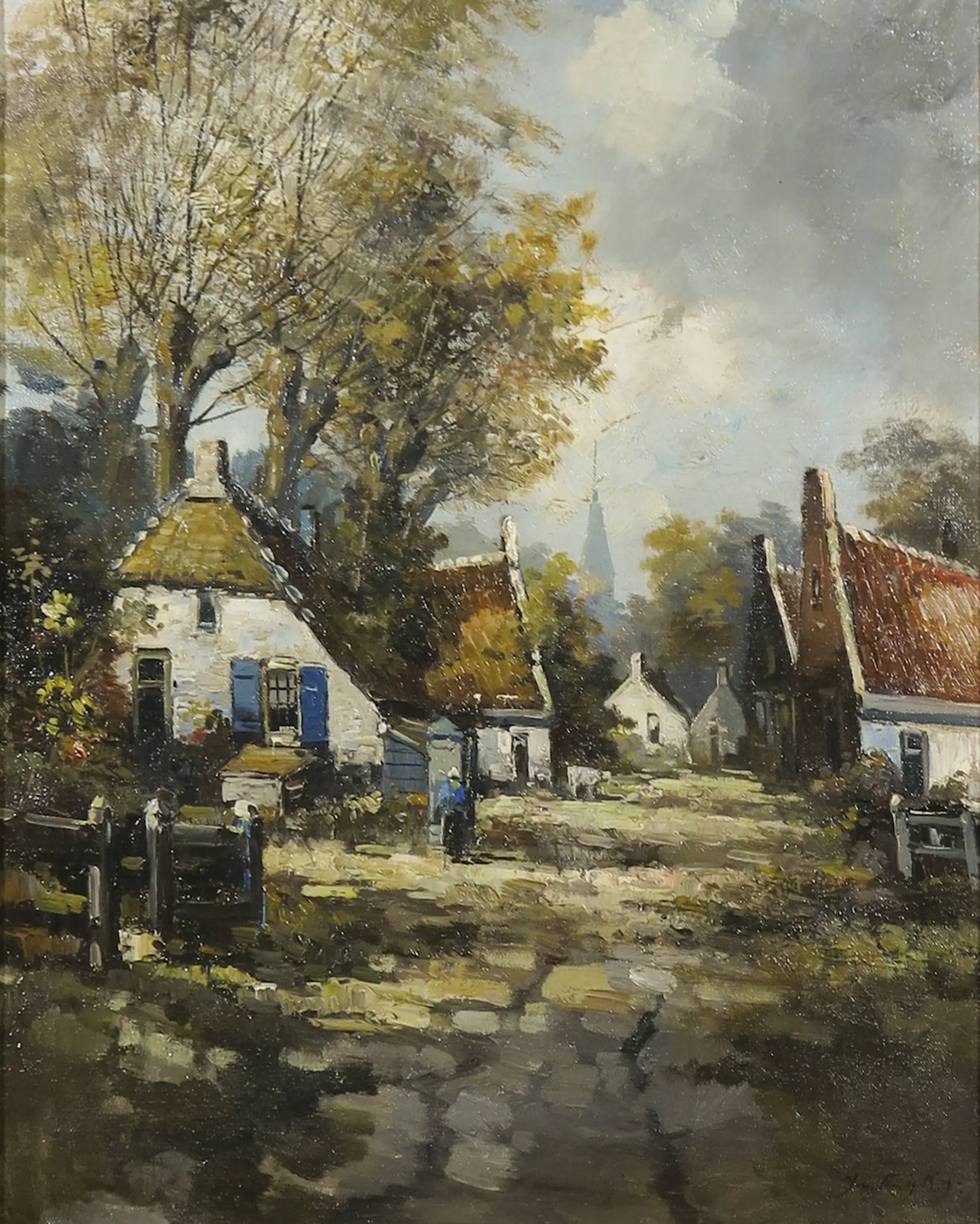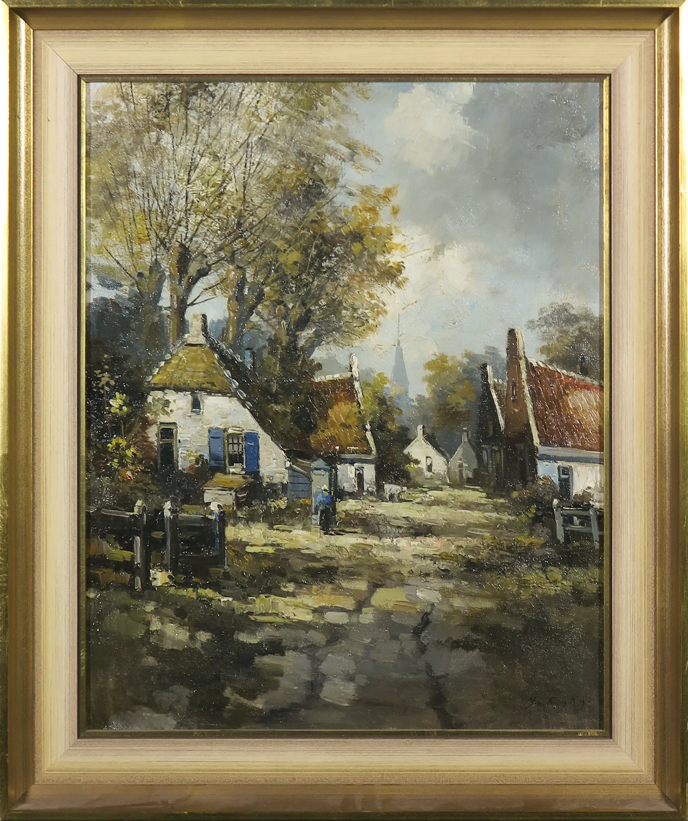 Ingelijst schilderij met voorstelling van een straat met witte huisjes en kerk op de achtergrond.