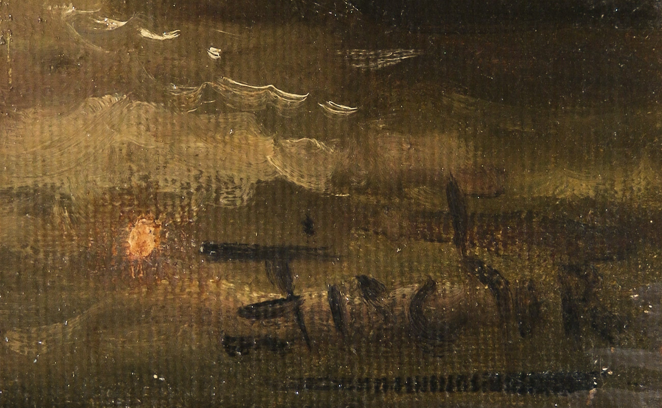 | Lichte slijtage/doffe plekjes langs de randen, waarschijnlijk door de lijst.Paar oude retouches/reparaties. | |