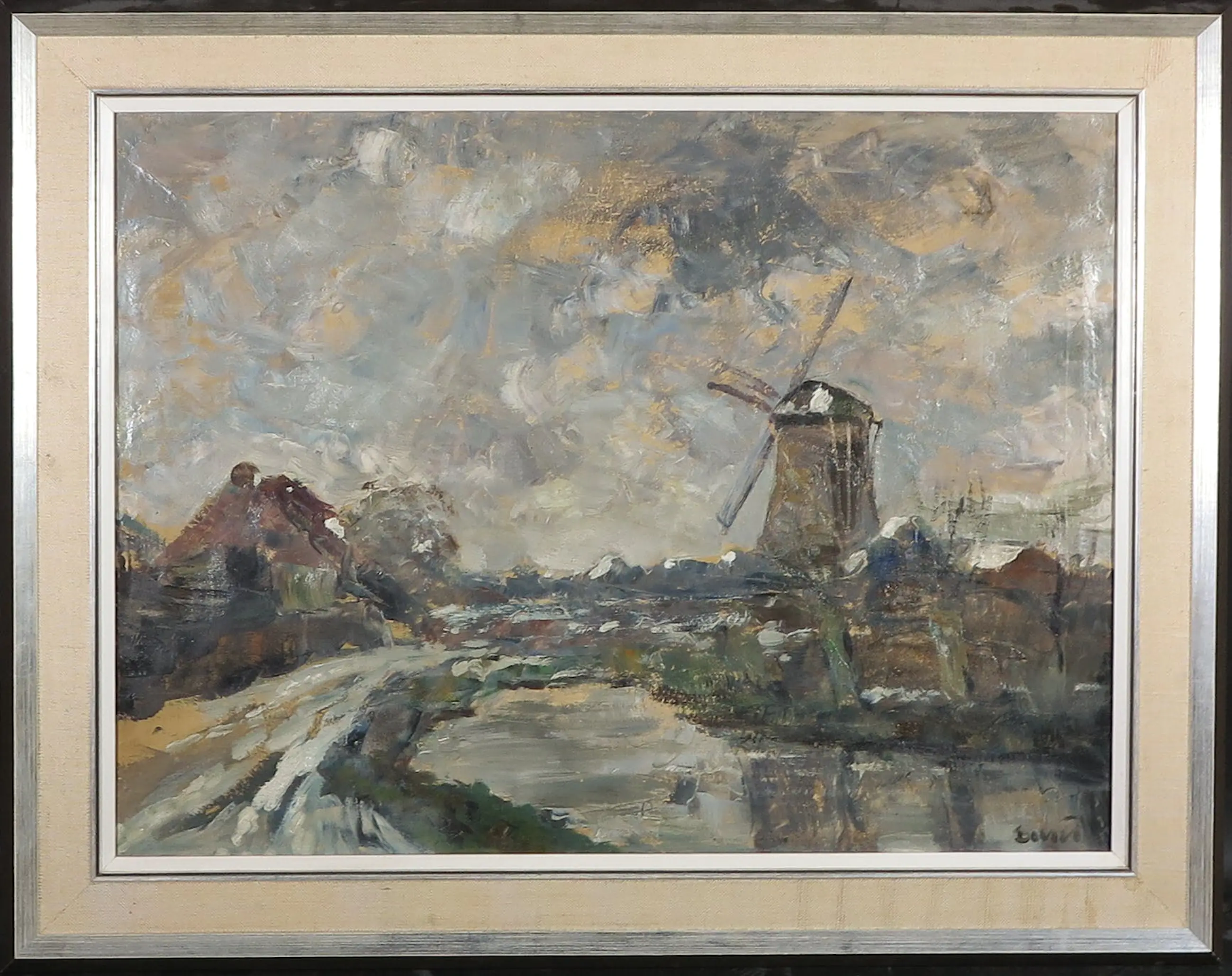 Groot olieverfschilderij met typisch Hollands landschap. Het werk is schetsmatig en met losse toets vervaardigd, met als resultaat dat op verschillende plekken de drager nog zichtbaar is.