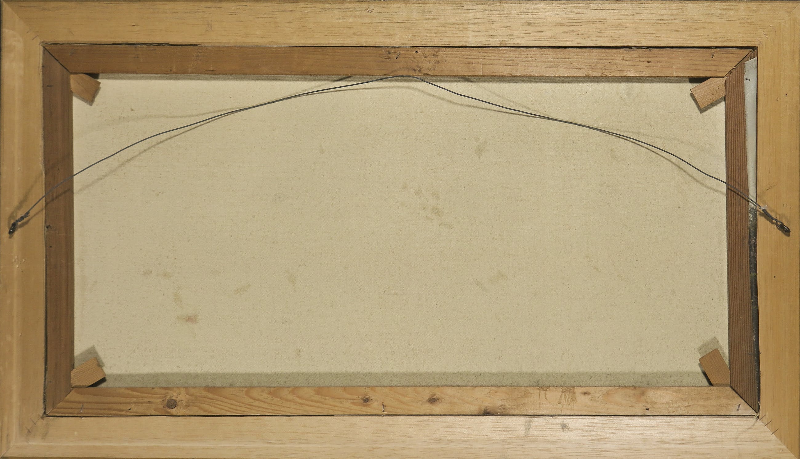 Door ongelijkmatige spanning van het doek op spieraam in de hoeken wat lichte vouwen. Daarnaast een klein gaatje in het doek. | |