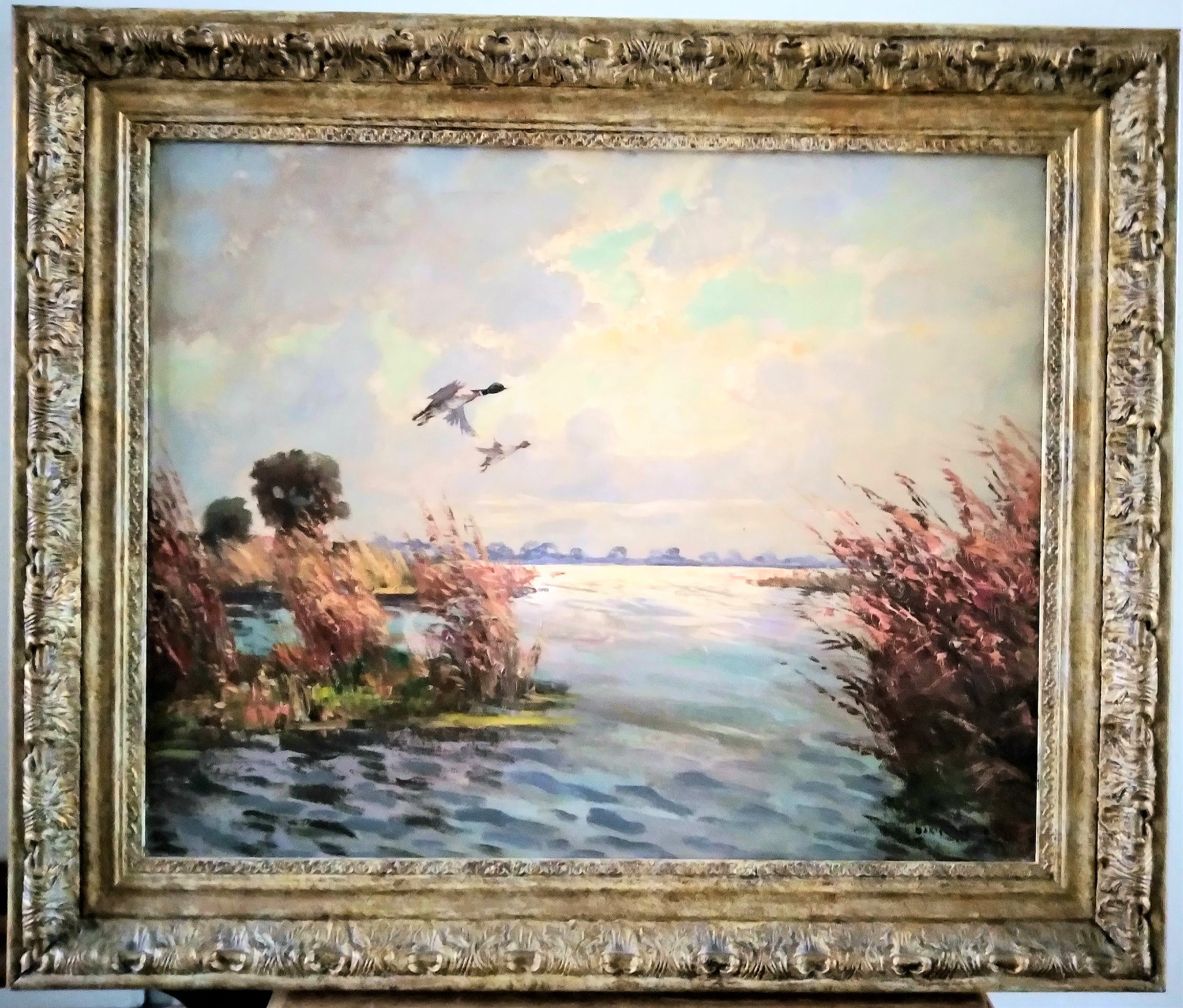 Een bewolkte lucht laat een kiertje open voor de zon, die een weerkaatsing geeft in het water. Op de achtergrond is een dorp afgebeeld. Op de voorgrond rietkragen met daaruit opvliegende eenden. Het werk is gesigneerd, voor ons echter niet te ontcijferen.