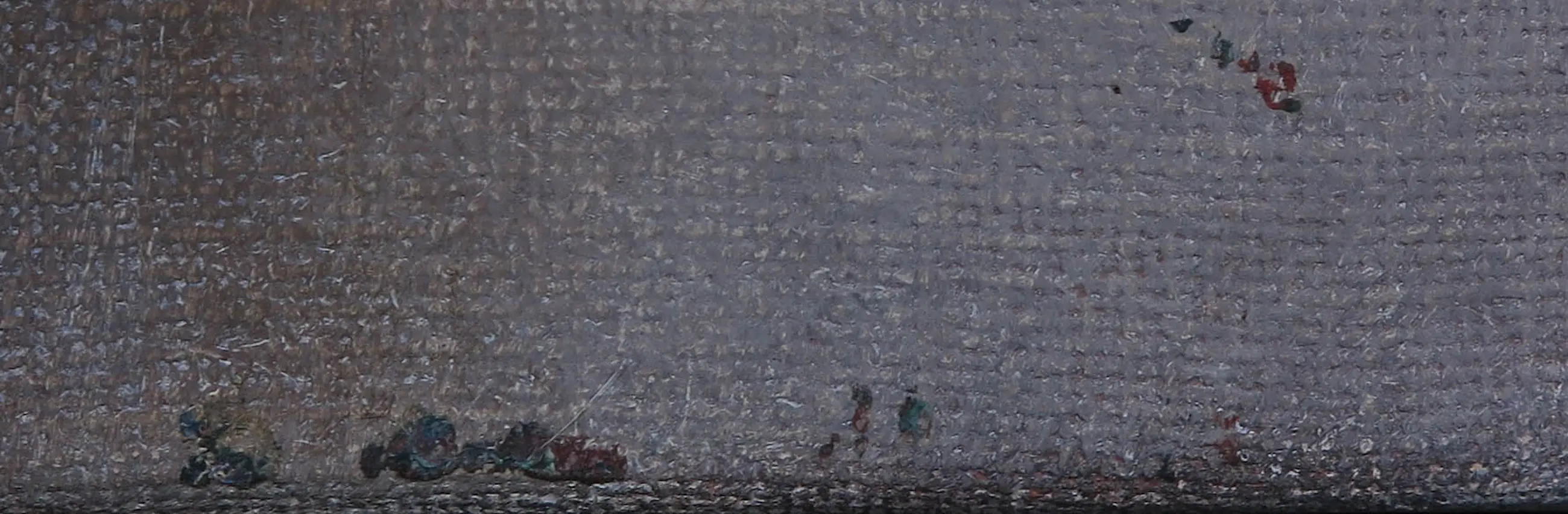 Wat lichte slijtagesporen en krasjes langs de randen en in de hoeken van het doek. Zie detailfoto's voor een indruk van de huidige staat van het werk. | |