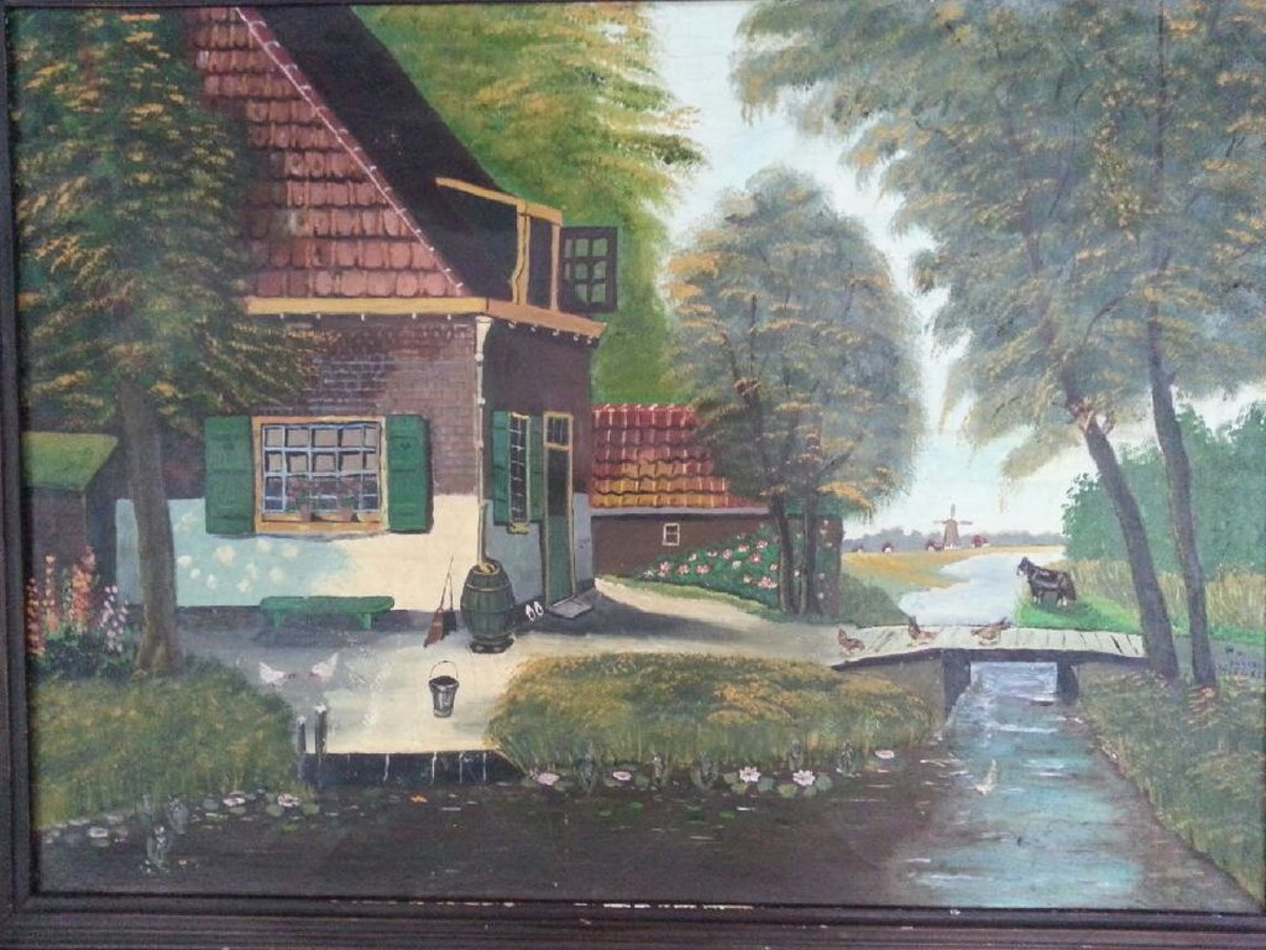 Olieverf op doek. Er zit een kleine beschadiging in het doek maar die is eigenljk niet te zien als het werk gewoon aan de muur hangt. De houten lijst die er omheen zit is niet mooi maar die kan makkelijk opnieuw worden gespoten of geschilderd.
