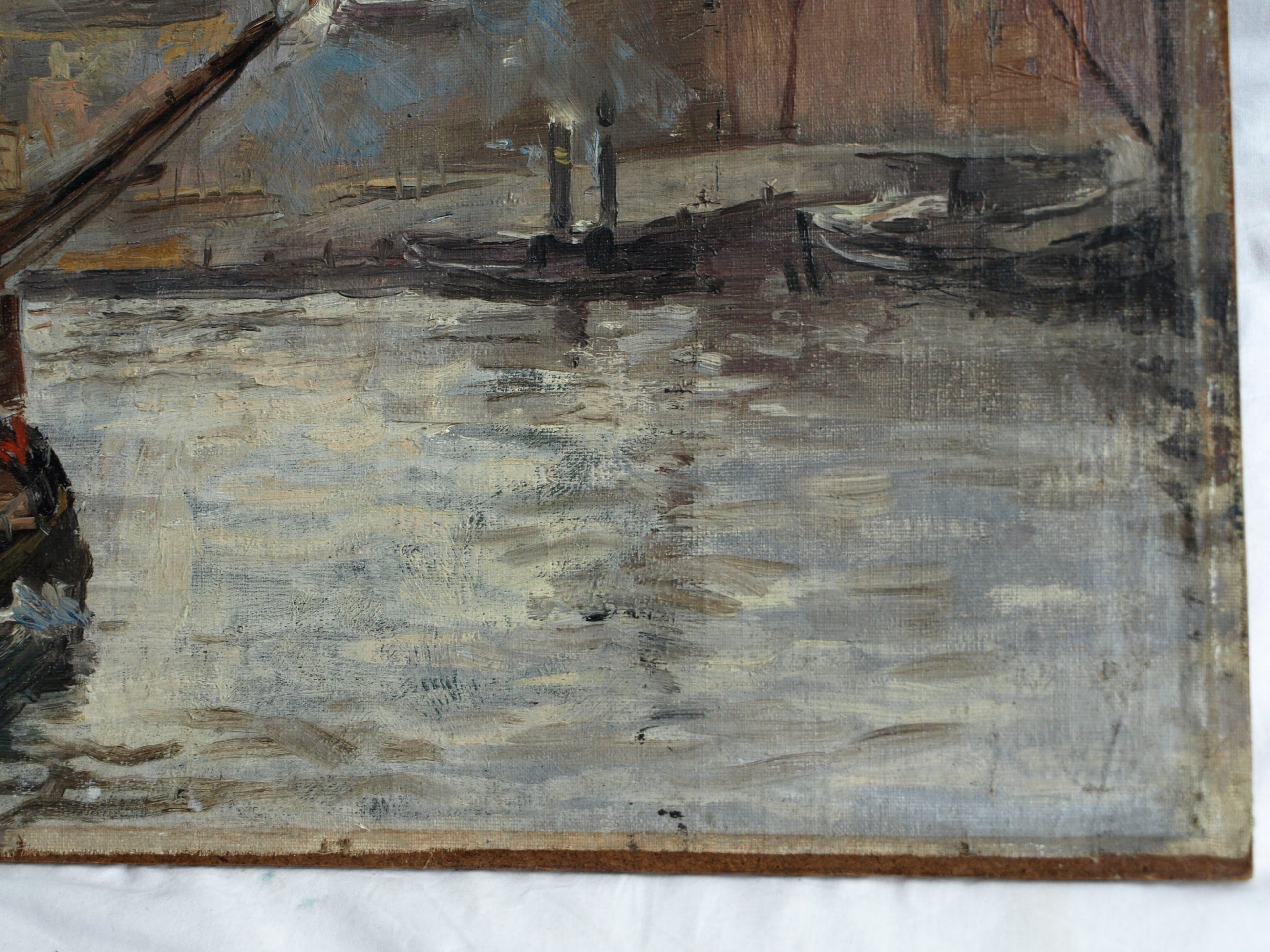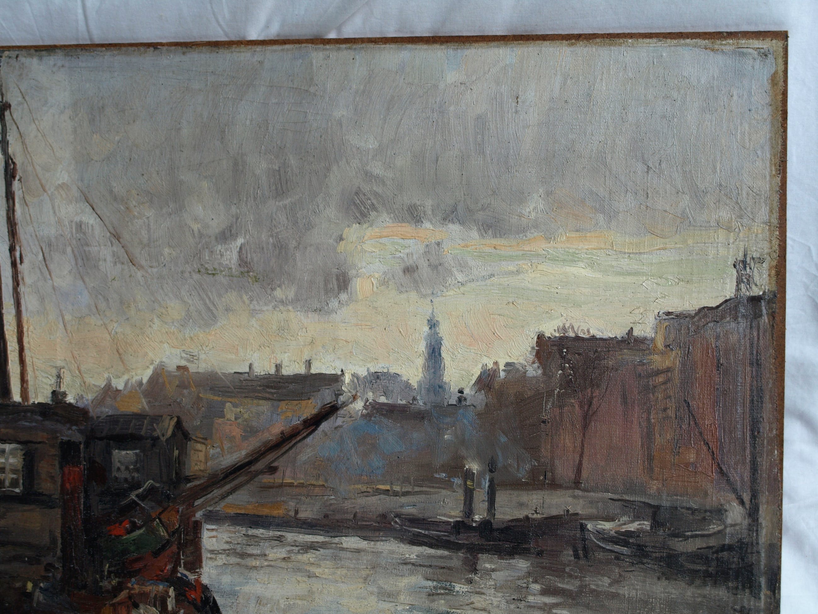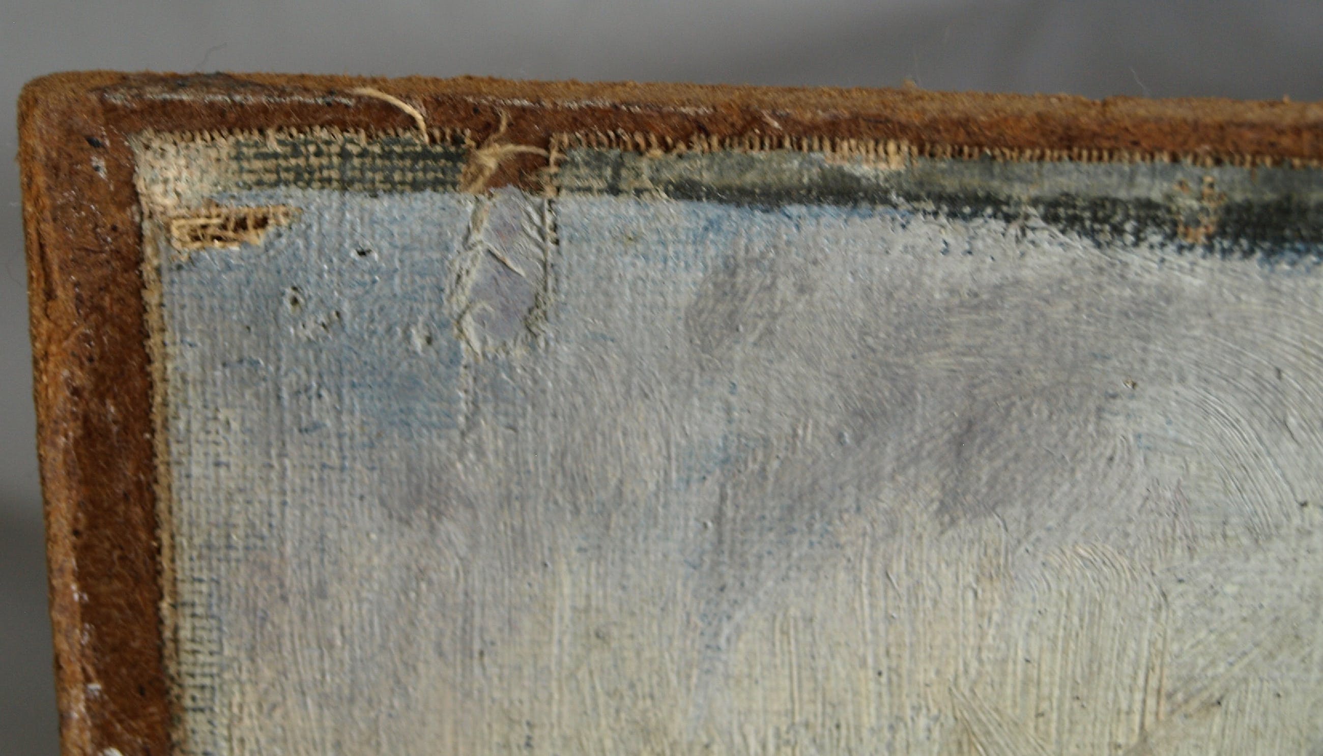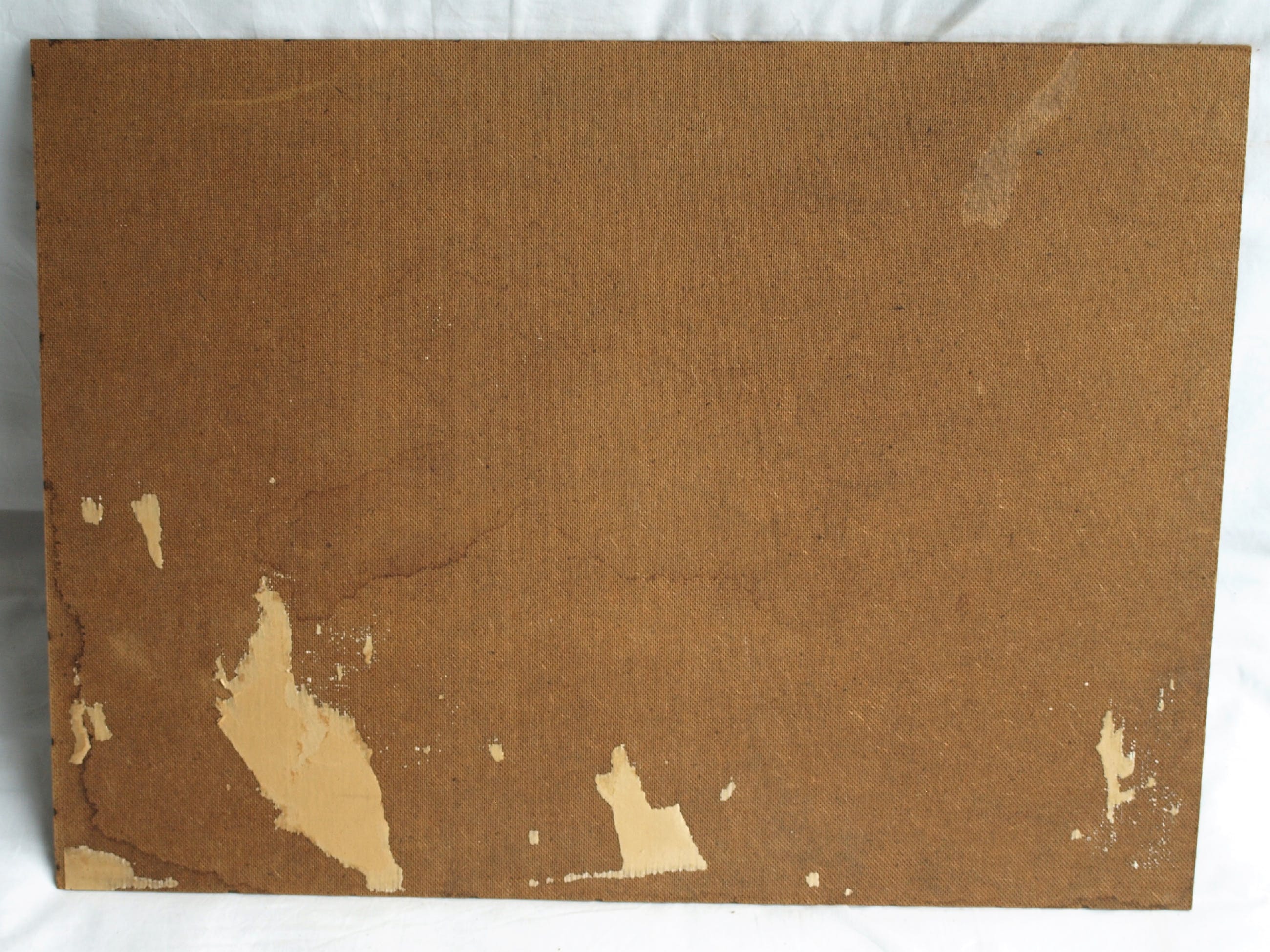 -Geschilderd op doek en gemaroufleerd (geplakt) op een plaat hardboard.