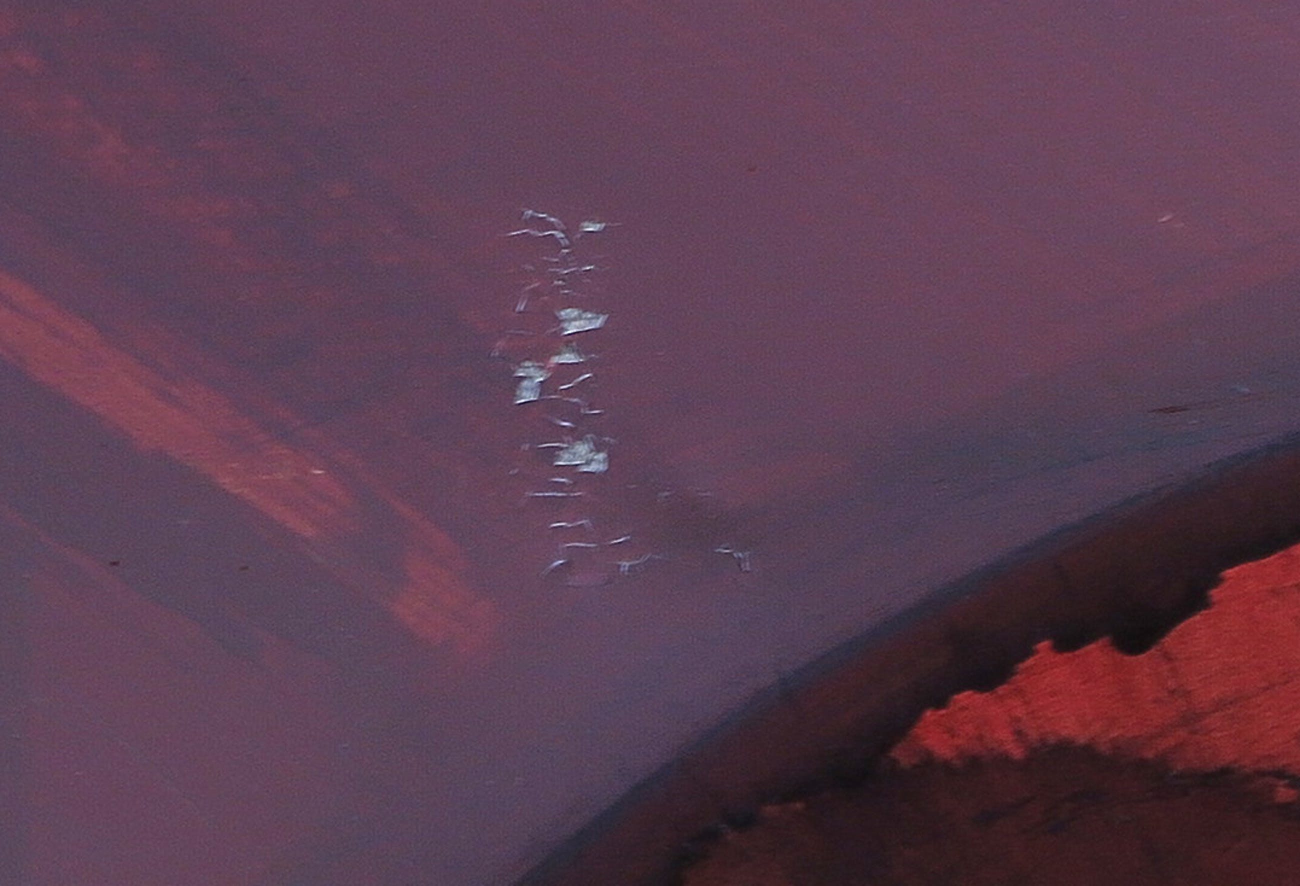 | Het werk is op verschillende plekken beschadigd. In het midden zit een deuk in het doek, met een lichte beschadiging, aan de randen zijn krassen te vinden. | |