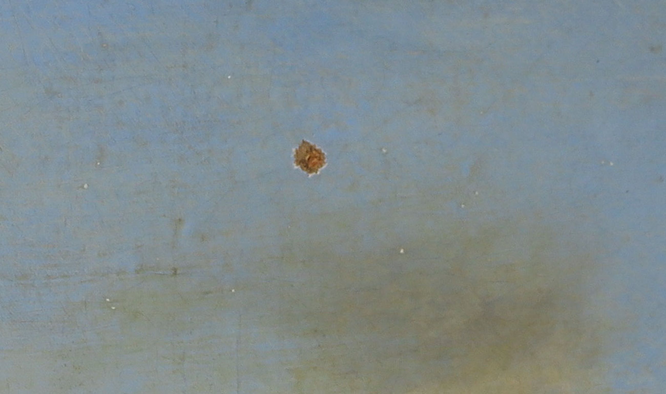 | Het werk is zwaar gerestaureerd en rechtsboven in de lucht is het werk beschadigd, met verfverlies. De algehele conditie is matig. | |