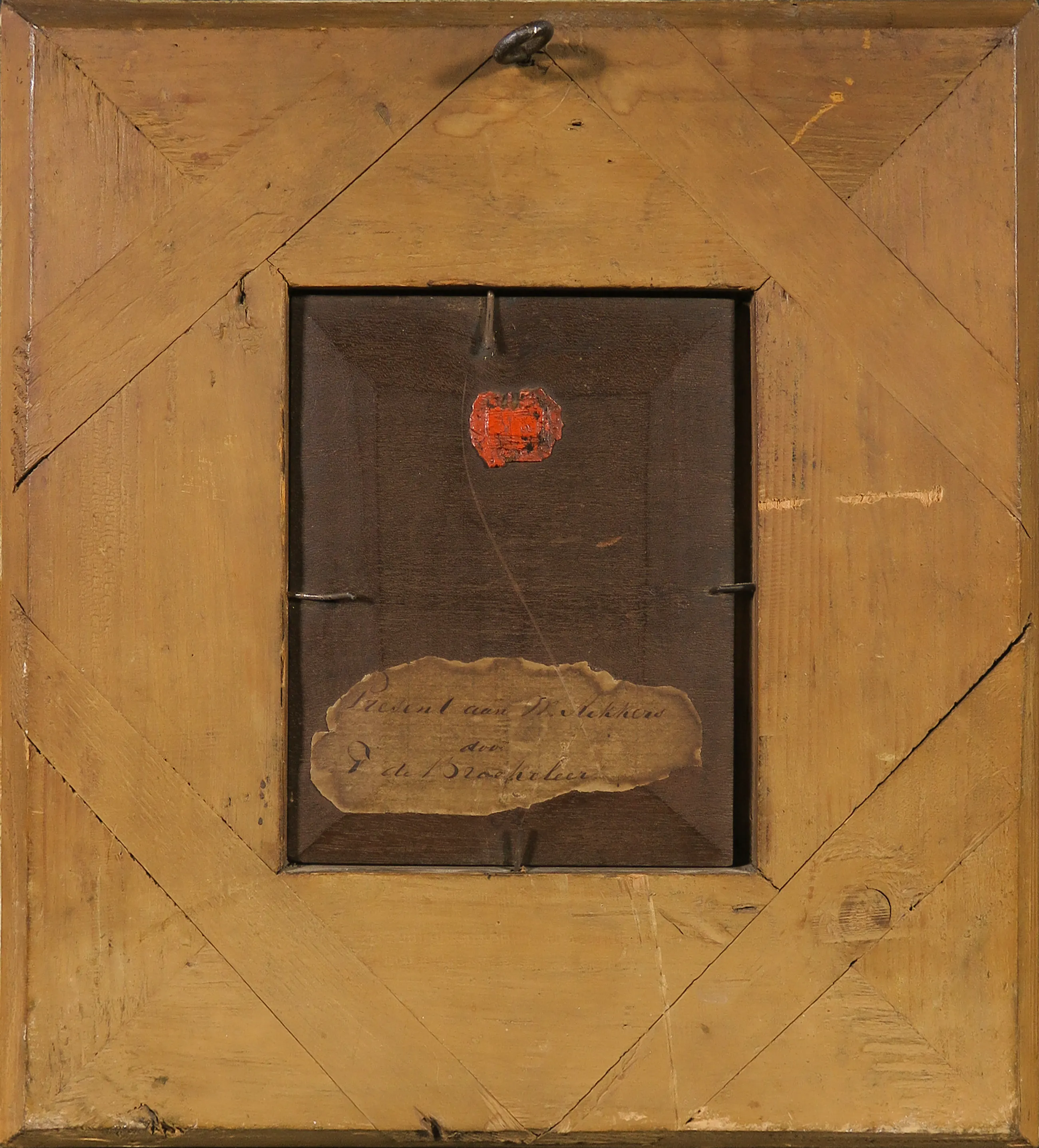 Verso op het paneel voorzien vane en oud etiket met de naam 'Braekelaer', maar dat betreft niet de kunstenaar van dit paneel.