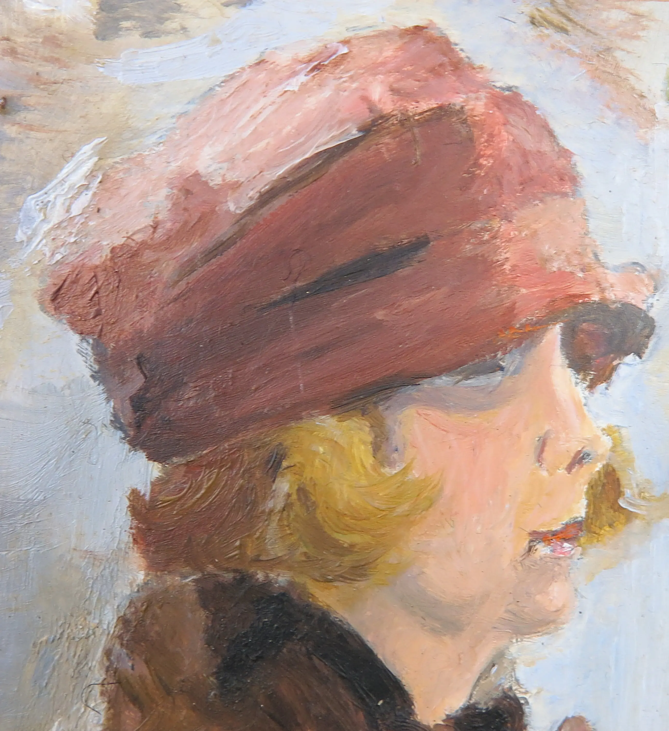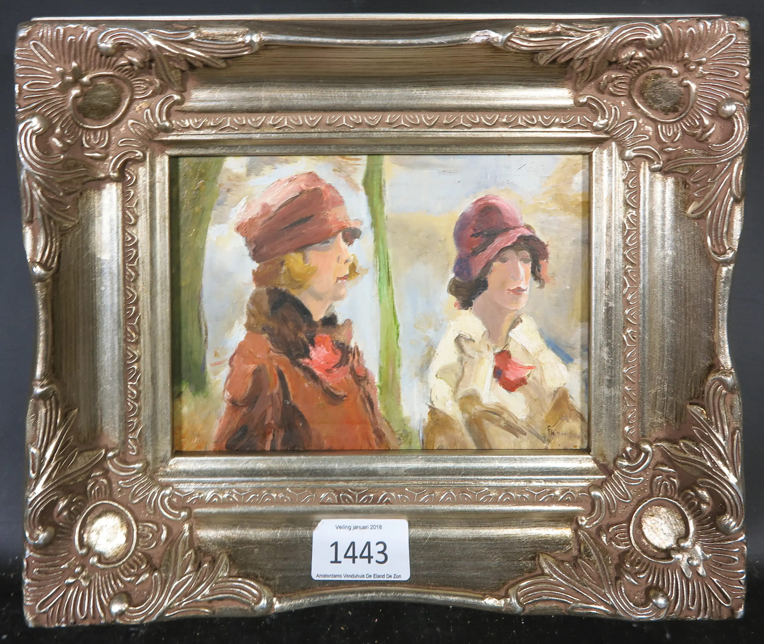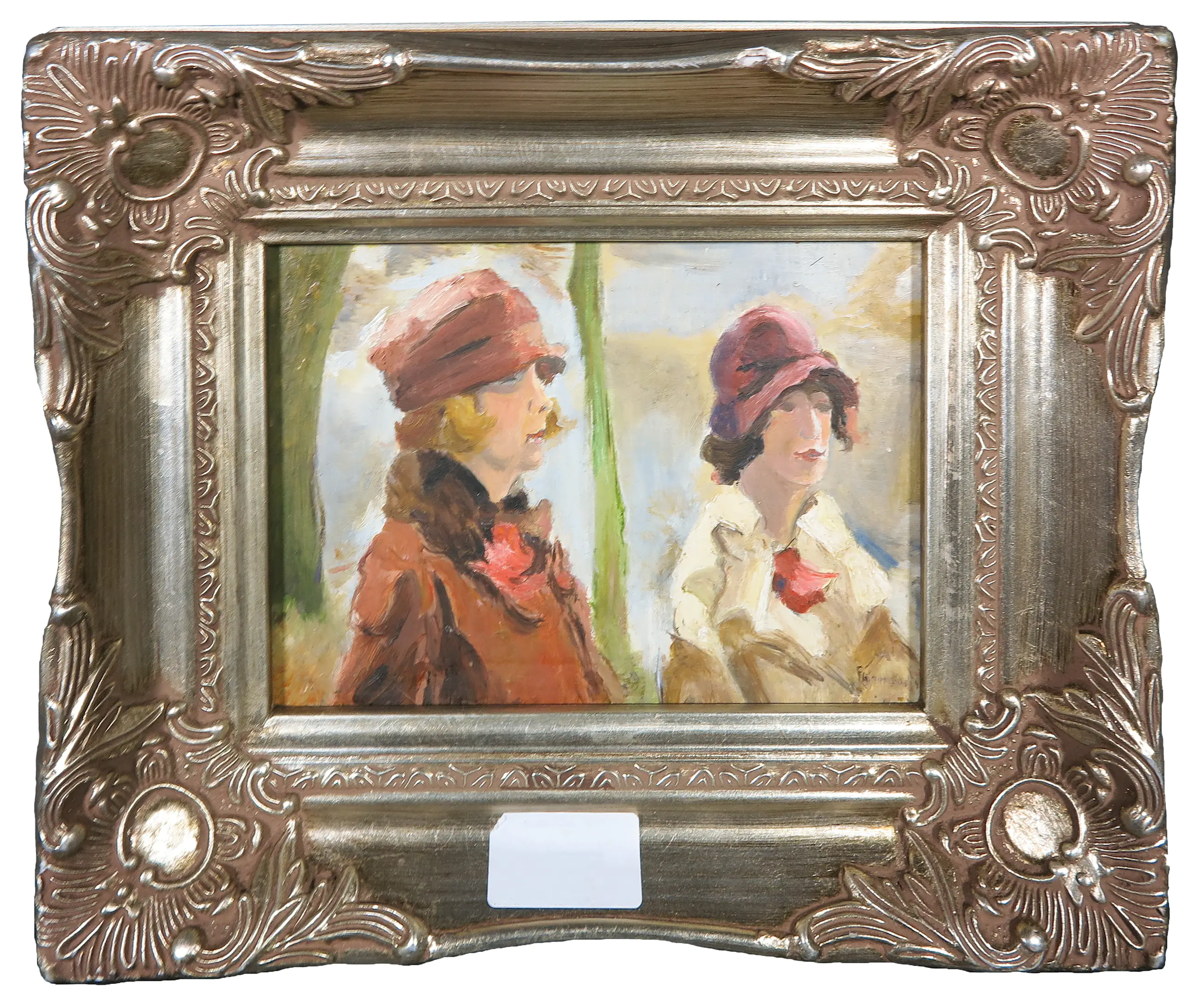 Niet of onleesbaar gesigneerd - Olieverf op paneel, Twee vrouwen met hoeden - Ingelijst kopen? Bied vanaf 1!