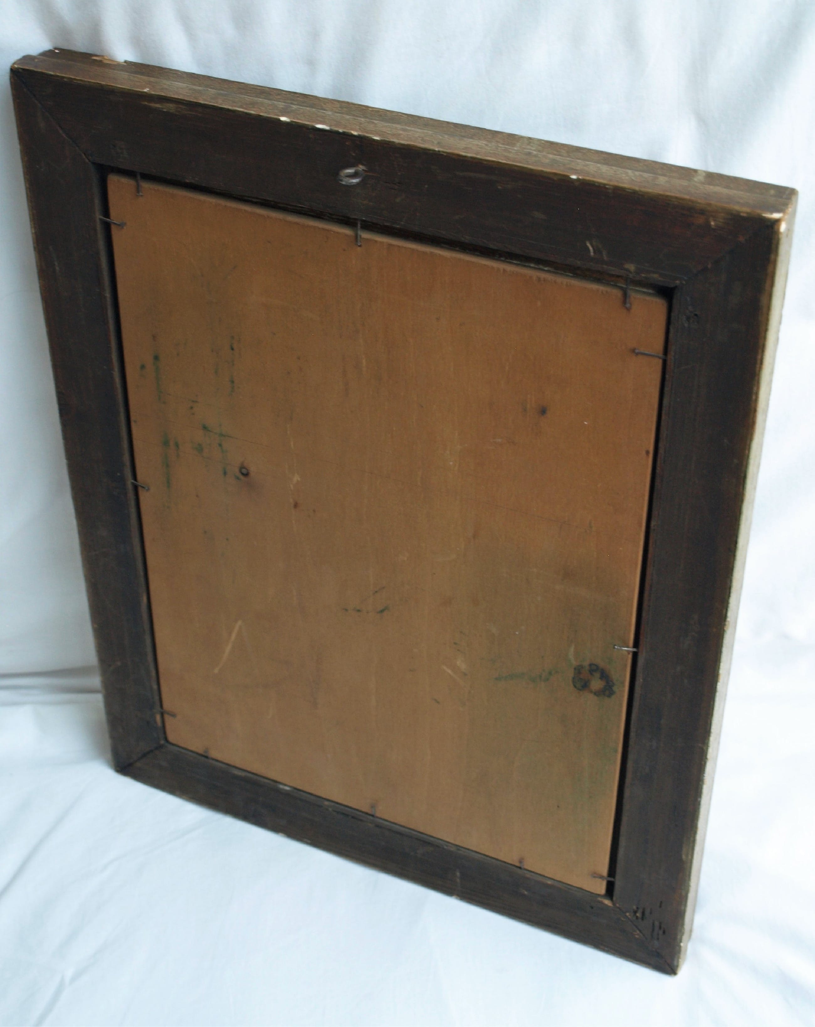 Het werk is in goede staat met slijtplekjes. De lijst heeft slijtplekken en heeft beschadigingen aan de randen (stukjes hout eraf). Zie ook de foto’s voor een eigen indruk. Kan zo aan de muur.
