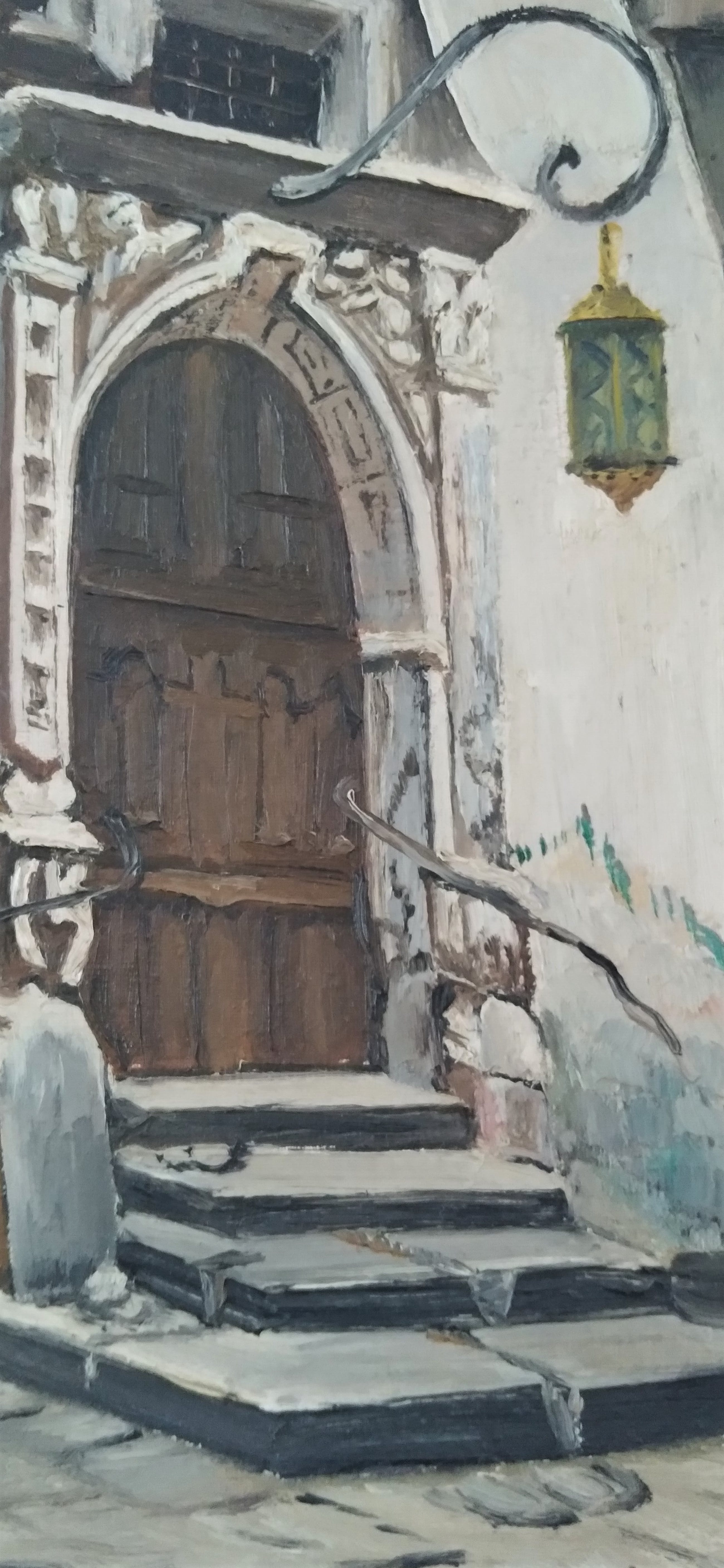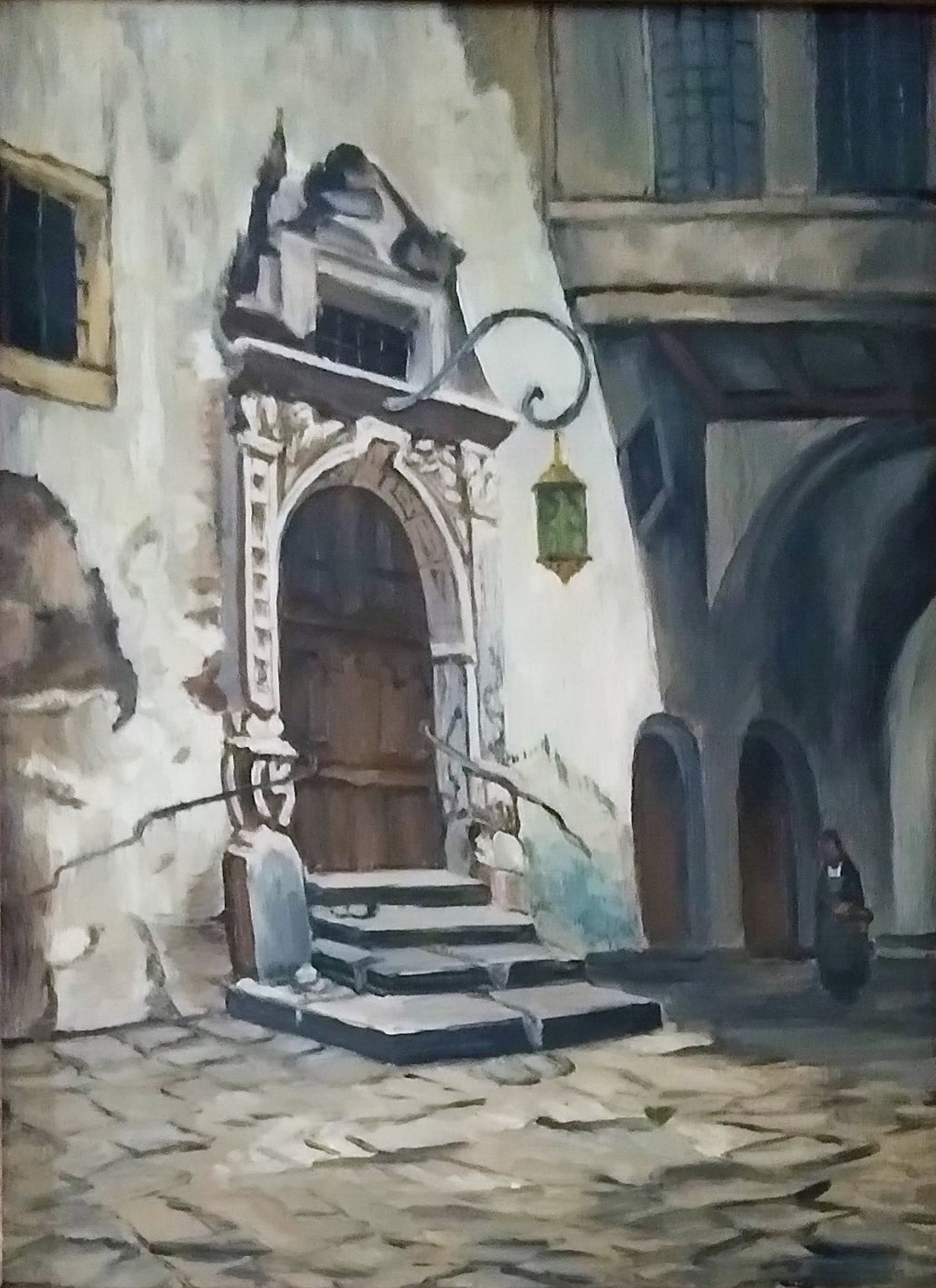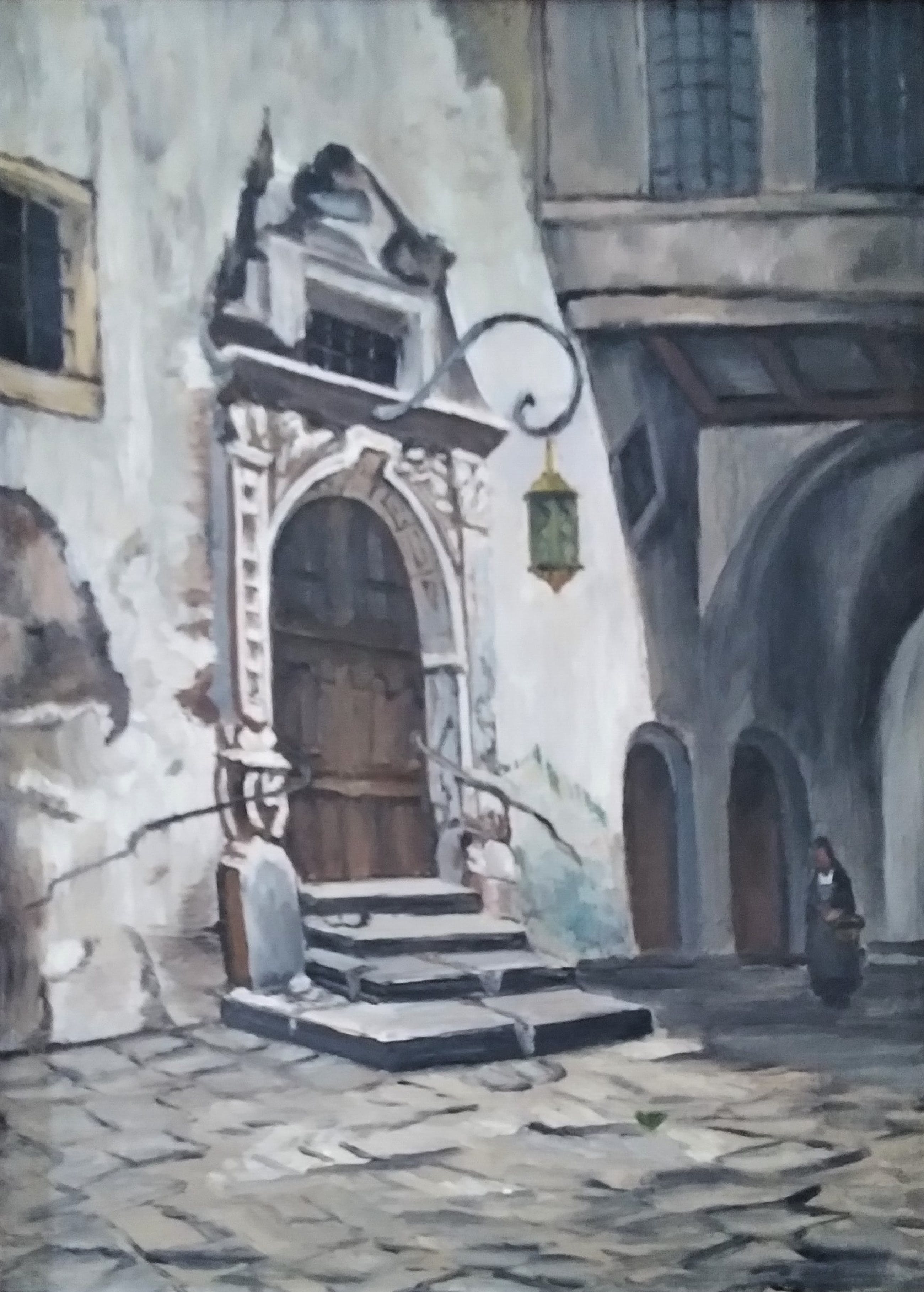Sfeervol, overtuigend beeld van entree in een oude straat. Een dame met mand aan haar arm komt aangelopen. Subtiel kleurgebruik, in olieverf. Het werk verkeert in zeer goede staat.