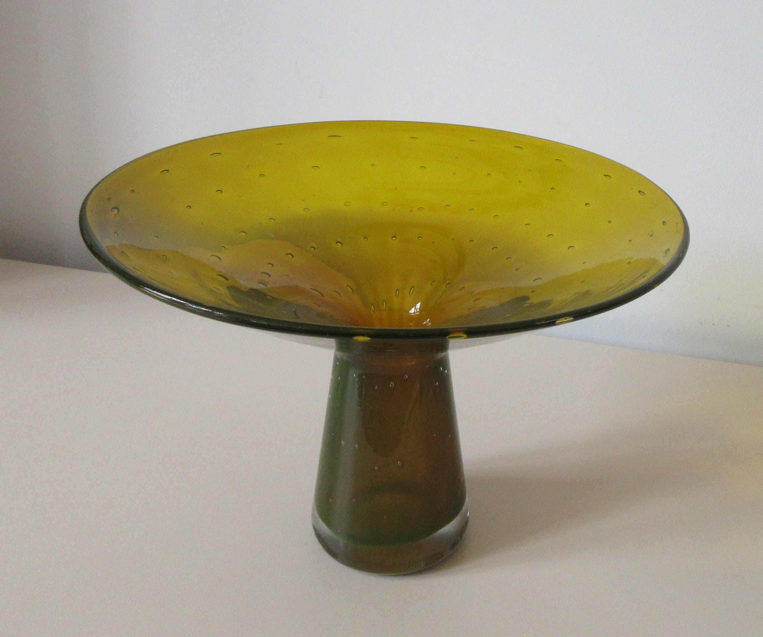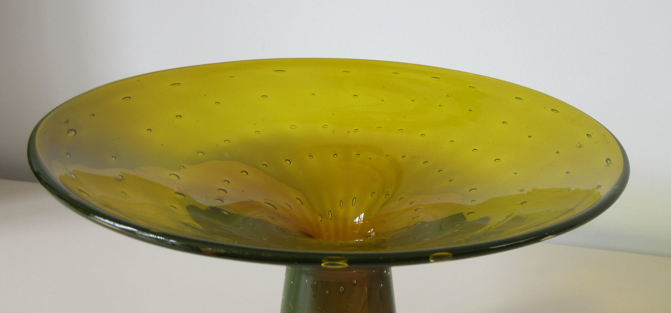 Olijfgroen vrij geblazen glazen object omhoog gedreven en voorzien van een voet. In het glas zijn luchtbellen geblazen. Niet gemerkt wel voorzien van een met de hand gepolijst pontil aan de onderzijde.