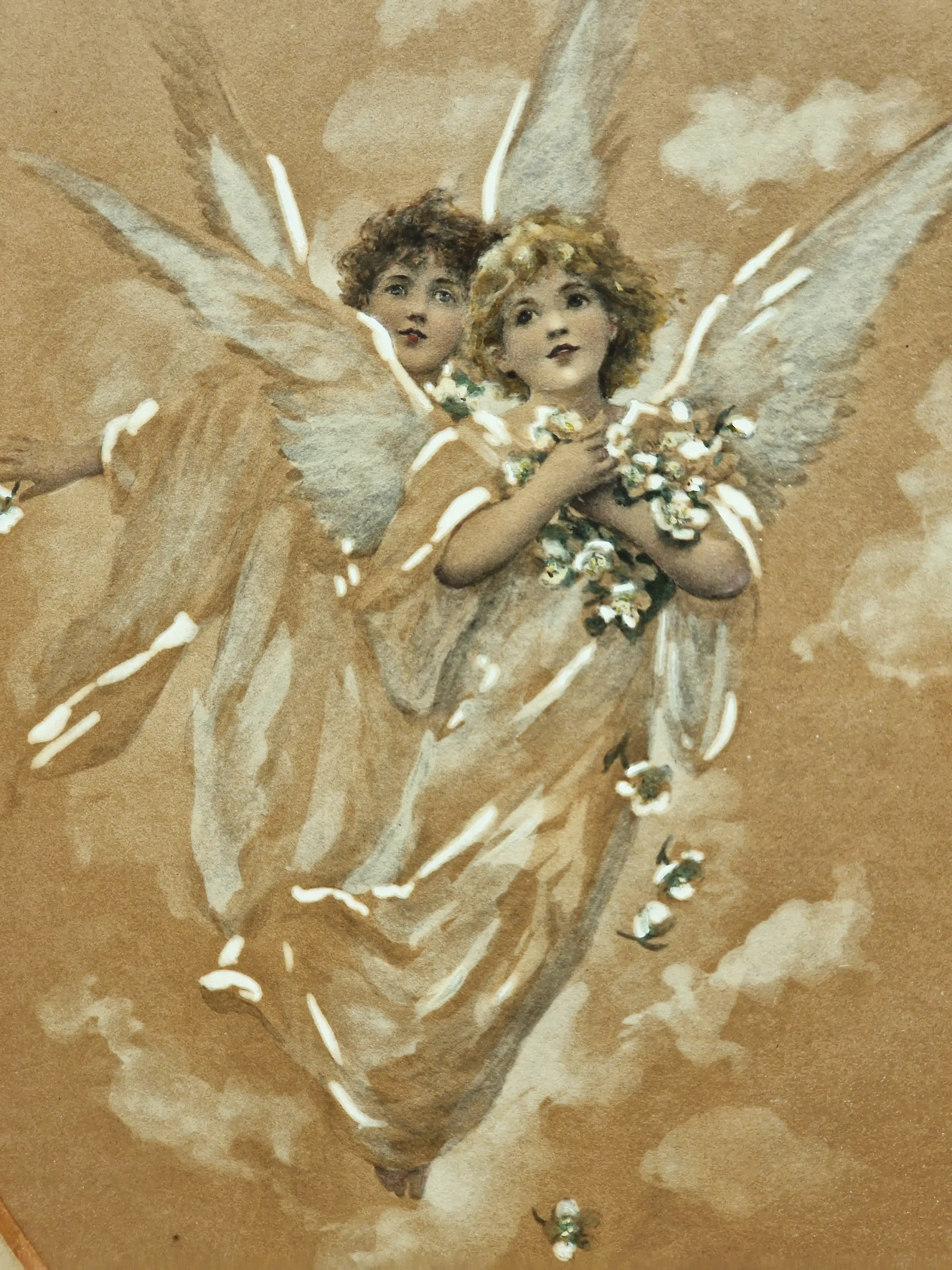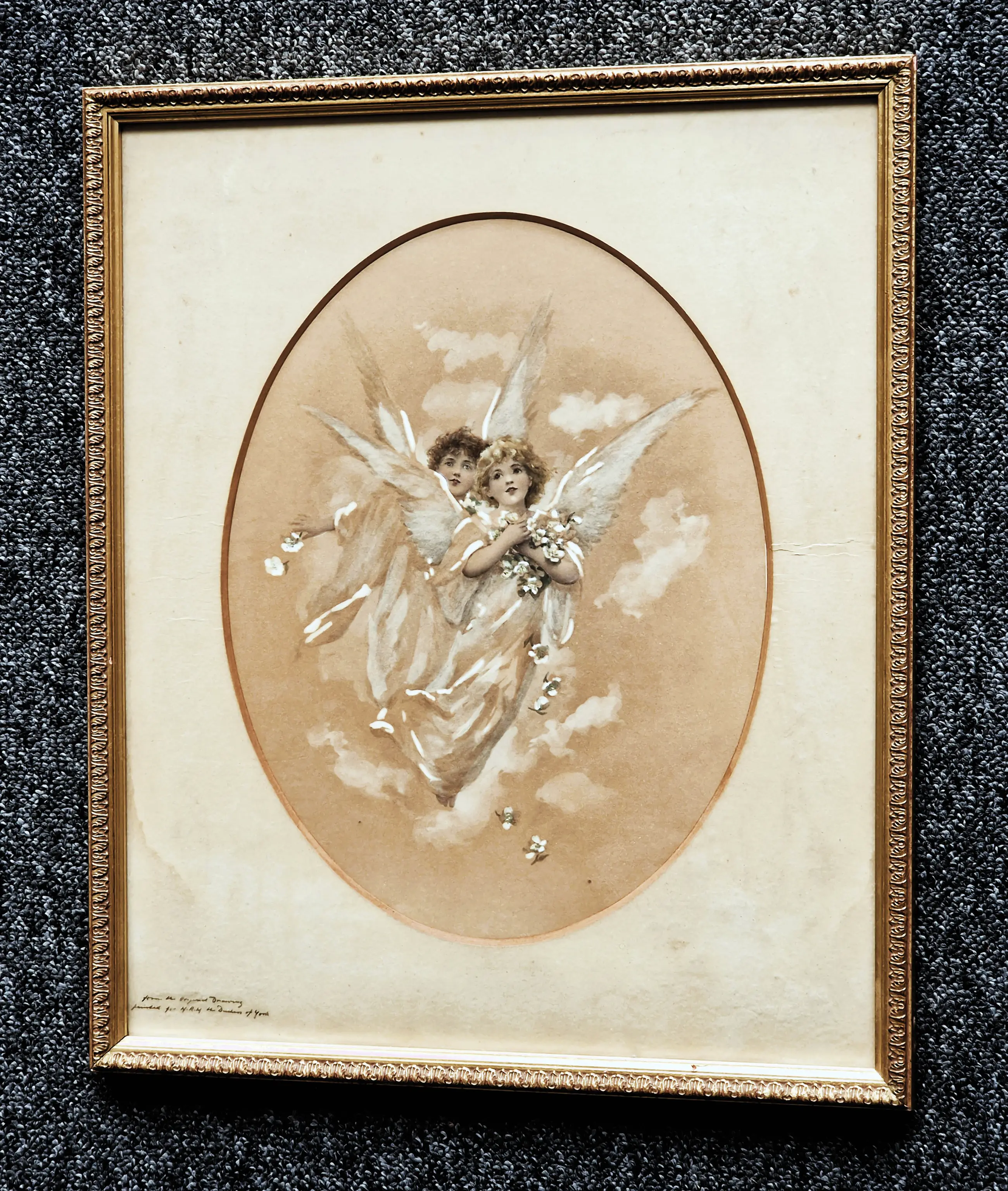 Bijzonder goed, door een onbekende Britse(?) kunstenaar geschilderde laat 19 of vroeg 20e eeuwse gemengde techniek (pastel, inkt) op papier "Engelen". Het originele olieverf schilderij (dit is een kleinere met pastel geschilderde versie) was een geschenk voor de duchess of York mary Teck ( de vrouw van de latere koning van Engeland George V). Bladmaat papier 30x25cm. Het pastel en de originele lijst verkeren in goede conditie.