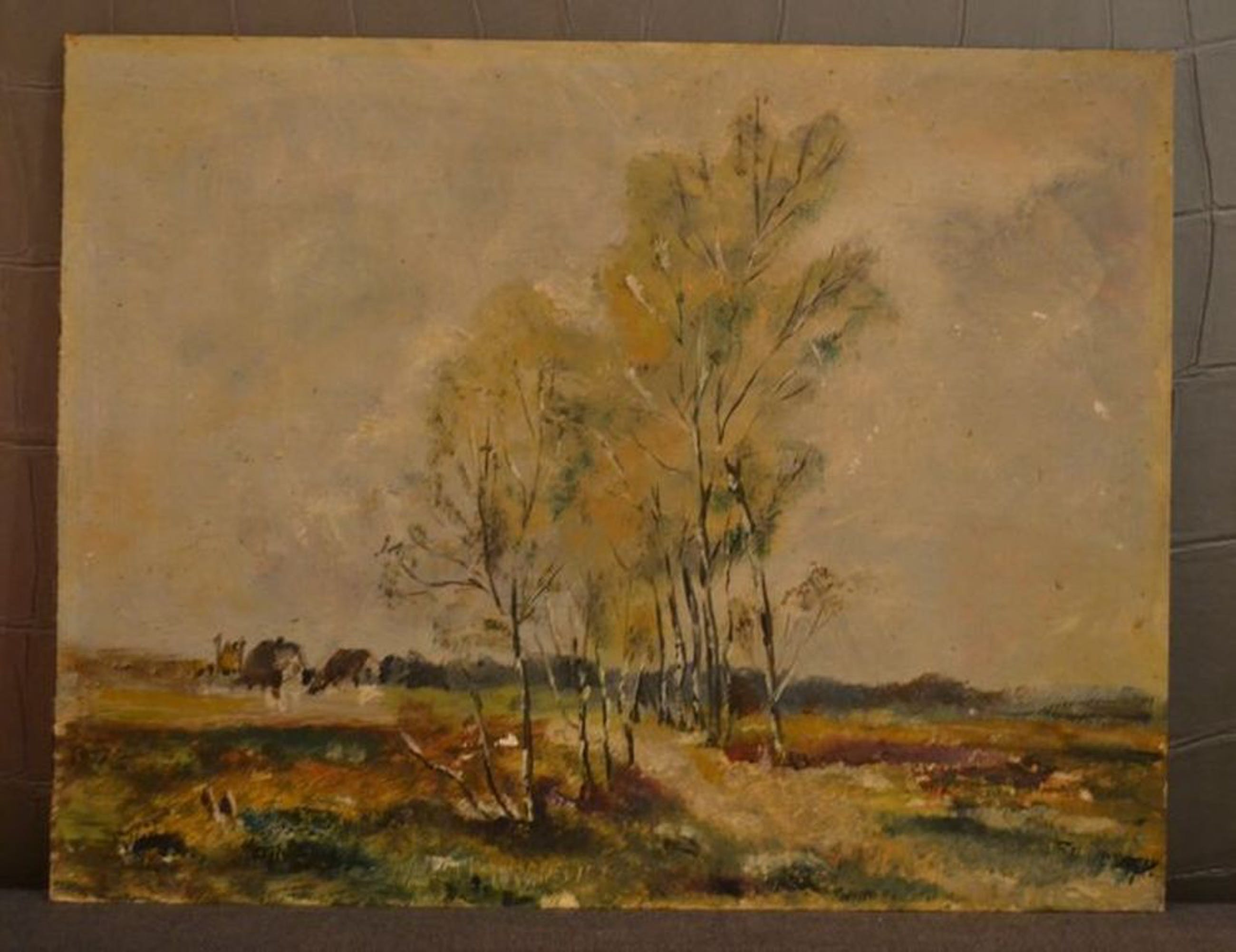 Fraaie marouflage (geplakt op board) van Nederlands landschap met bomen en boerderijen, 20ste eeuw. Afmetingen 34x45cm. Impressionistisch geschilderd maar helaas niet gesigneerd. Heeft enkele kleine beschadigingen (zie foto's).