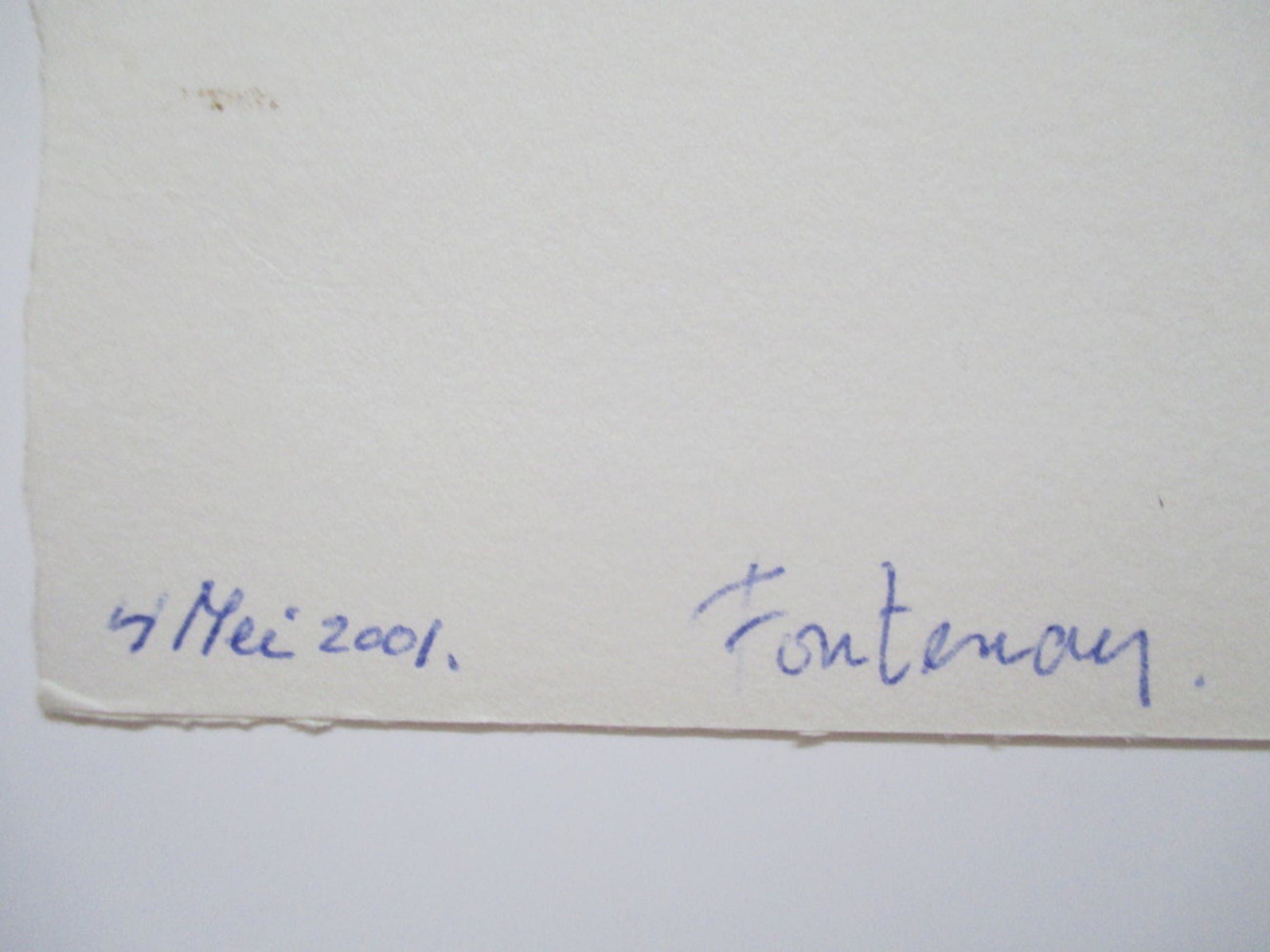 On gesigneerde aquarel, afm. blad 38,5x30 cm. Achterop staat "4 mei 2001 Fontenay"