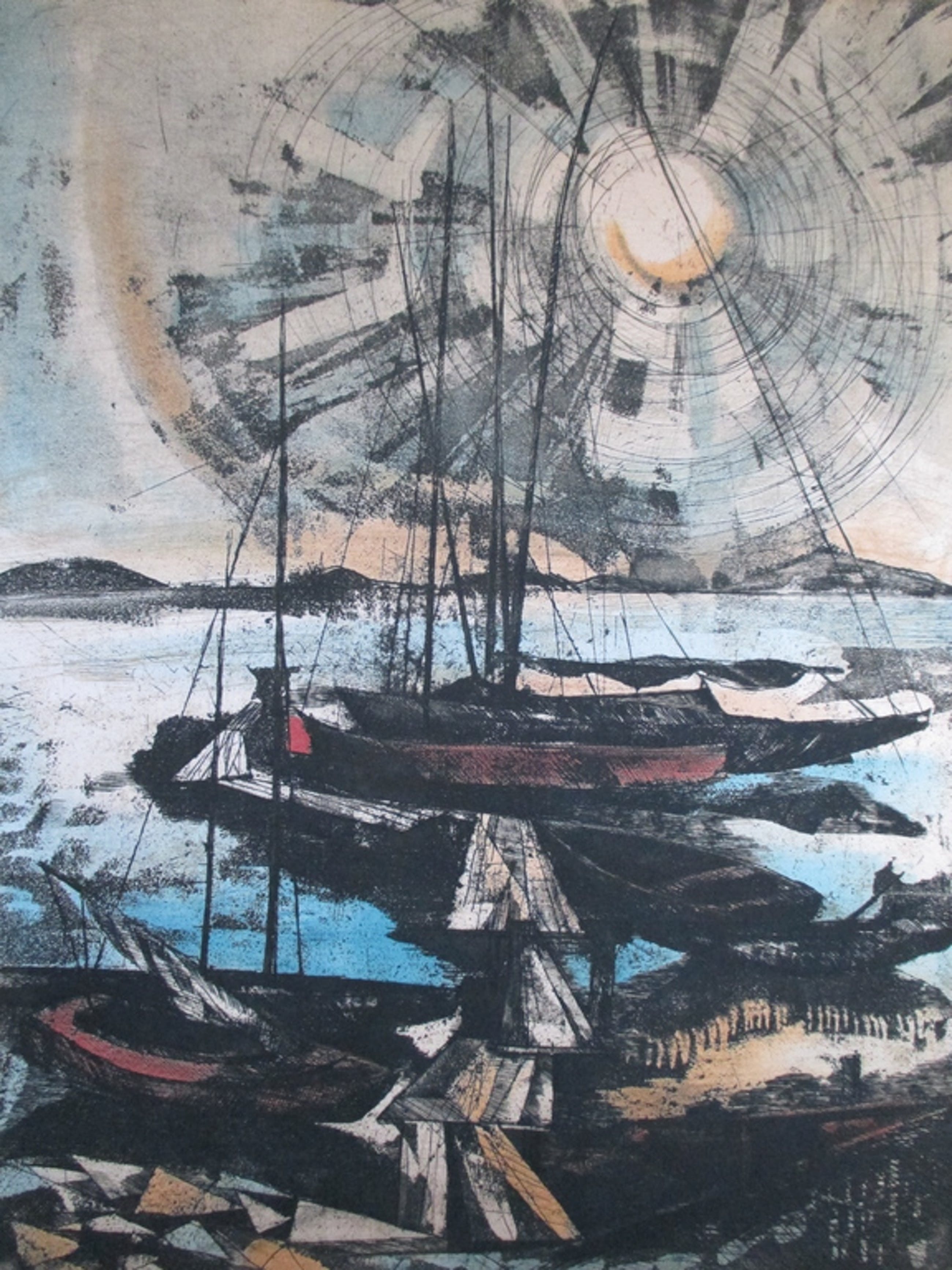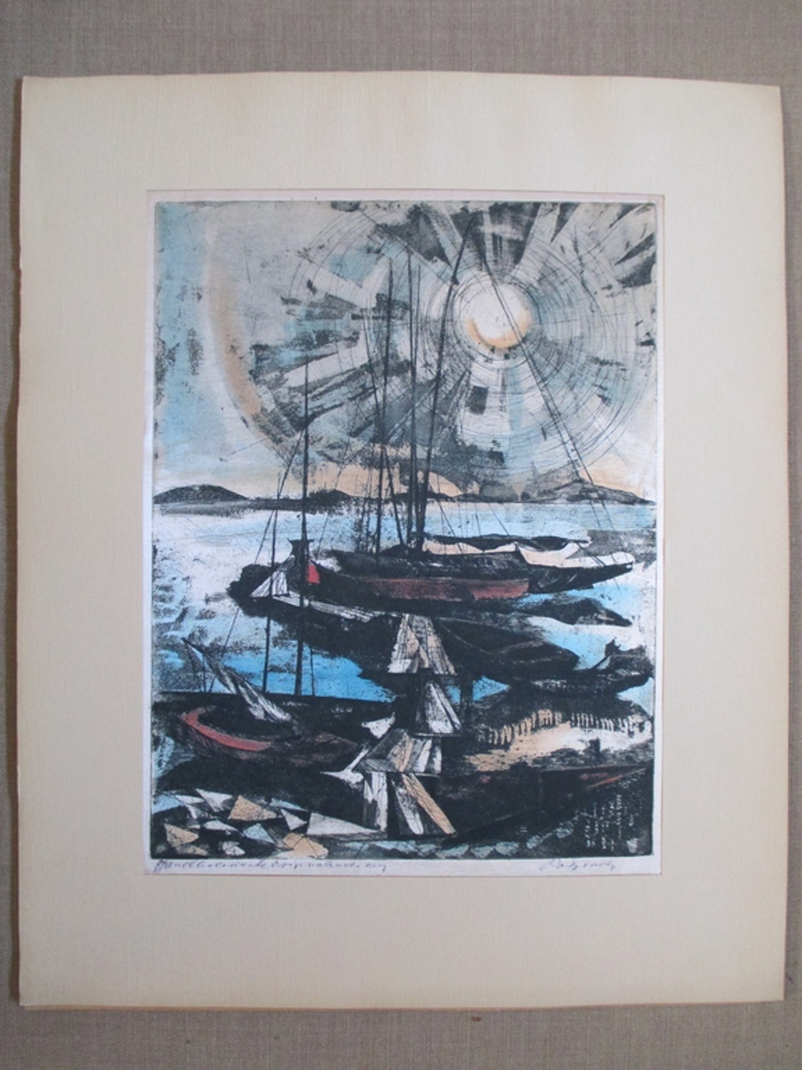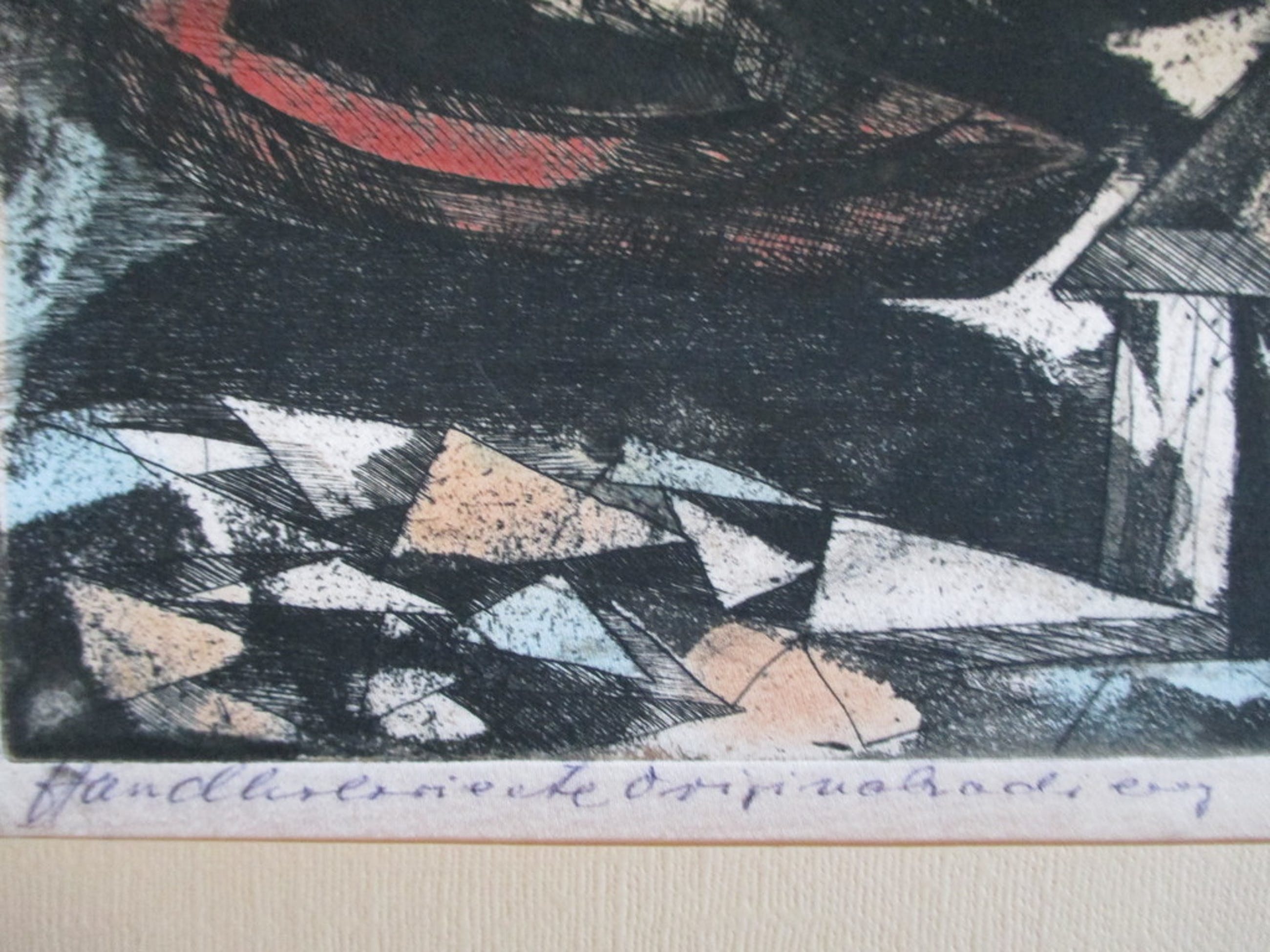 Handgekleurde ets gedrukt op zijde, r.o gesigneerd in pen. Geplaatst in passepartout, afm. 46x56, doek 34,5x44,5 cm.