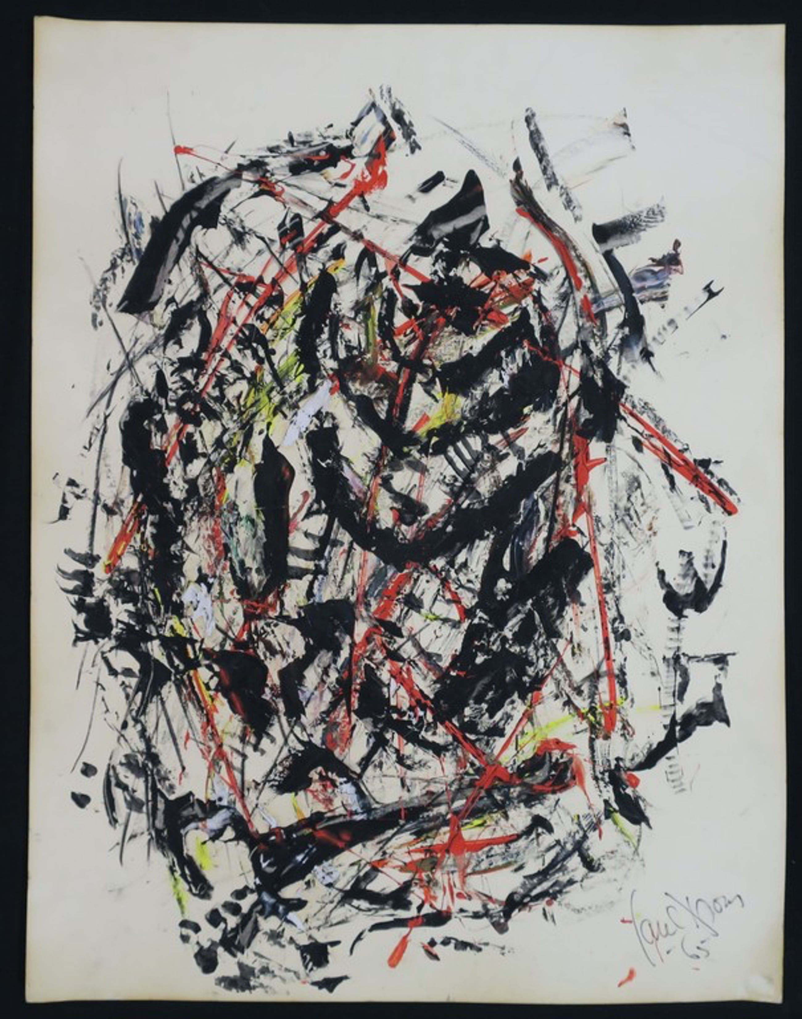 Sterk abstract werk op papier uit 1965 met een helaas voor ons onbekende signatuur